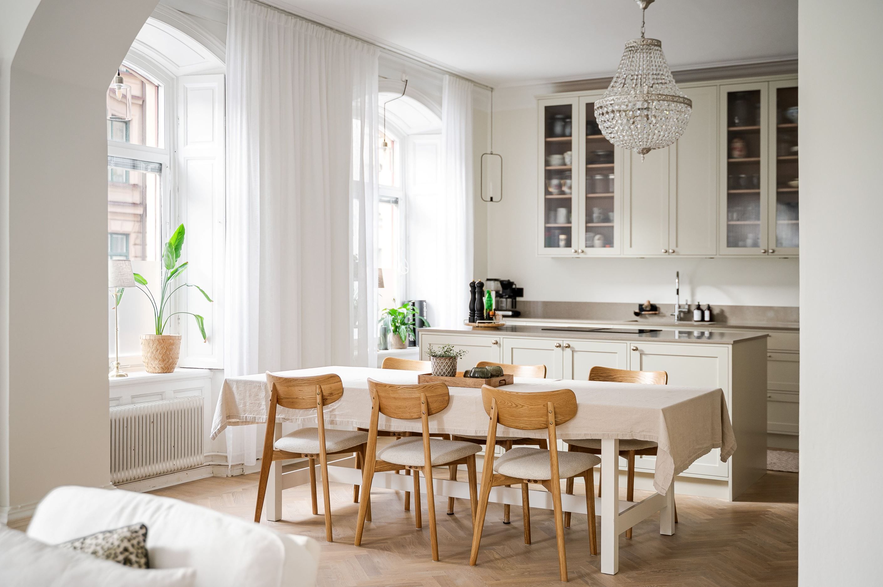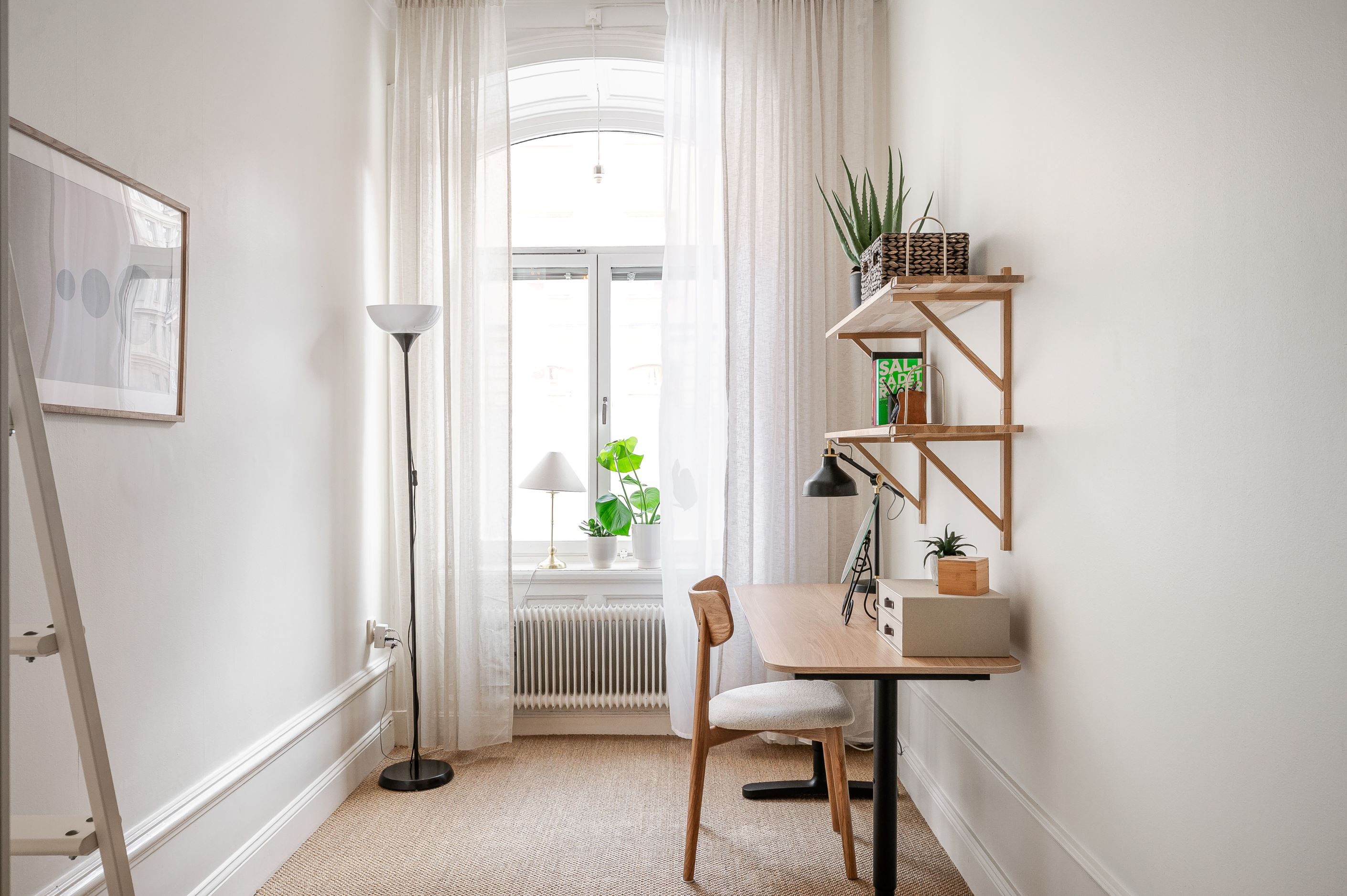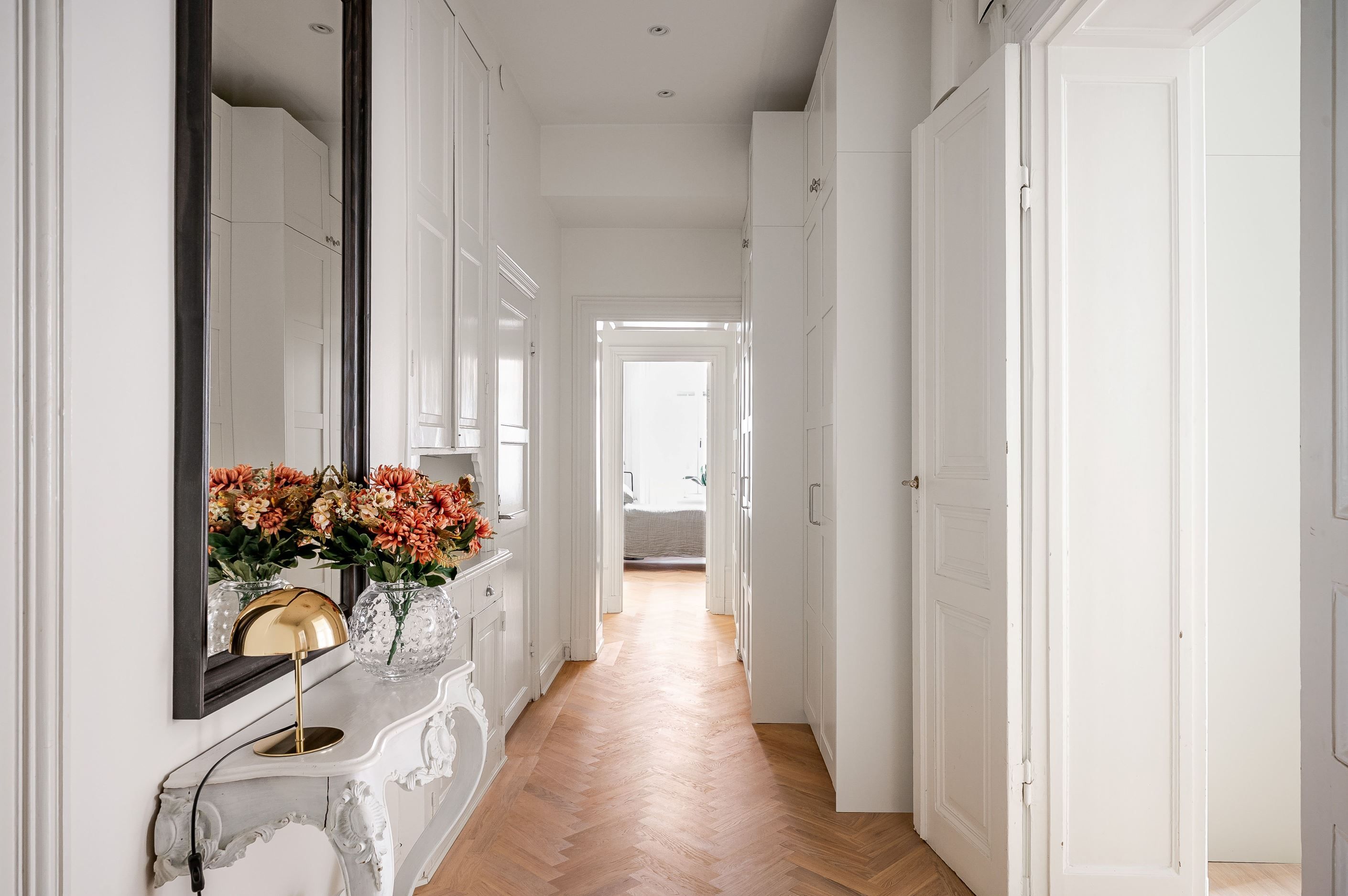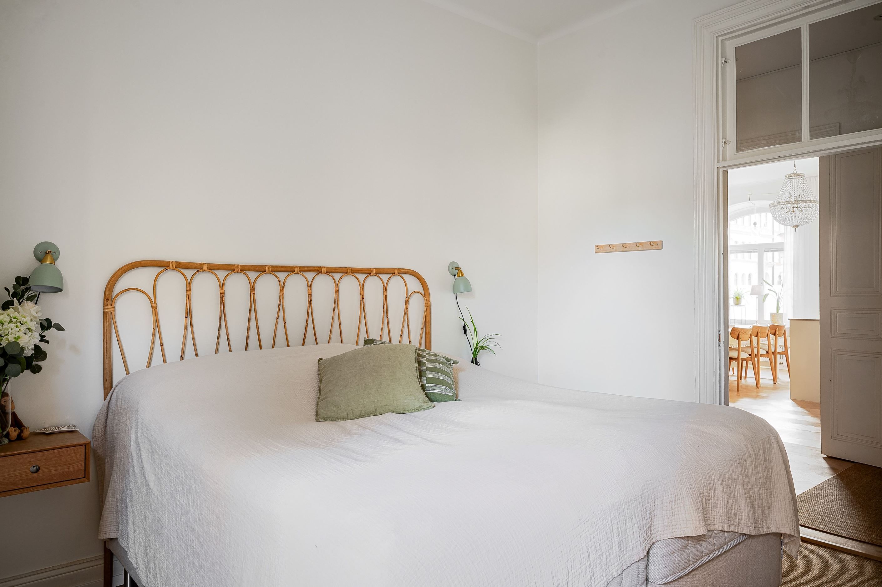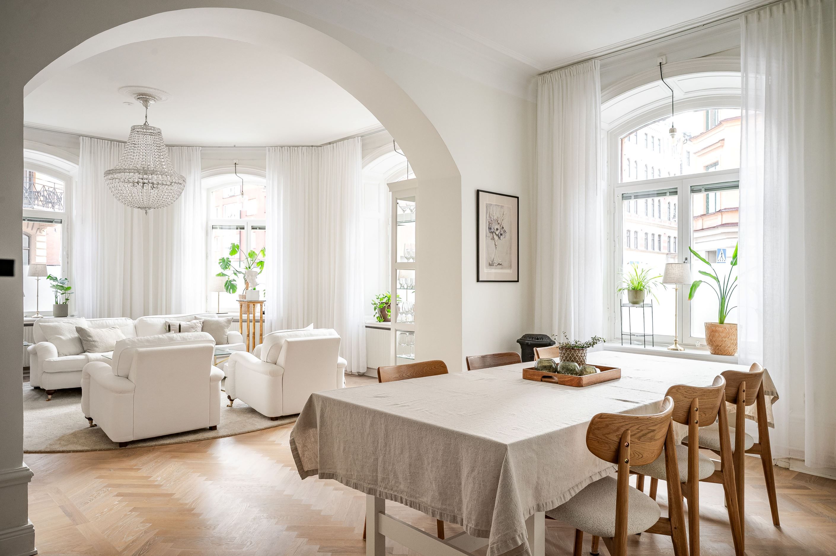Den luftiga känslan förstärks av vacker nylagd fiskbensparkett i större delen av lägenheten, och i utvalda delar bekväm heltäckningsmatta. Tidstypiska detaljer såsom takrosetter, spegeldörrar, djupa fönsternischer och stuckaturer knyter samman den klassiska stilen med dagens bekvämligheter. Våningen erbjuder en unik kombination av historisk charm och bekväm modern livsstil, där varje kvadratmeter präglas av stil, kvalitet och omsorg. Som en extra bonus har bostaden egen utgång till innergården – en grönskande oas som ger en sällsynt känsla av lugn mitt i stadens hjärta.