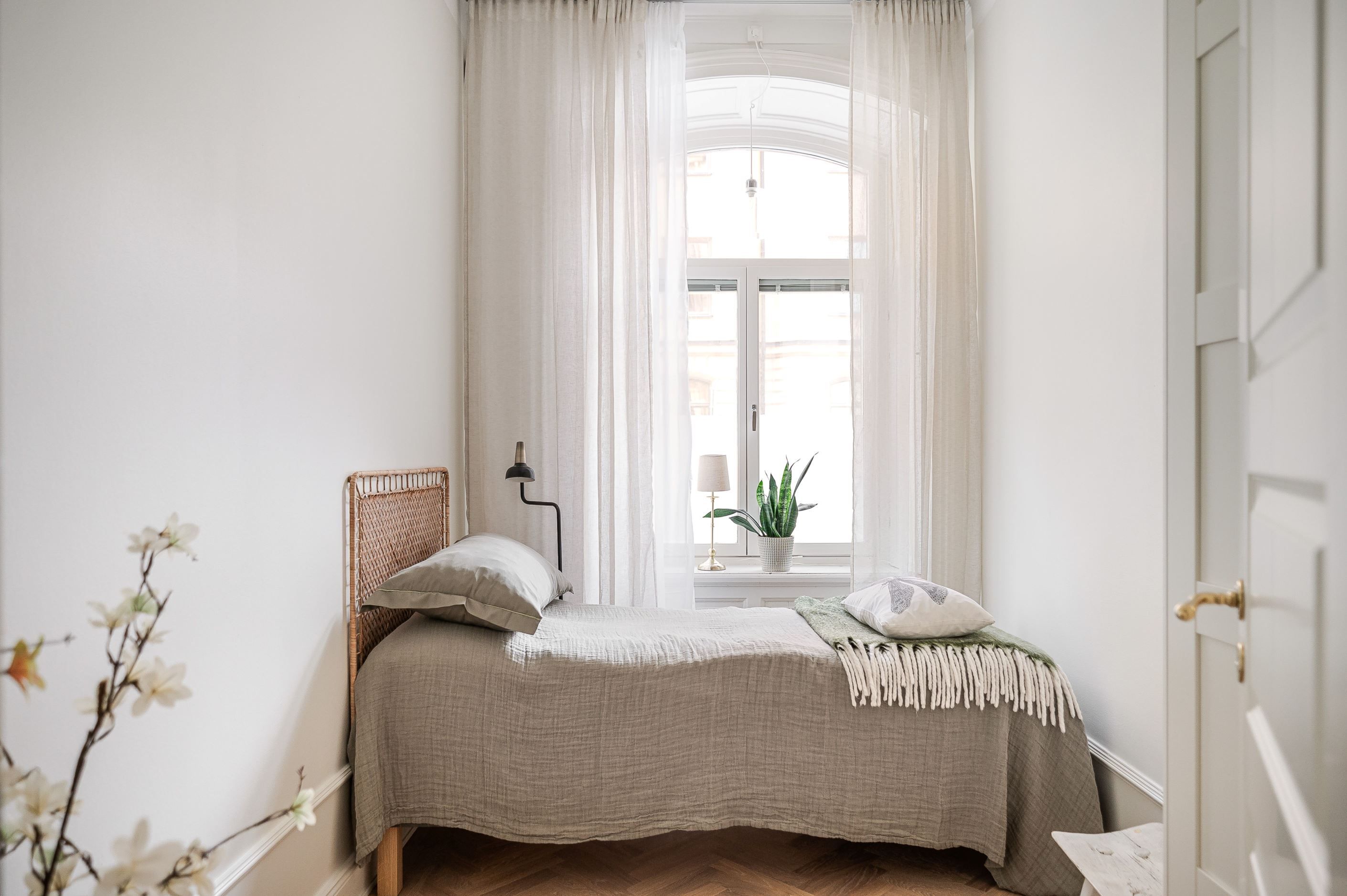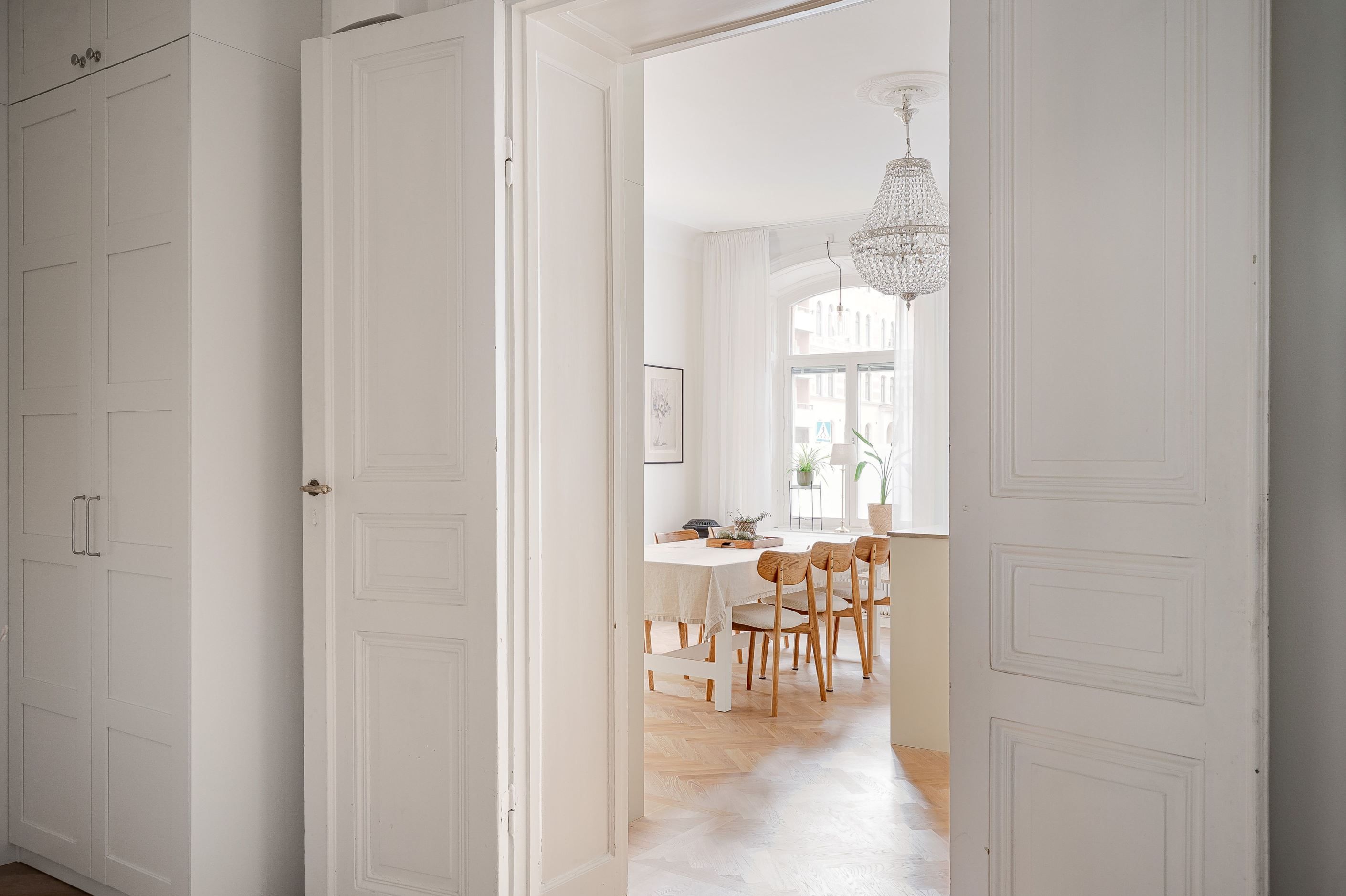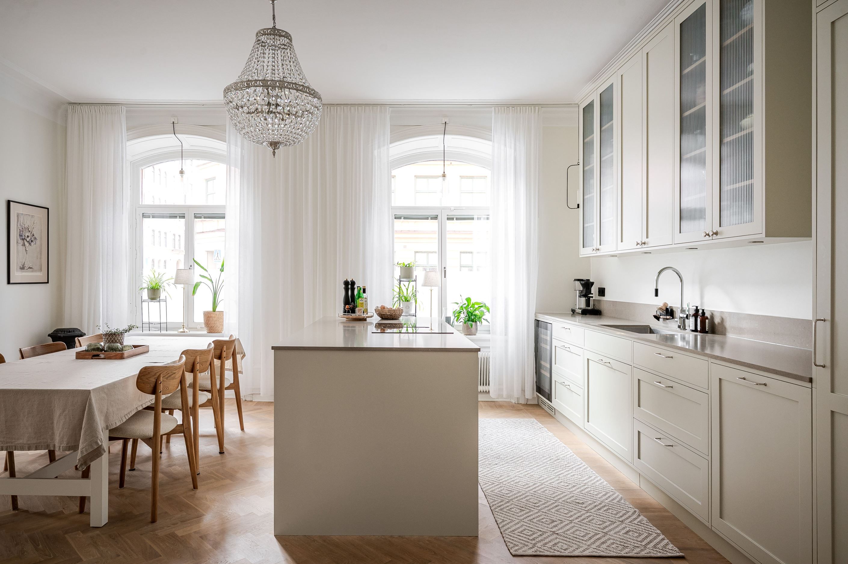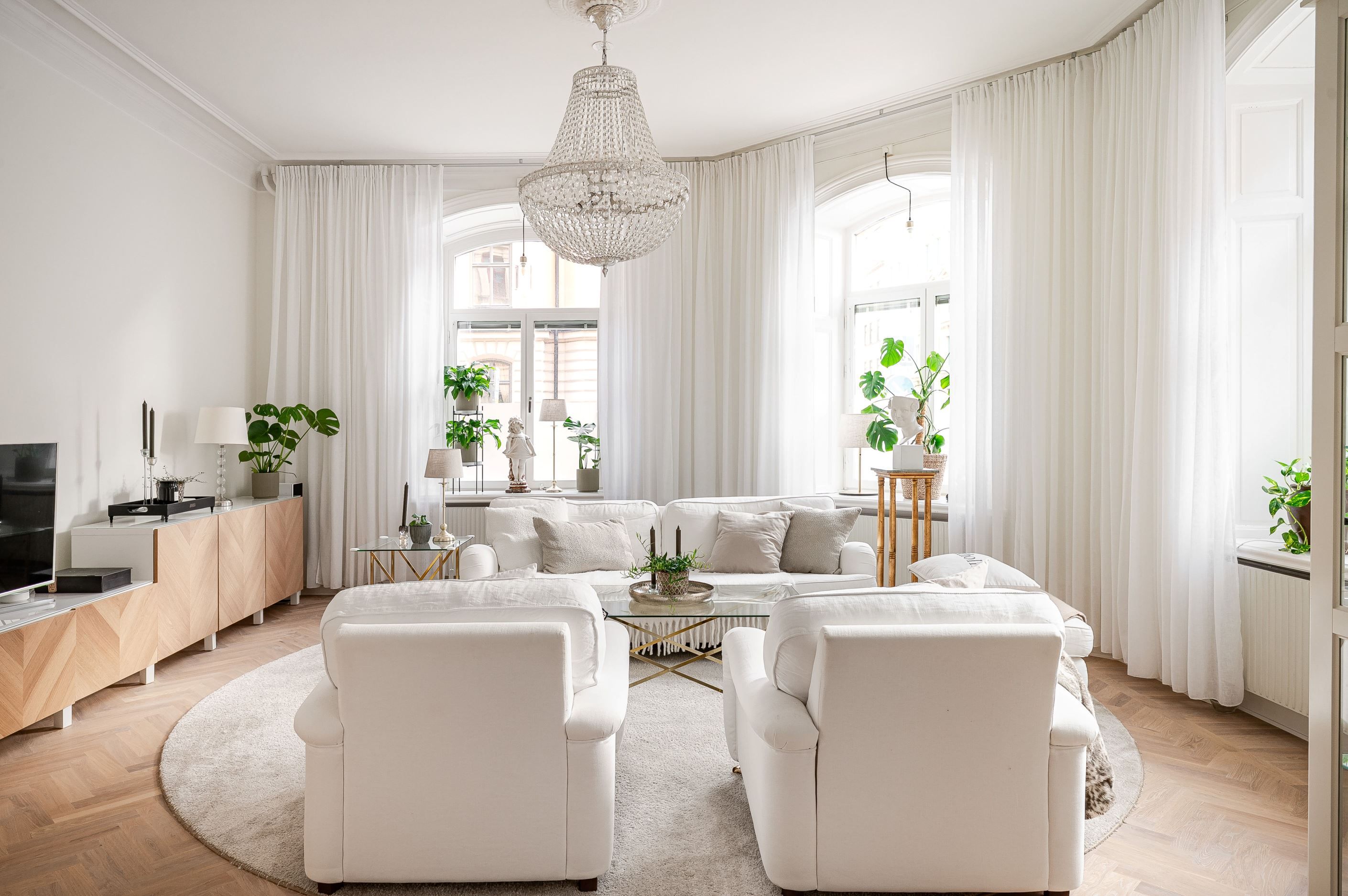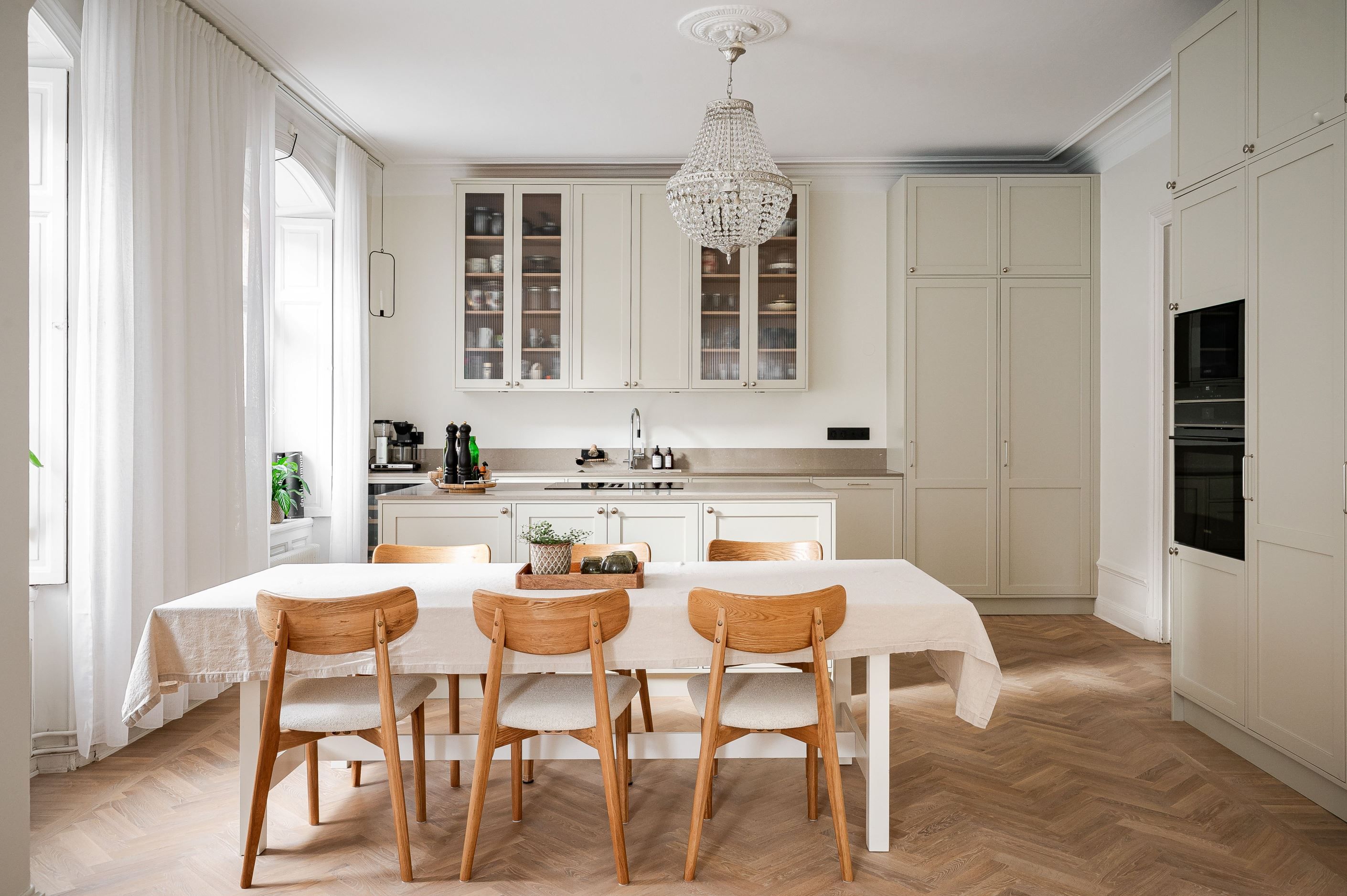 Den luftiga känslan förstärks av vacker nylagd fiskbensparkett i större delen av lägenheten, och i utvalda delar bekväm heltäckningsmatta. Tidstypiska detaljer såsom takrosetter, spegeldörrar, djupa fönsternischer och stuckaturer knyter samman den klassiska stilen med dagens bekvämligheter. Våningen erbjuder en unik kombination av historisk charm och bekväm modern livsstil, där varje kvadratmeter präglas av stil, kvalitet och omsorg. Som en extra bonus har bostaden egen utgång till innergården – en grönskande oas som ger en sällsynt känsla av lugn mitt i stadens hjärta.