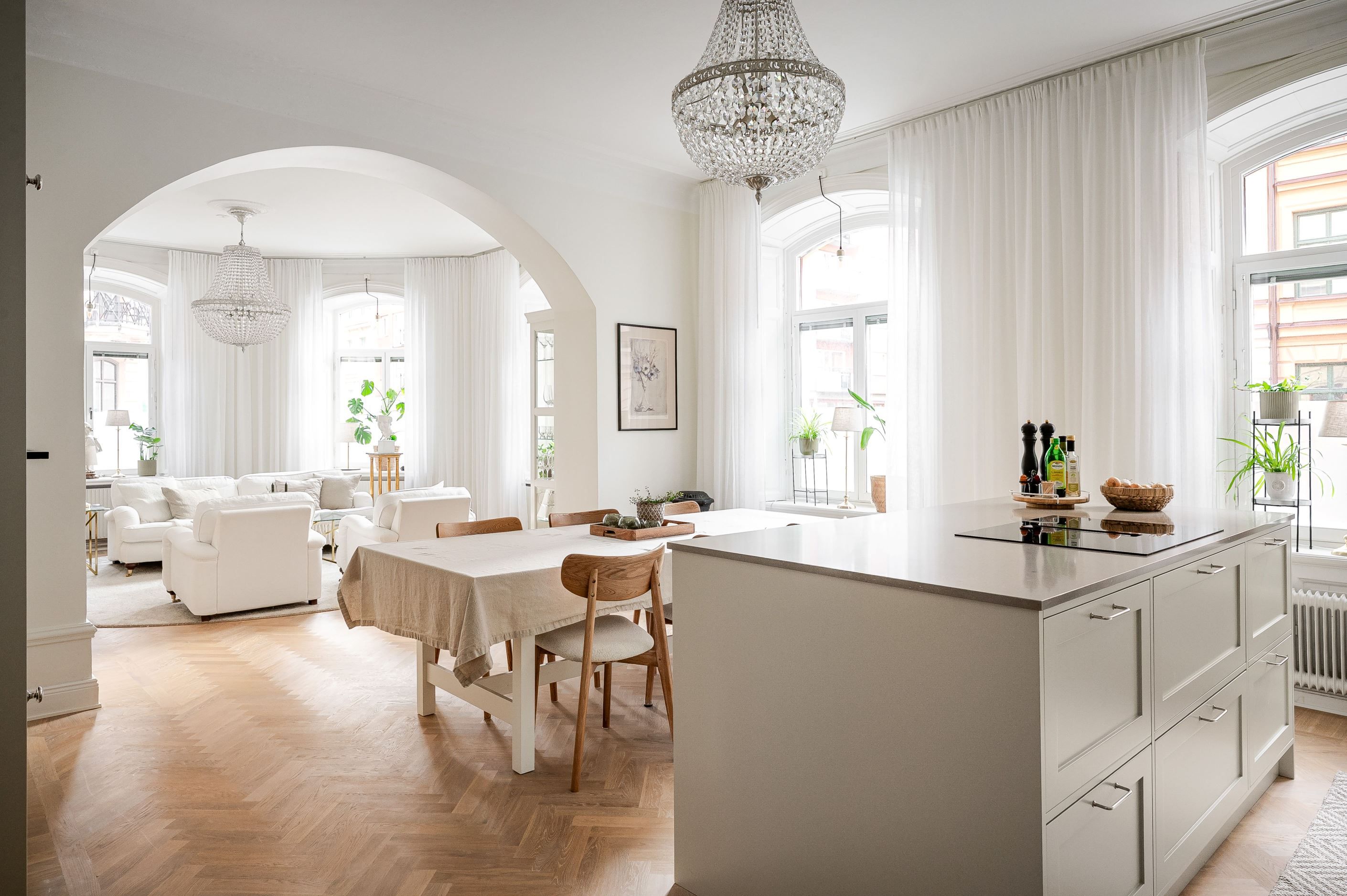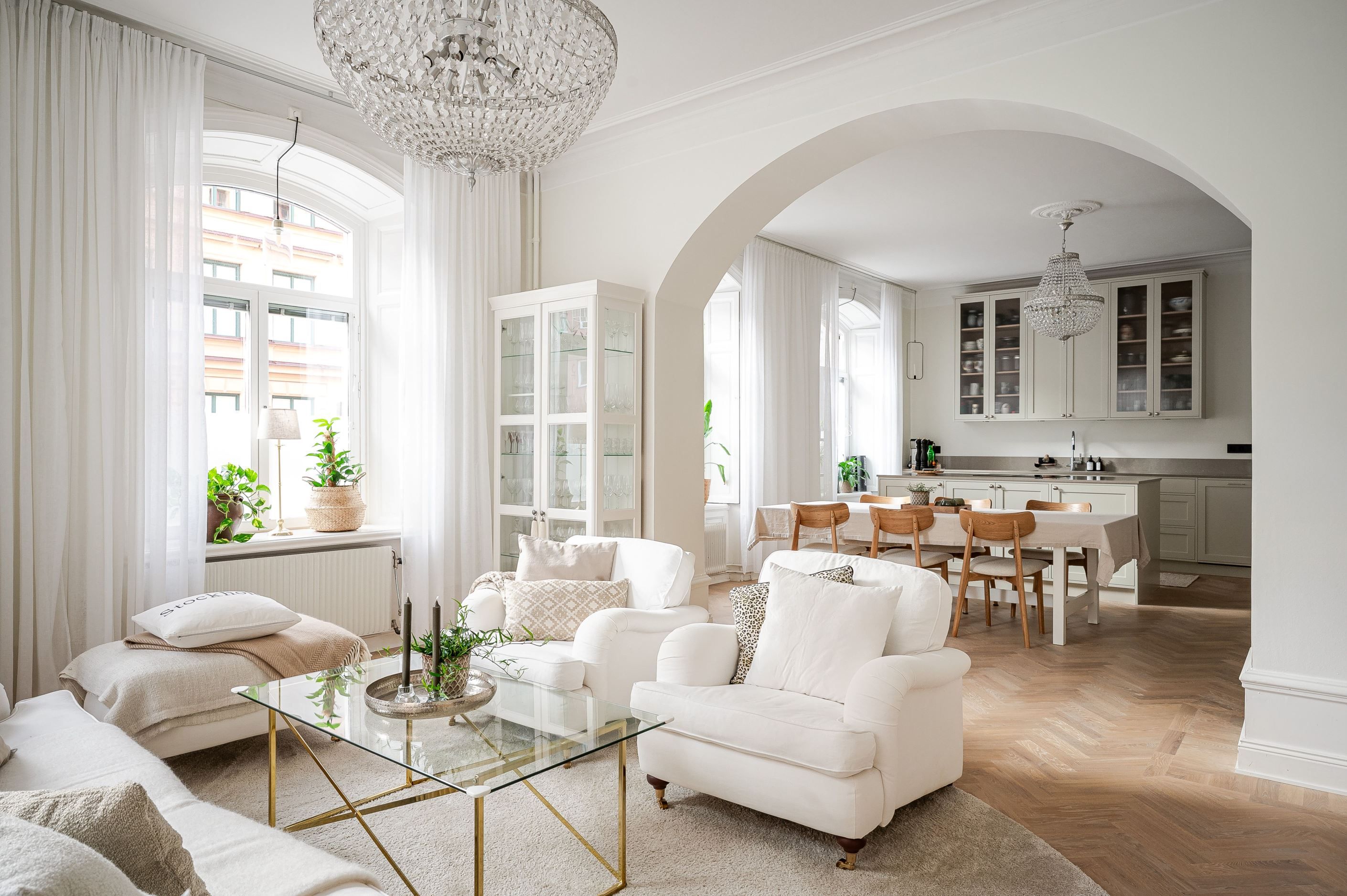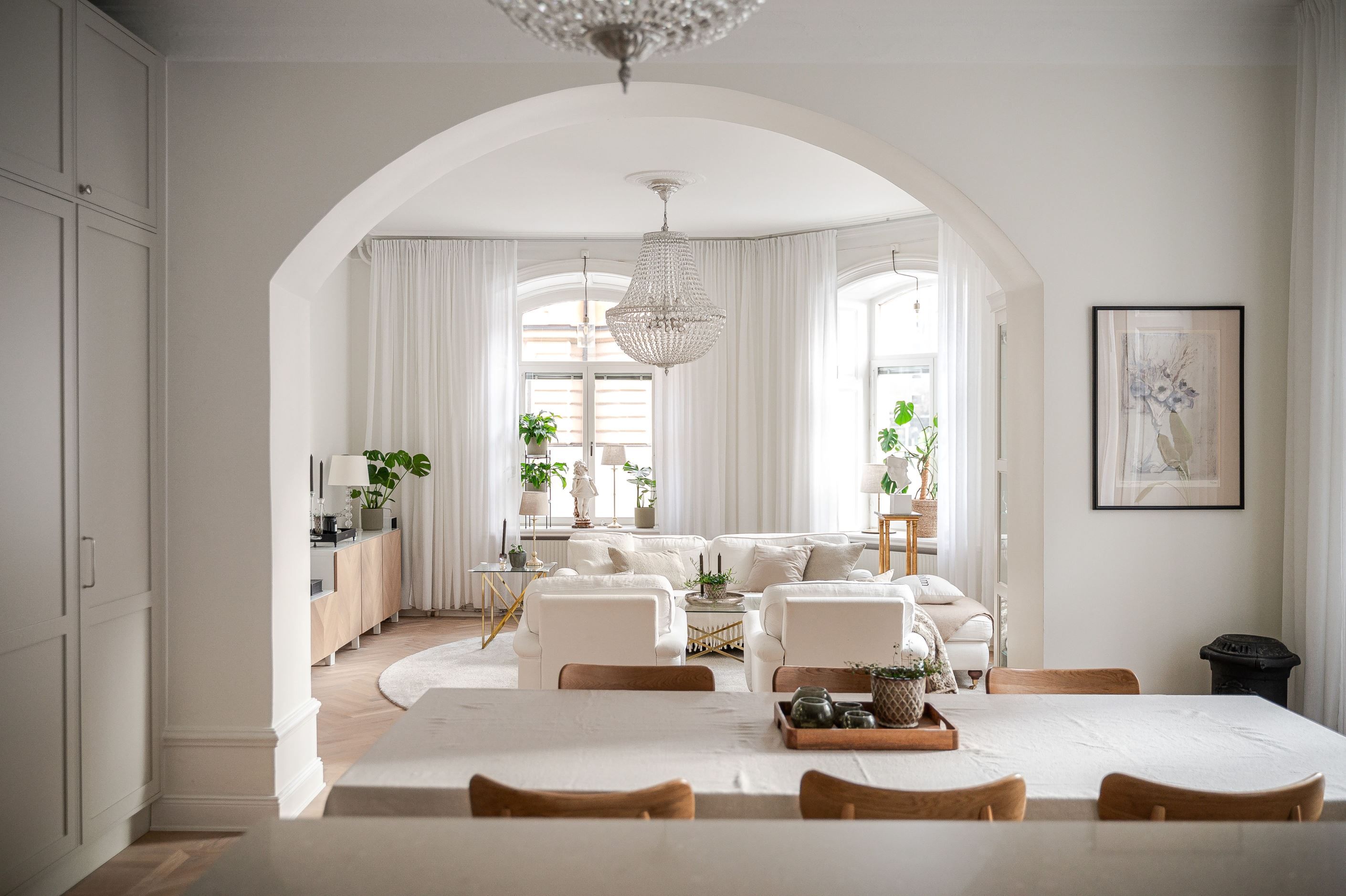 Med en generös takhöjd om 3,1 meter, stora fönsterpartier och en genomgående planlösning flödar bostaden i ljus och rymd. Den öppna planlösningen mellan kök och vardagsrum skapar en inbjudande och social atmosfär med plats för både avkoppling och umgänge – perfekt för såväl vardagsliv som middagsbjudningar.