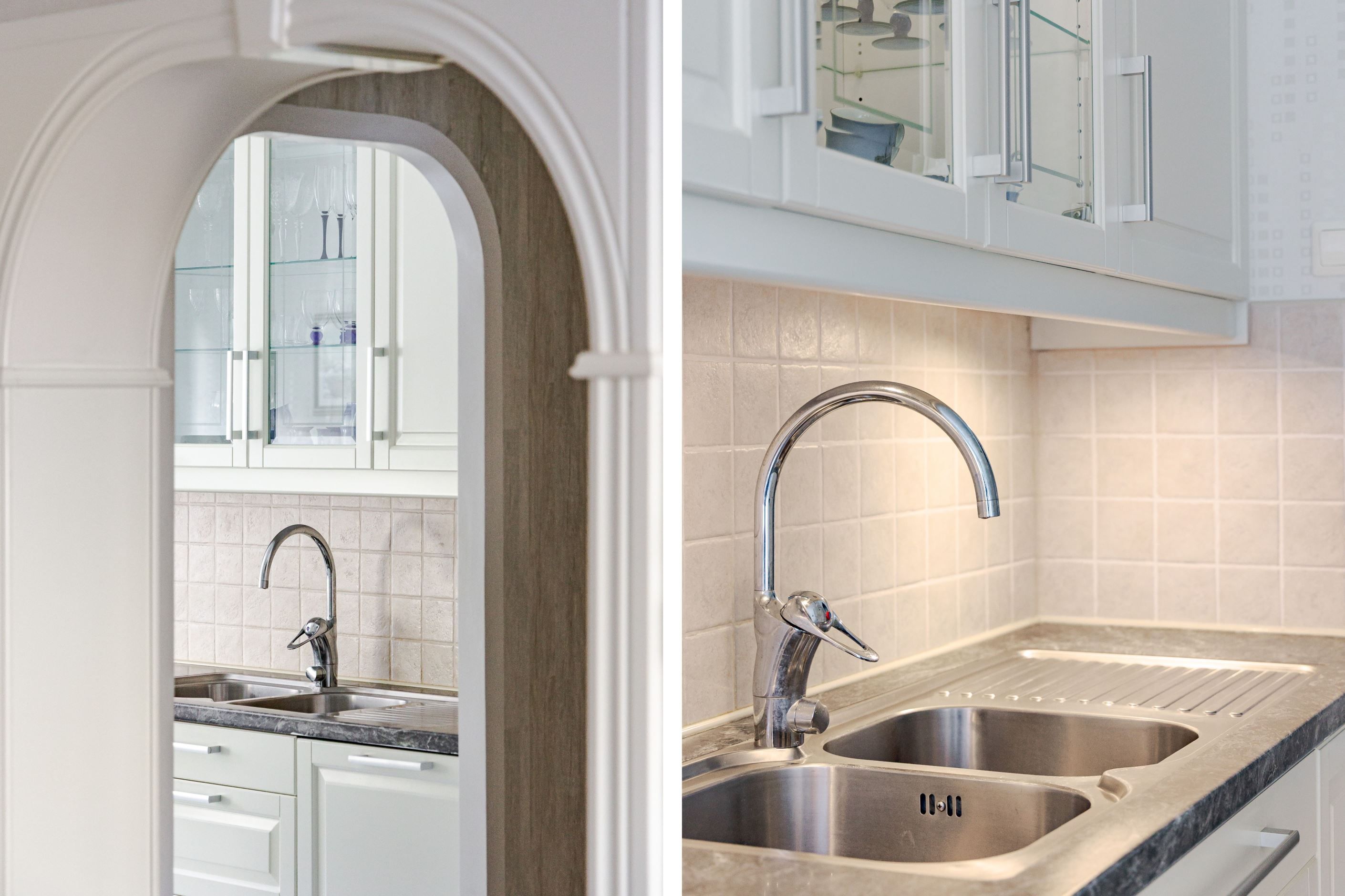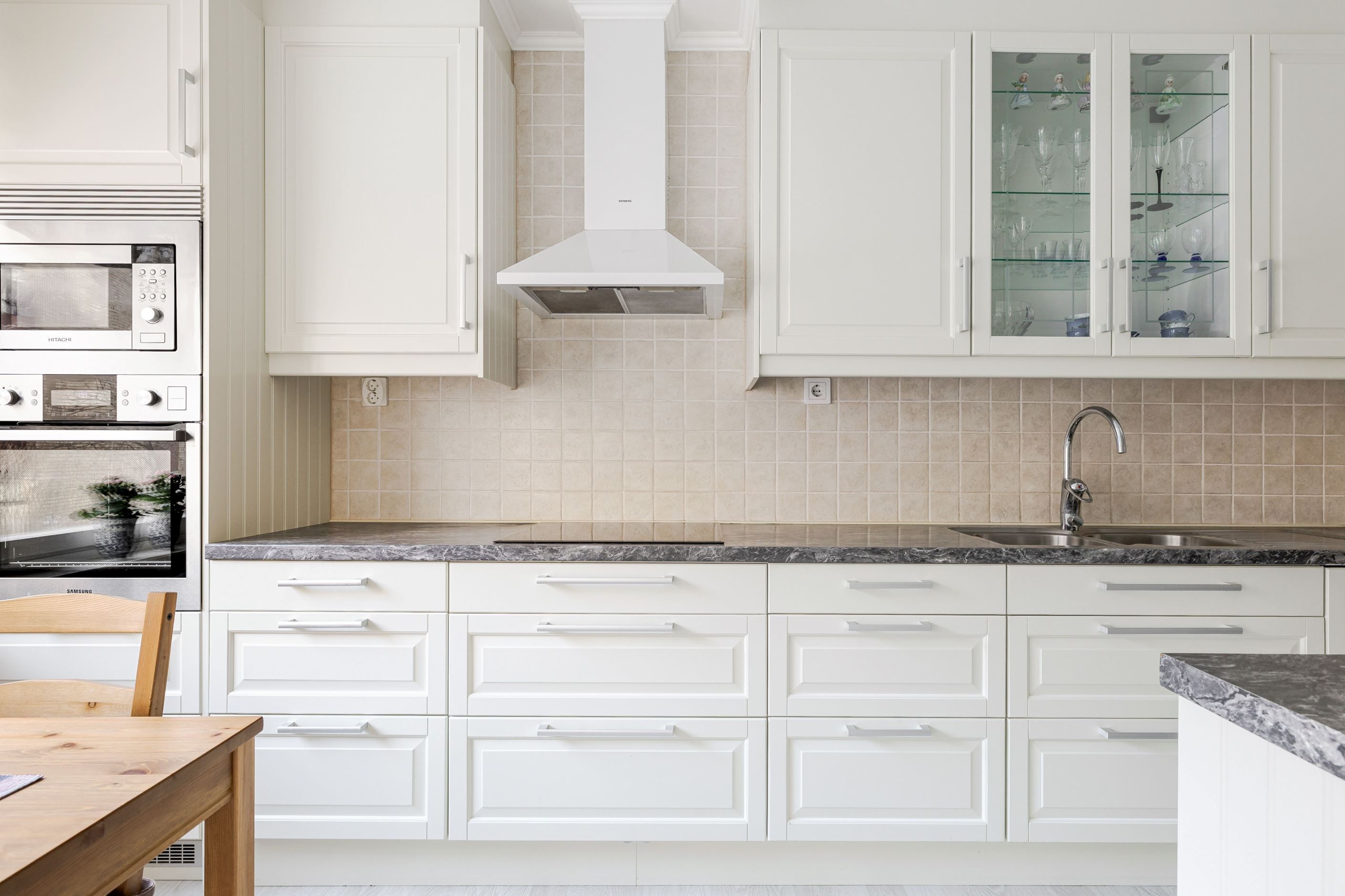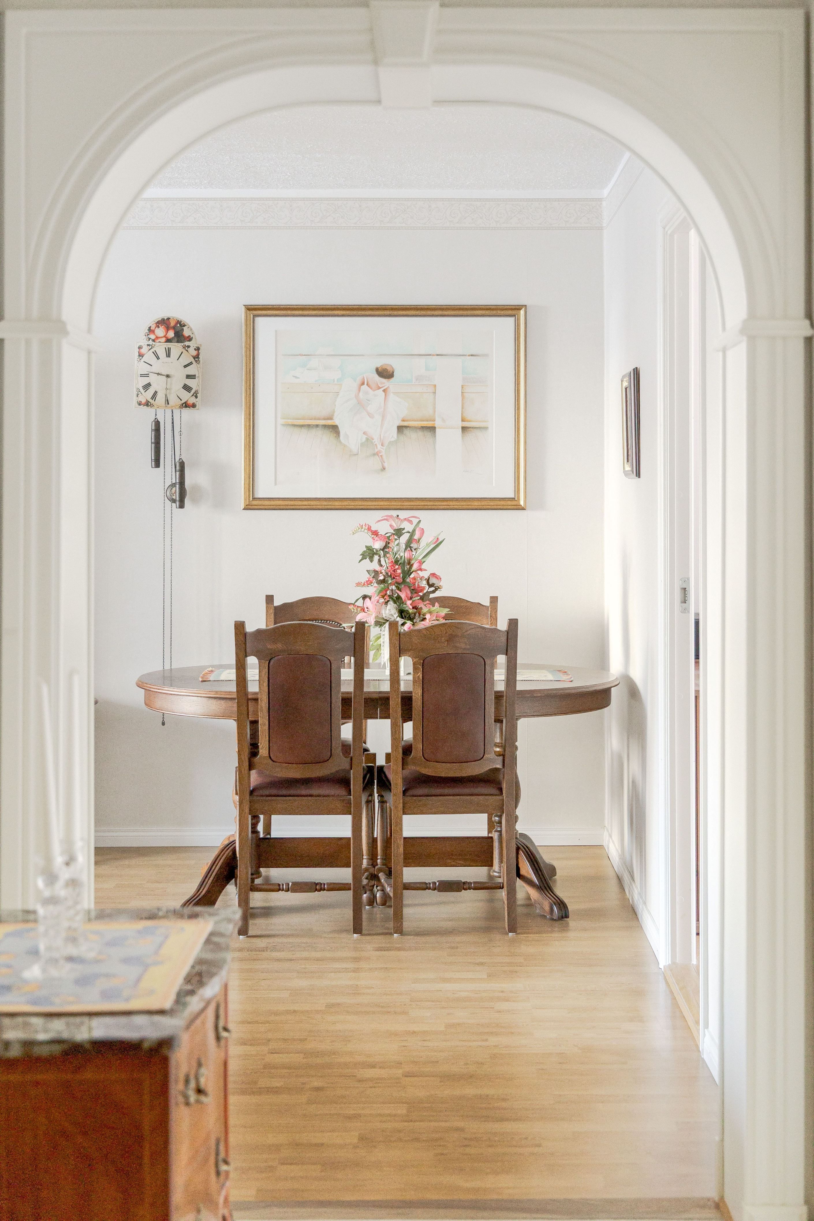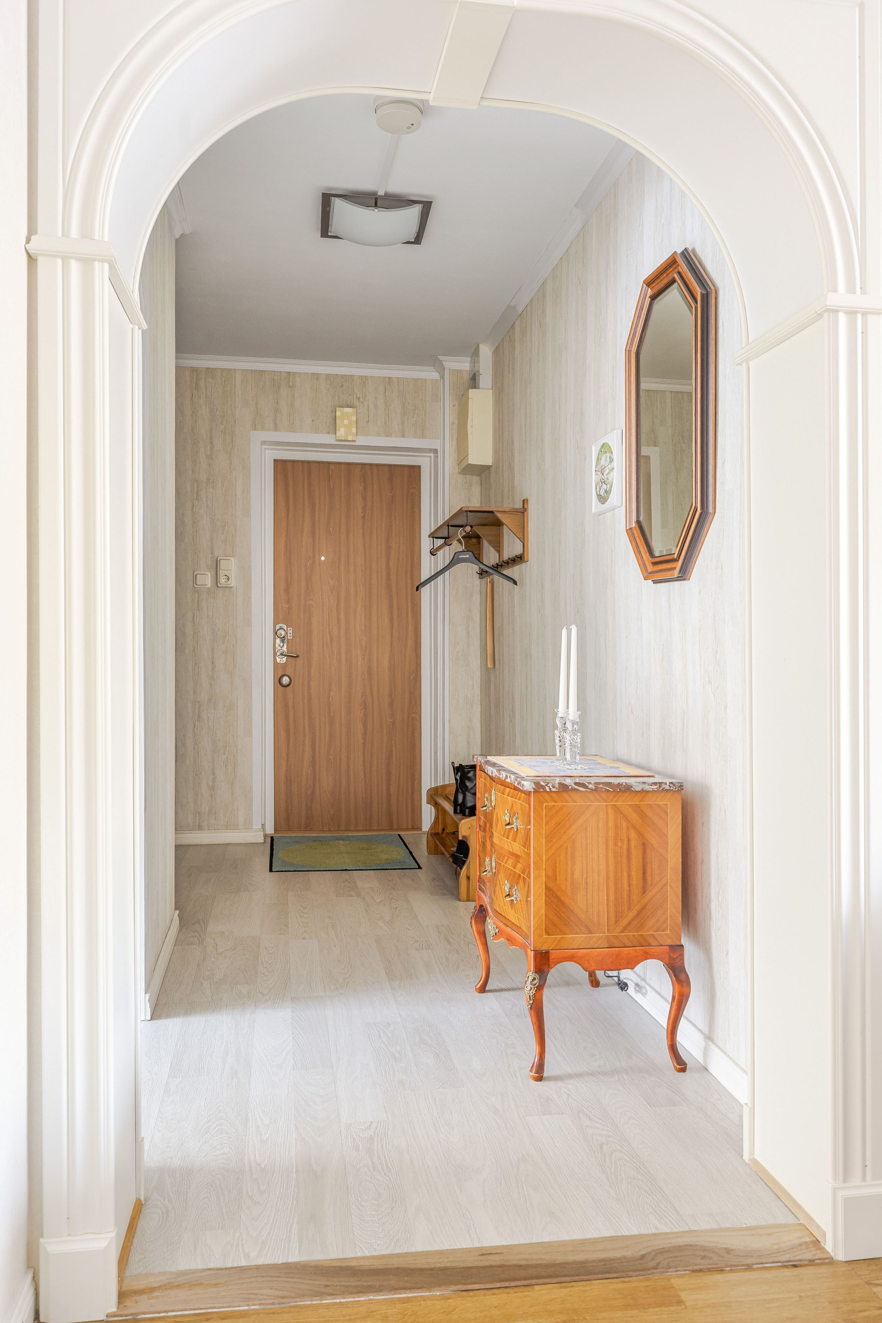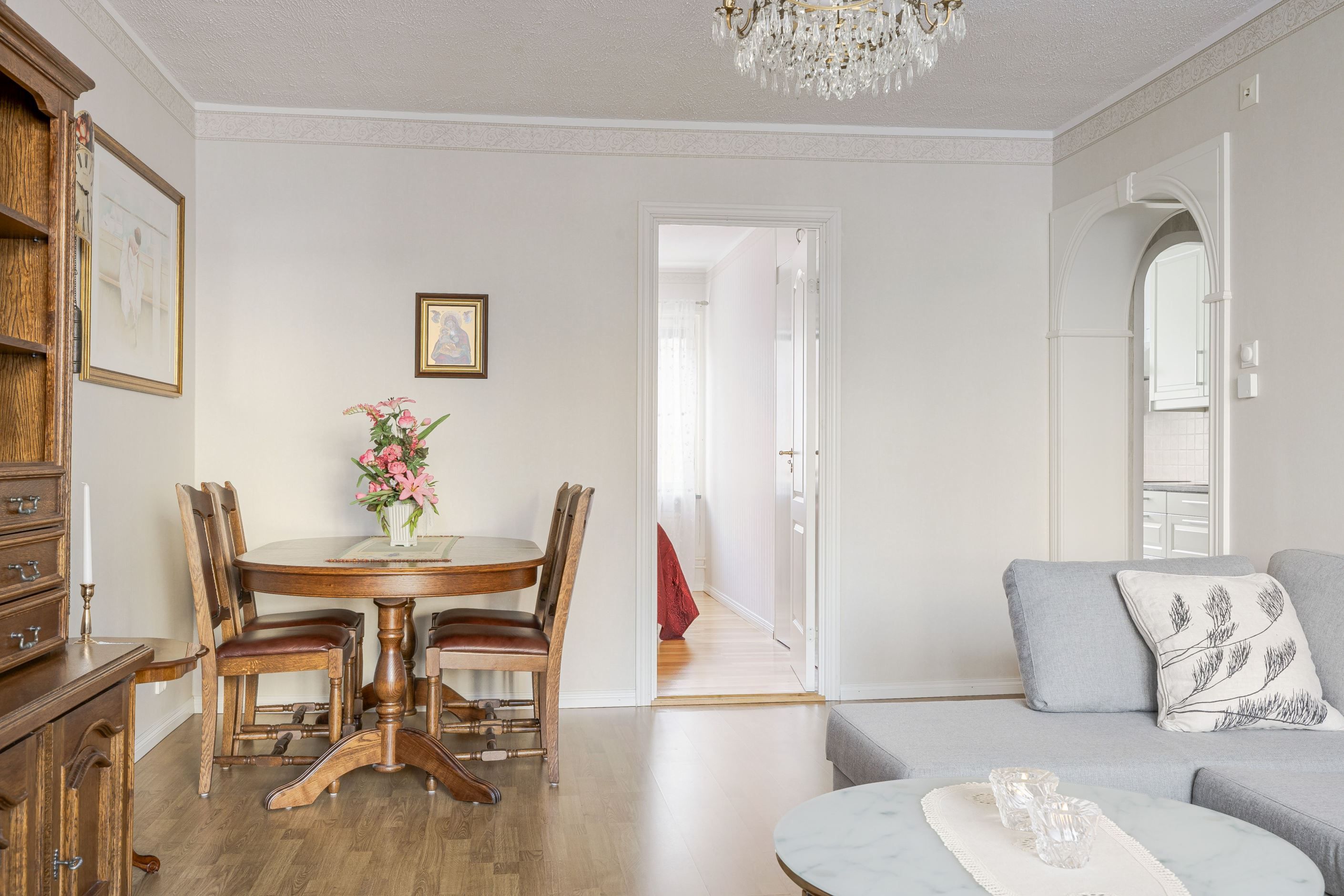Går du rakt fram från hallen öppnar bostaden upp sig på ett naturligt och inbjudande sätt. Till höger ligger köket som erbjuder gott om förvaring, bra arbetsytor samt plats för matbord. Här finns en trivsam miljö för både vardagsmiddagar och sociala tillställningar.