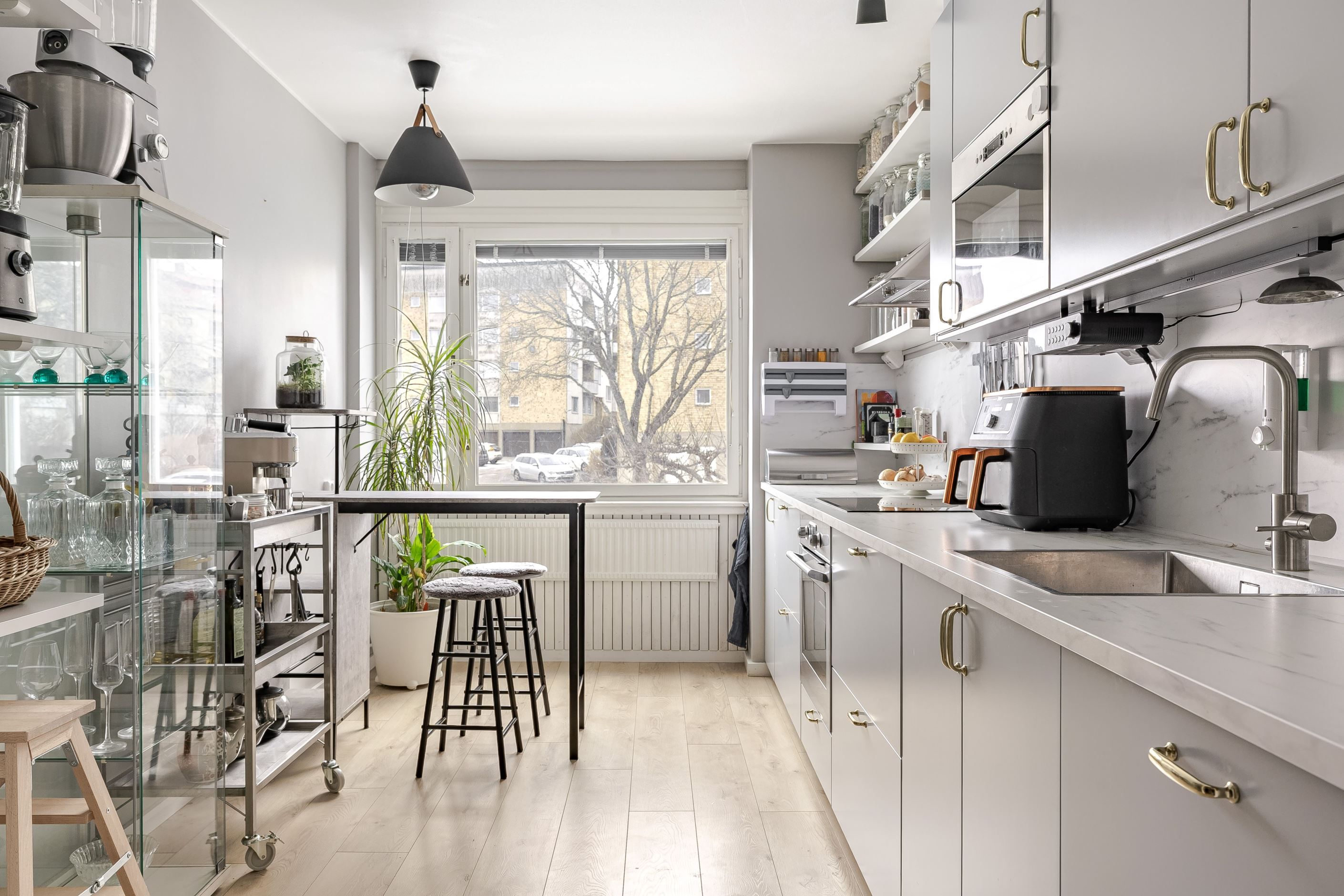 Lägenheten renoverades till stora delar stilfullt under 2022-2023. Det rymliga köket har full maskinell utrustning i rostfritt och gott om förvaringsutrymmen bakom fina grå köksluckor- och lådor samt en snyggt matchande bänkskiva. I köket finns plats för matbord.