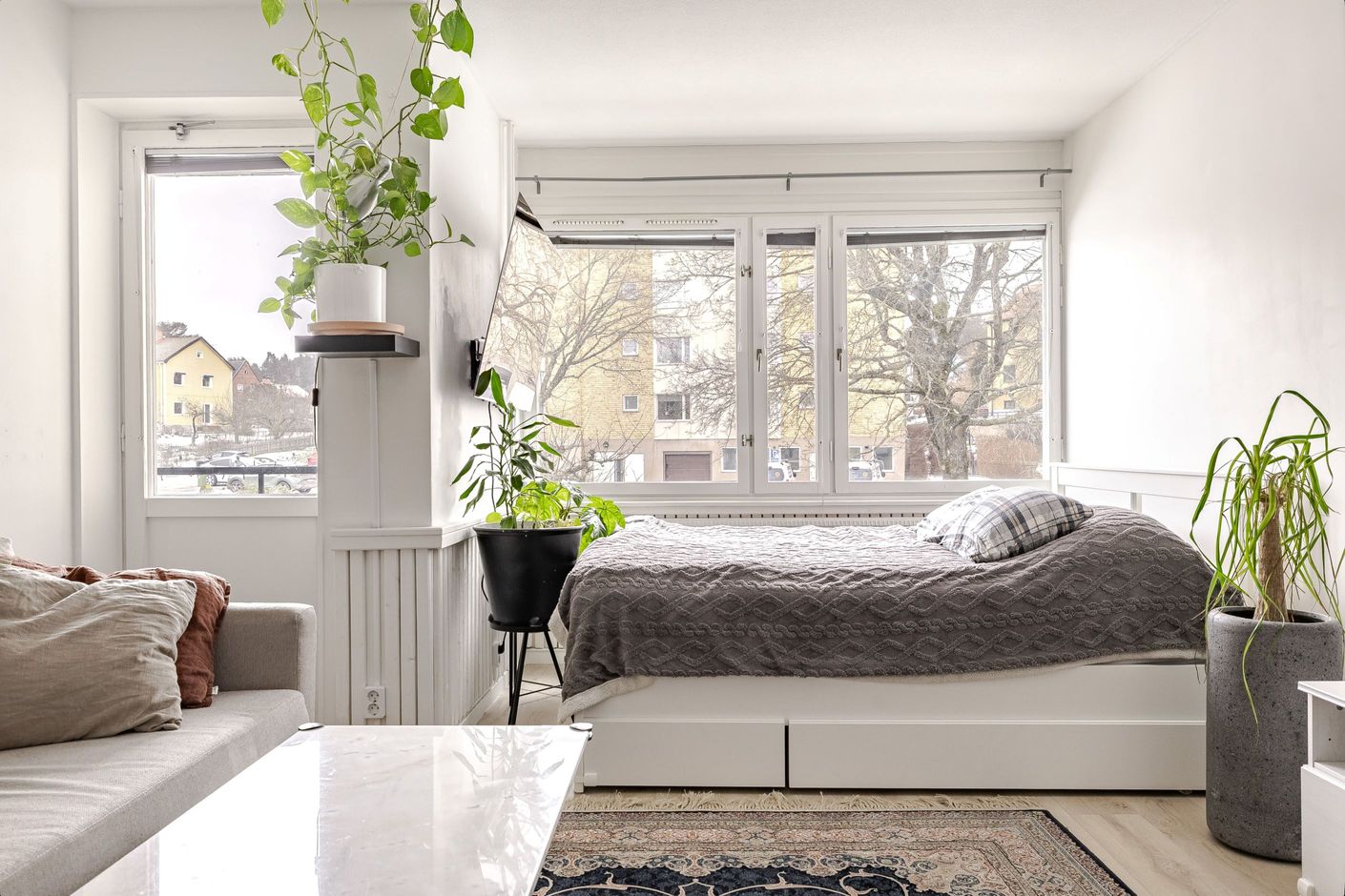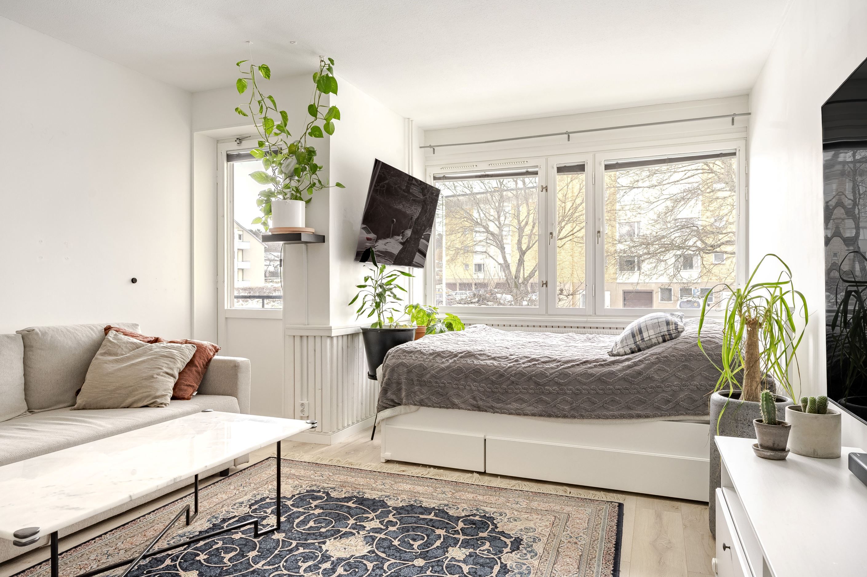 Det stora rummet erbjuder gott om plats för både säng, soffgrupp och matbord utan att kompromissa med rymden. Härifrån når du även bostadens balkong i soligt söderläge, en härlig förlängning av hemmet där du kan njuta av lugna stunder i solen.