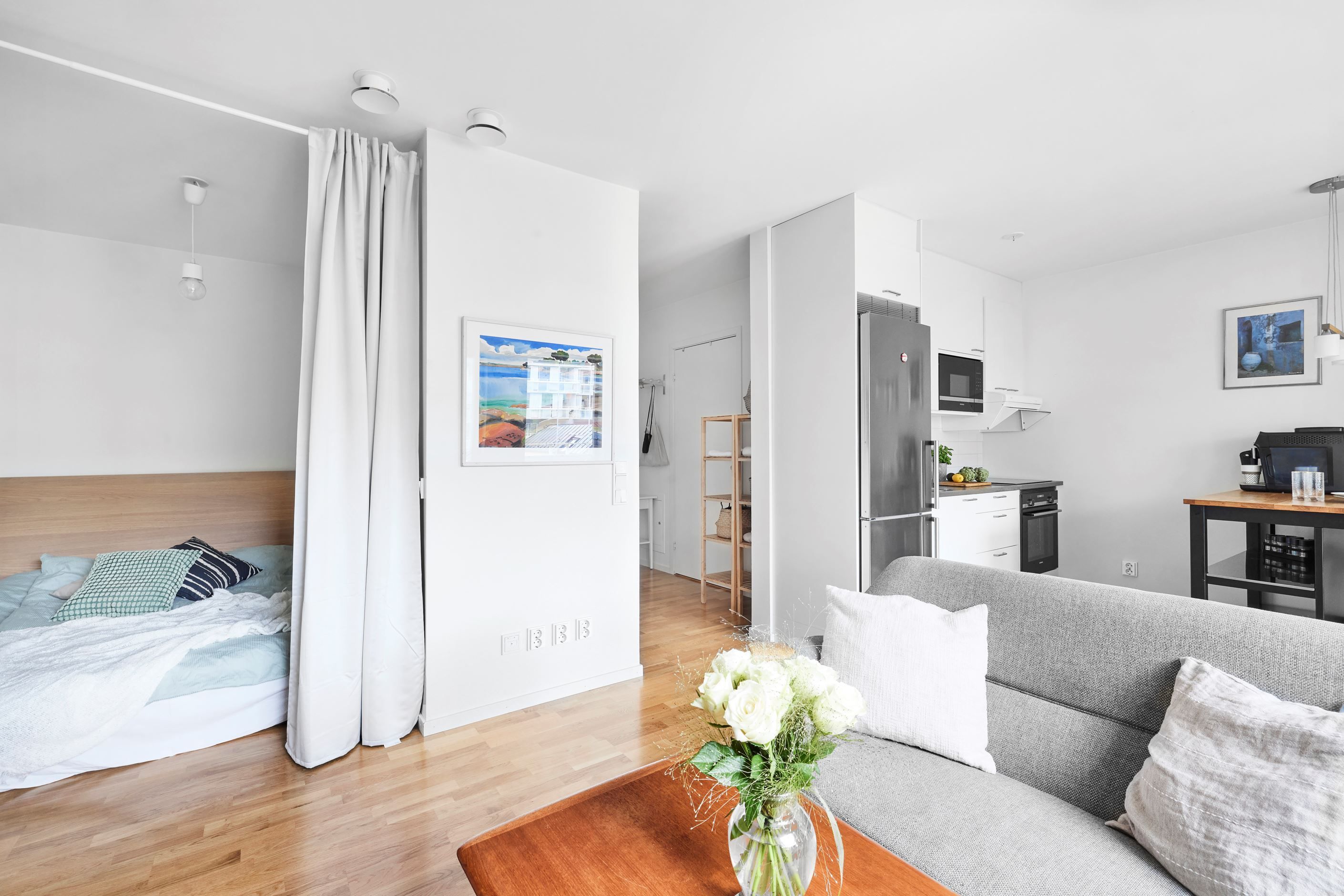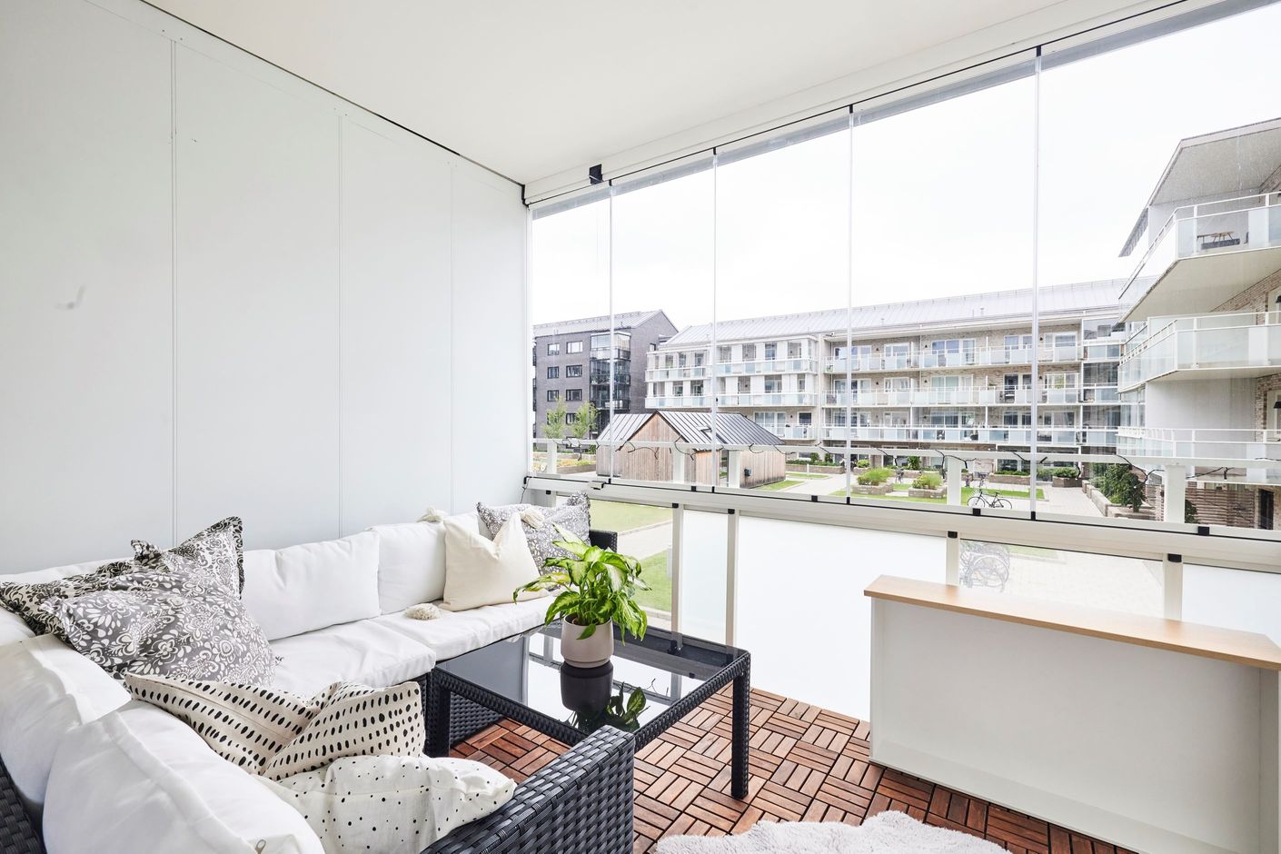 Interiört finner du materialval av hög kvalité, välplanerade ytor in i minsta detalj för praktiska lösningar och flexibel möblering. Hallen välkomnar med praktisk förvaring och ett härligt ljusinsläpp från de generösa fönsterpartier ut mot balkongen. Den inglasade balkongen sträcker sig nästan längs hela lägenheten och möjliggör ett härligt indoor outdoor living under sommarhalvåret. Väderstreck i rakt söder ger många soltimmar. Lägenhetens förlängning av både kök och vardagsrum som bjuder en öppen planlösning. Här erbjuds även sovalkov för att sovdelen ska bli mer privat. Badrummet är helkaklat i stilrena toner och bjuder en kombimaskin för att underlätta vardagen.