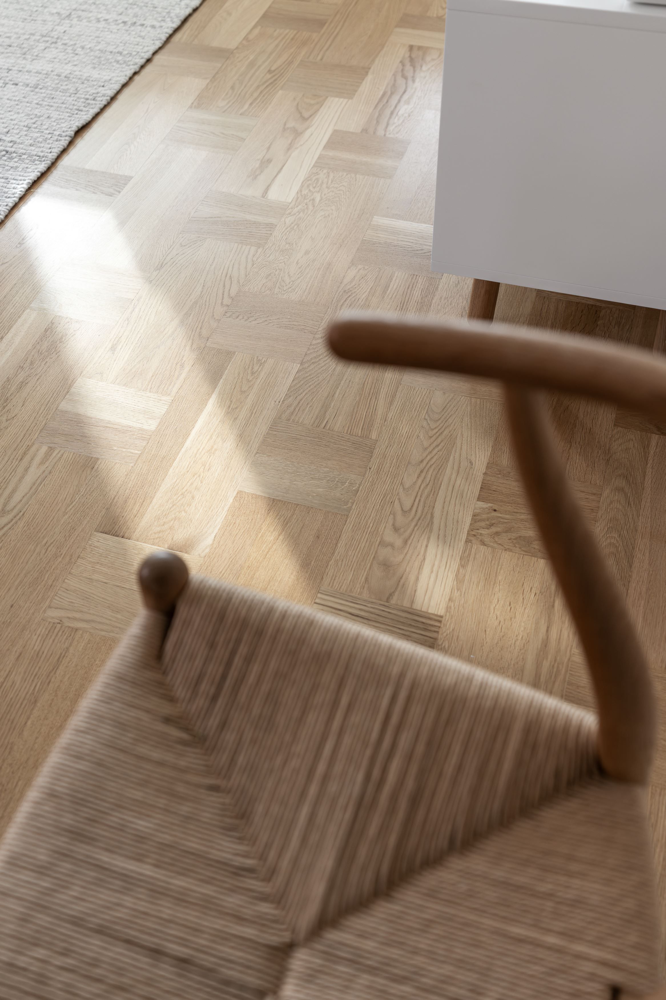 Vardagsrummet är rymligt med vackert golv och platsbyggda elementskydden som skapar karaktär och ramar in rummet på ett stilfullt sätt. Härifrån nås den stora inglasade balkongen – en riktig favoritplats! Balkongen vätter mot den lugna innergården och blir som ett extra rum under stora delar av året.