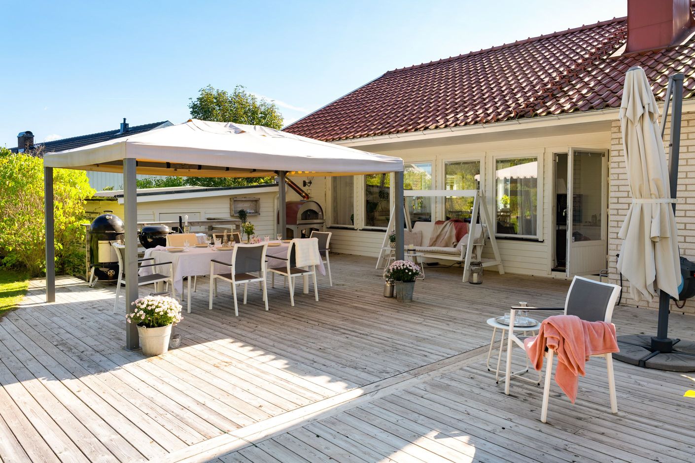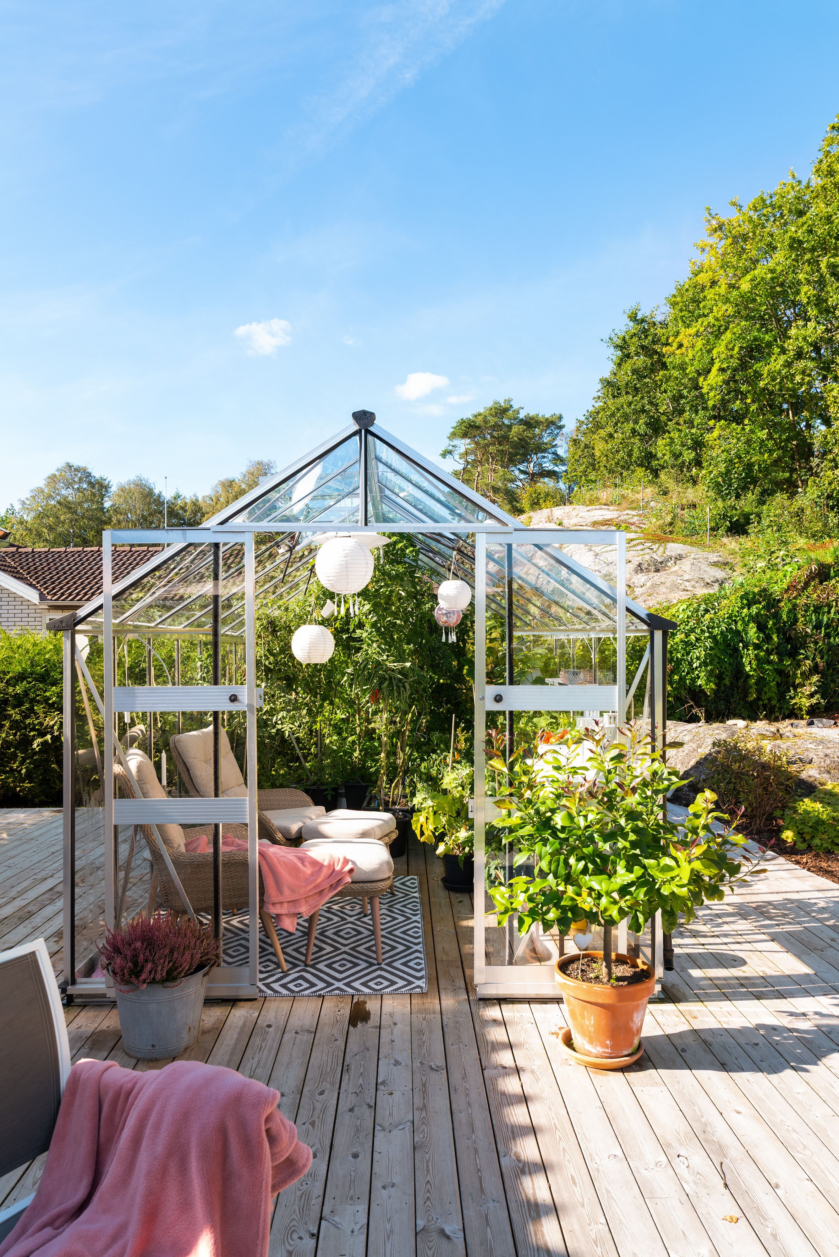 Tomten är lagom stor och lättskött, med plats för både lek, odling och lata sommardagar på altanen. Här kan barnen leka fritt medan de vuxna njuter av lugnet och solen.