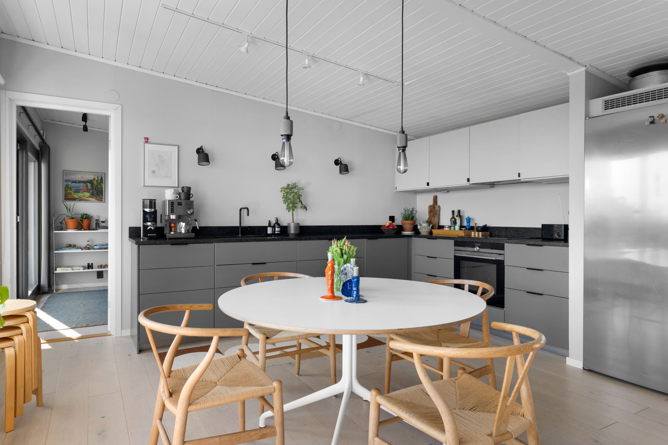 Bostaden om 76 kvm är smakfullt och modernt utformad med genomgående vackra trägolv som skapar en varm och enhetlig känsla. Här finns tre sovrum, ett inbjudande vardagsrum med kamin samt ett kök med plats för matgrupp och utgång till balkong – en naturlig plats att njuta av utsikten och omgivningarna. Vid entrén möts du av en generös altan som förstärker husets sociala och avslappnade karaktär. Badrummet är helkaklat och utrustat med golvvärme.