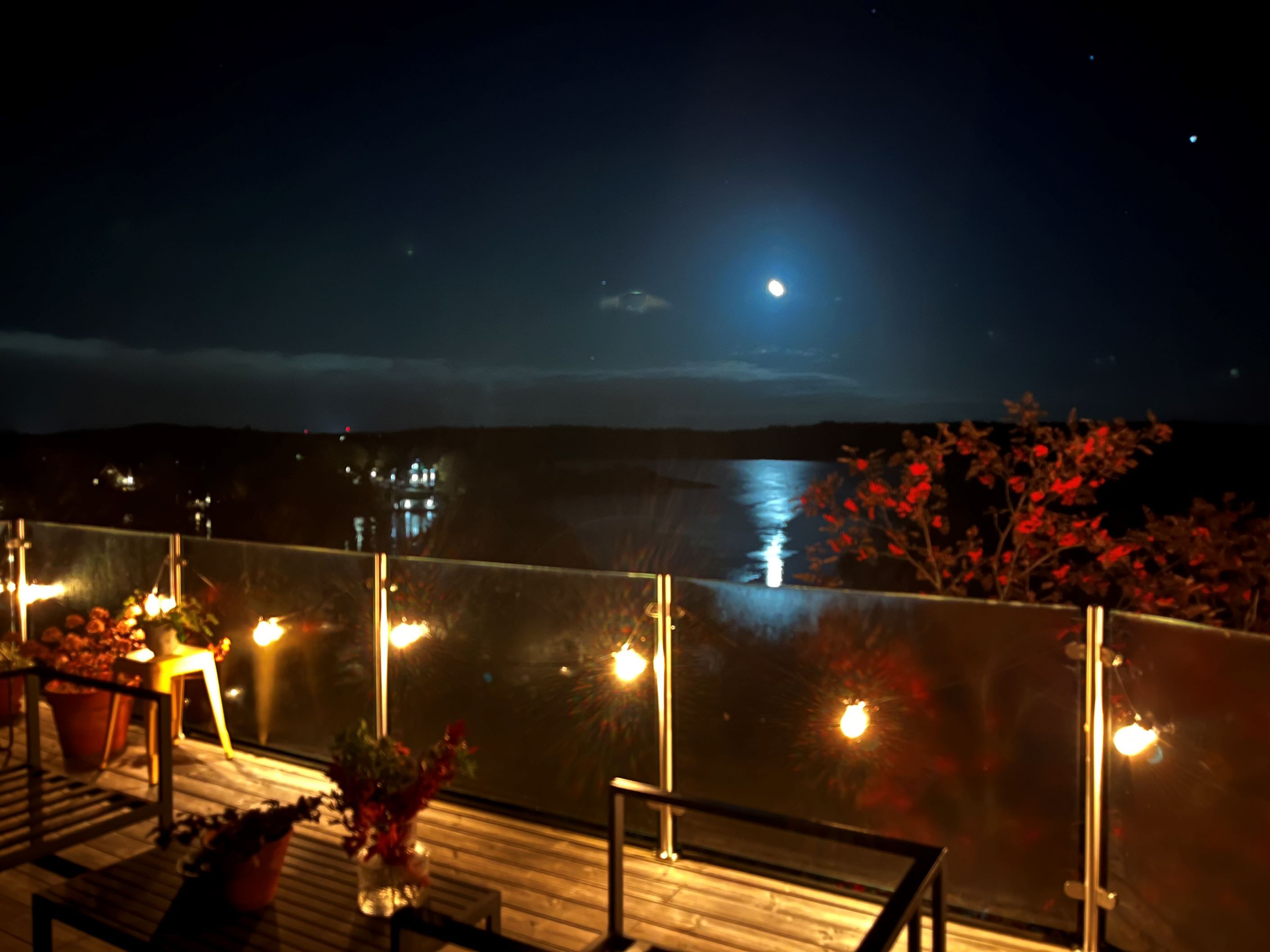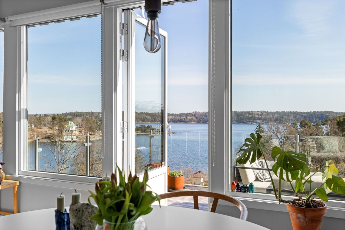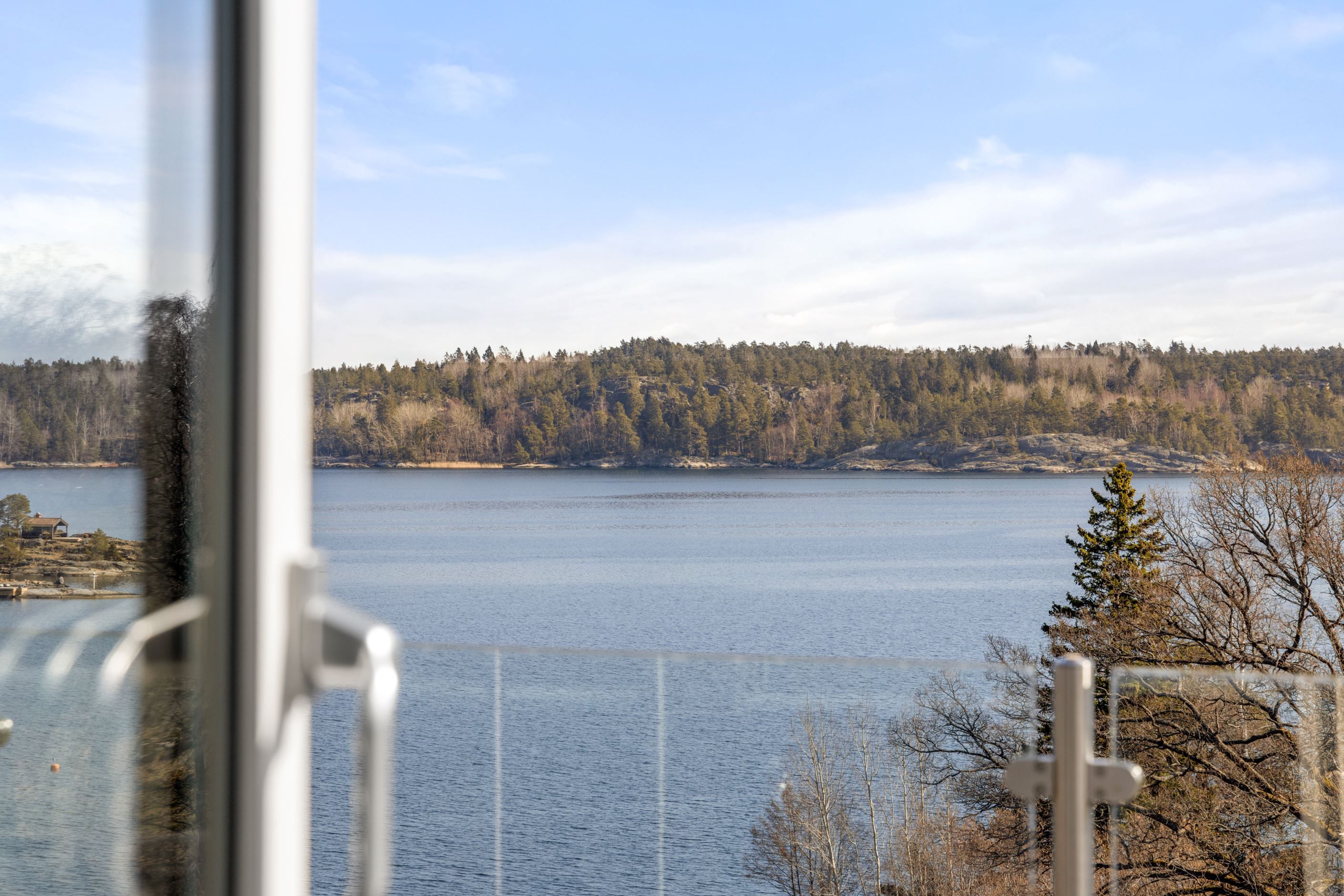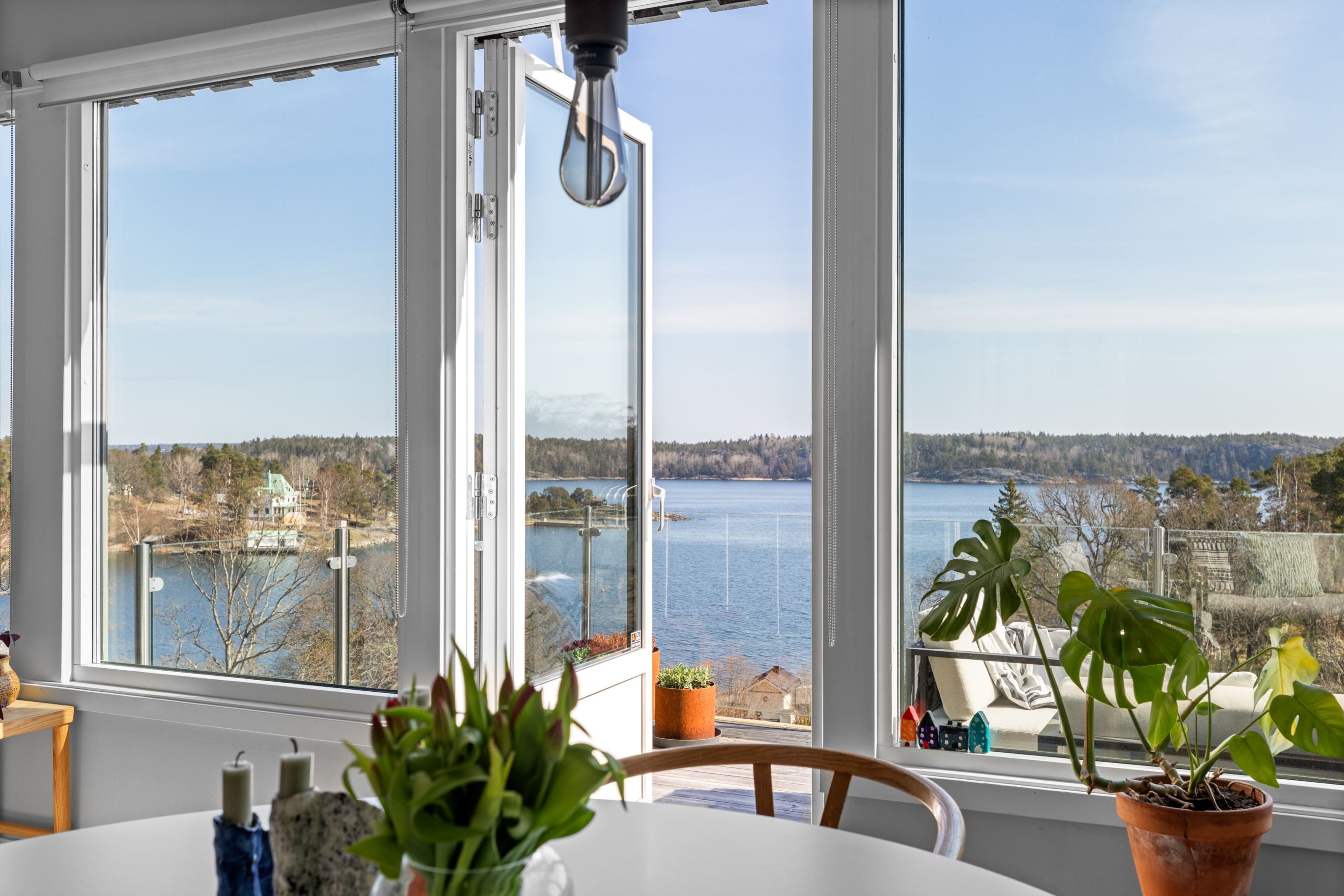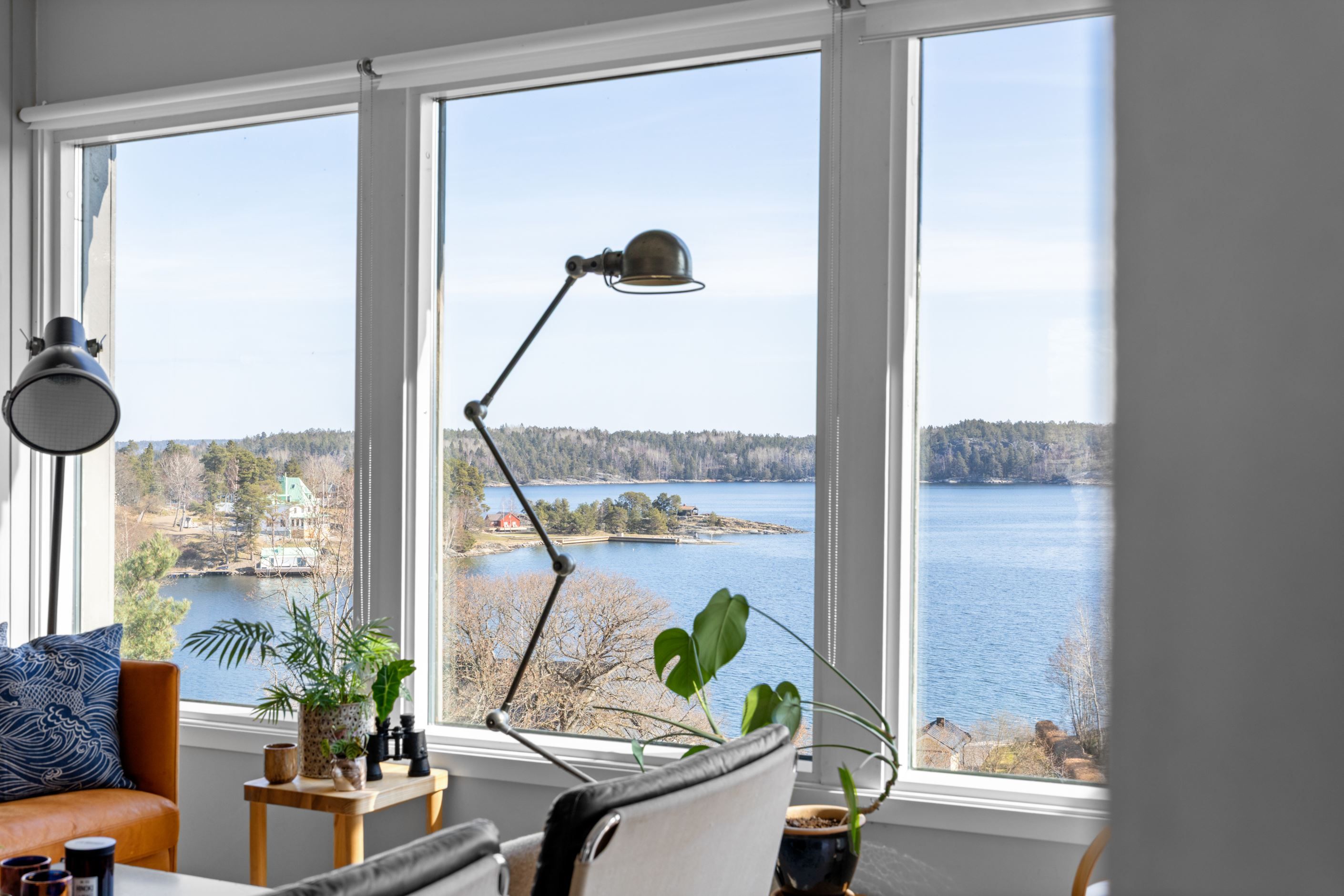 Här skiftar ljuset med årstiderna – från sommarens glittrande vatten till höstens dova, mjuka toner – och skapar en levande vy som ständigt förändras men alltid behåller sin rogivande karaktär. I horisonten breder skärgården ut sig som en stillsam siluett där hav och himmel möts i ett mjukt sken.