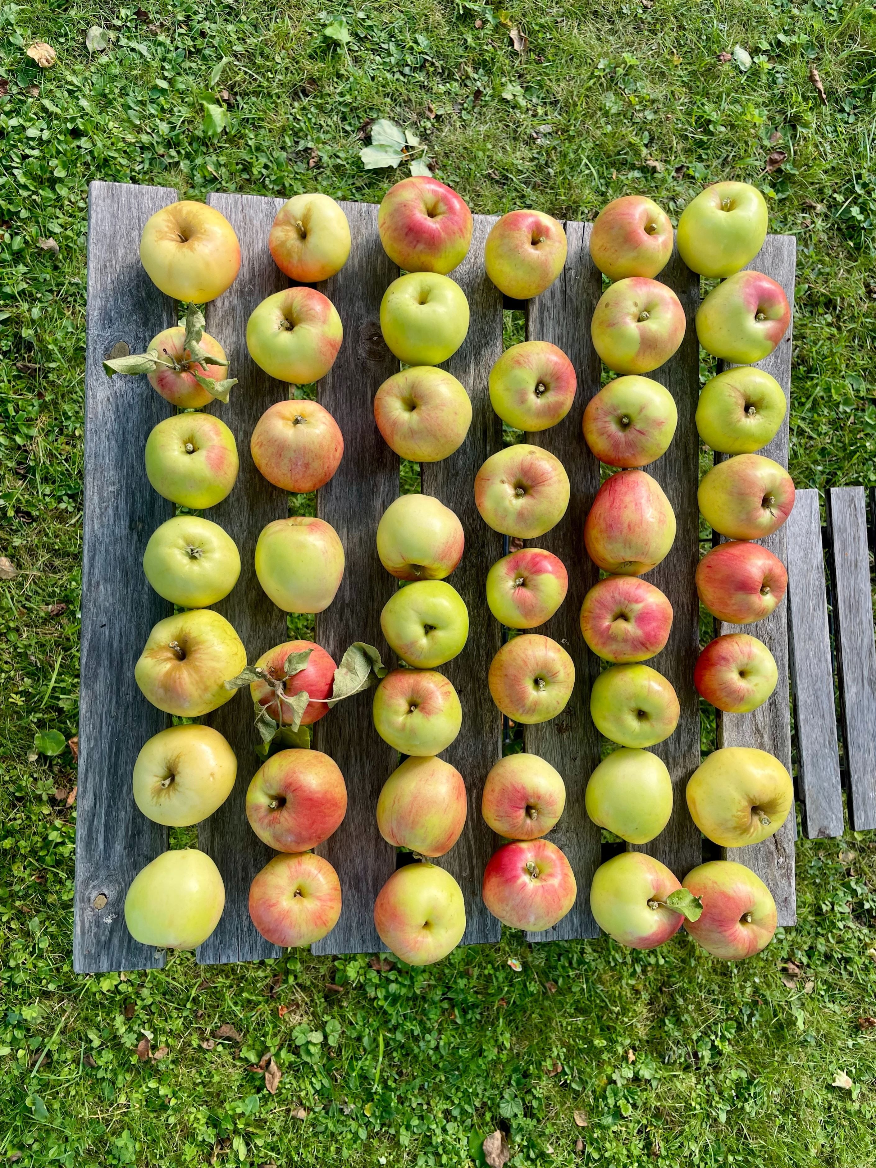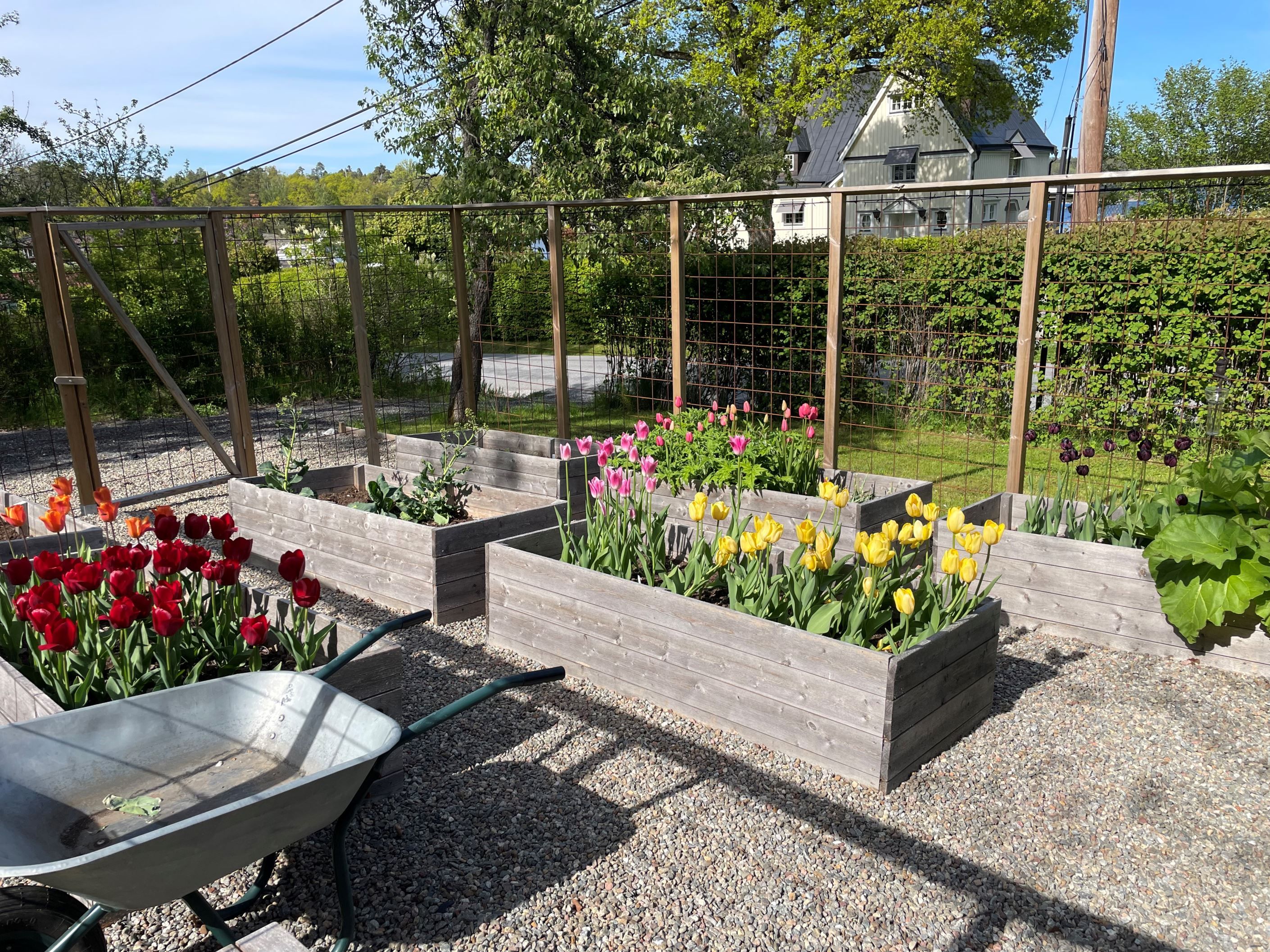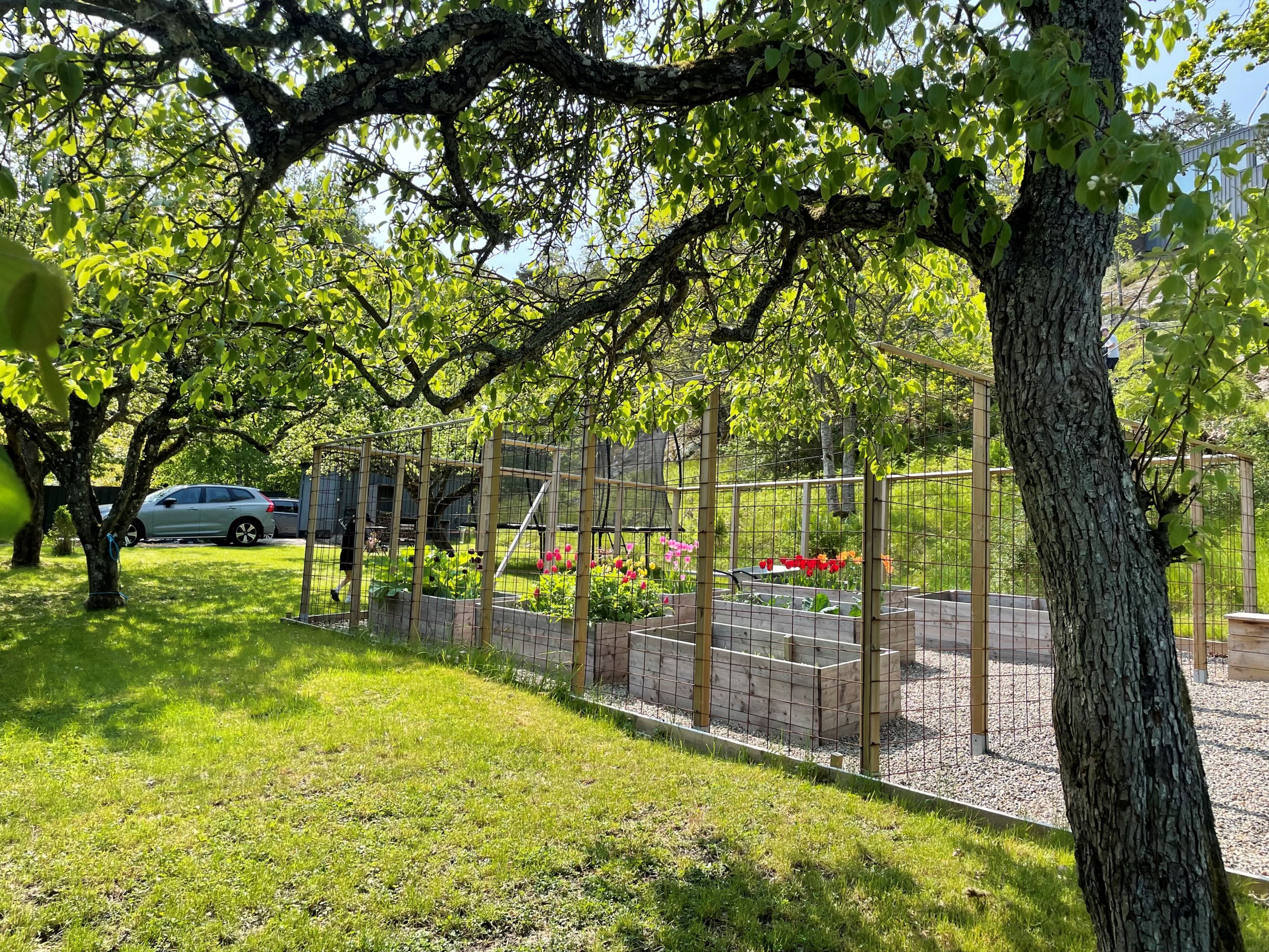 Tomten om generösa 4 475 kvm erbjuder stora möjligheter och flera tydliga delar. Den nedre delen utgör en plan och rymlig trädgård – perfekt som lekyta för barn eller för sociala tillställningar under sommarhalvåret. Här finns tre stora äppelträd, ett päronträd samt körsbärsträd. I det nyanlagda odlingsområdet finns odlingslådor för den som vill odla egna grönsaker, kryddor och blommor.