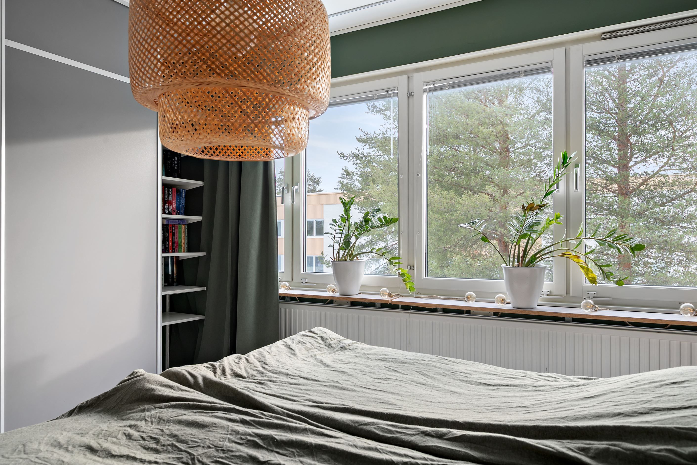 Sovrummet är idag beläget i den del av bostaden där vardagsrummet tidigare låg, vilket skapar en lugn och avskild miljö. Rummet rymmer enkelt en större säng och tillhörande möblemang, med plats för förvaring och en behaglig känsla som bjuder in till vila.