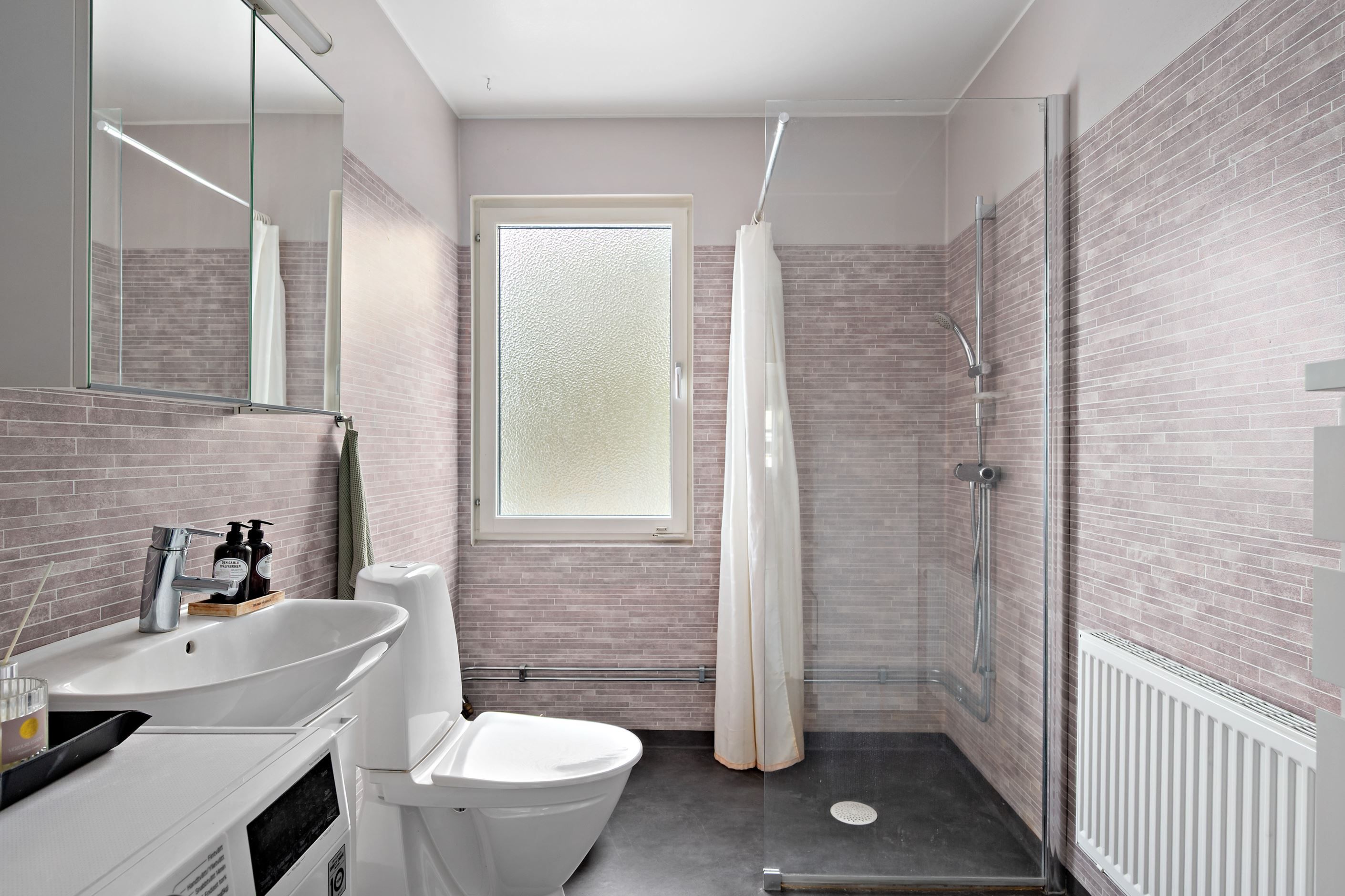 Även badrummet är renoverat i modern stil, med stilrena ytskikt och funktionella lösningar som ger både komfort och kvalitet. Här finns allt man kan önska i ett fräscht och välhållet badrum.