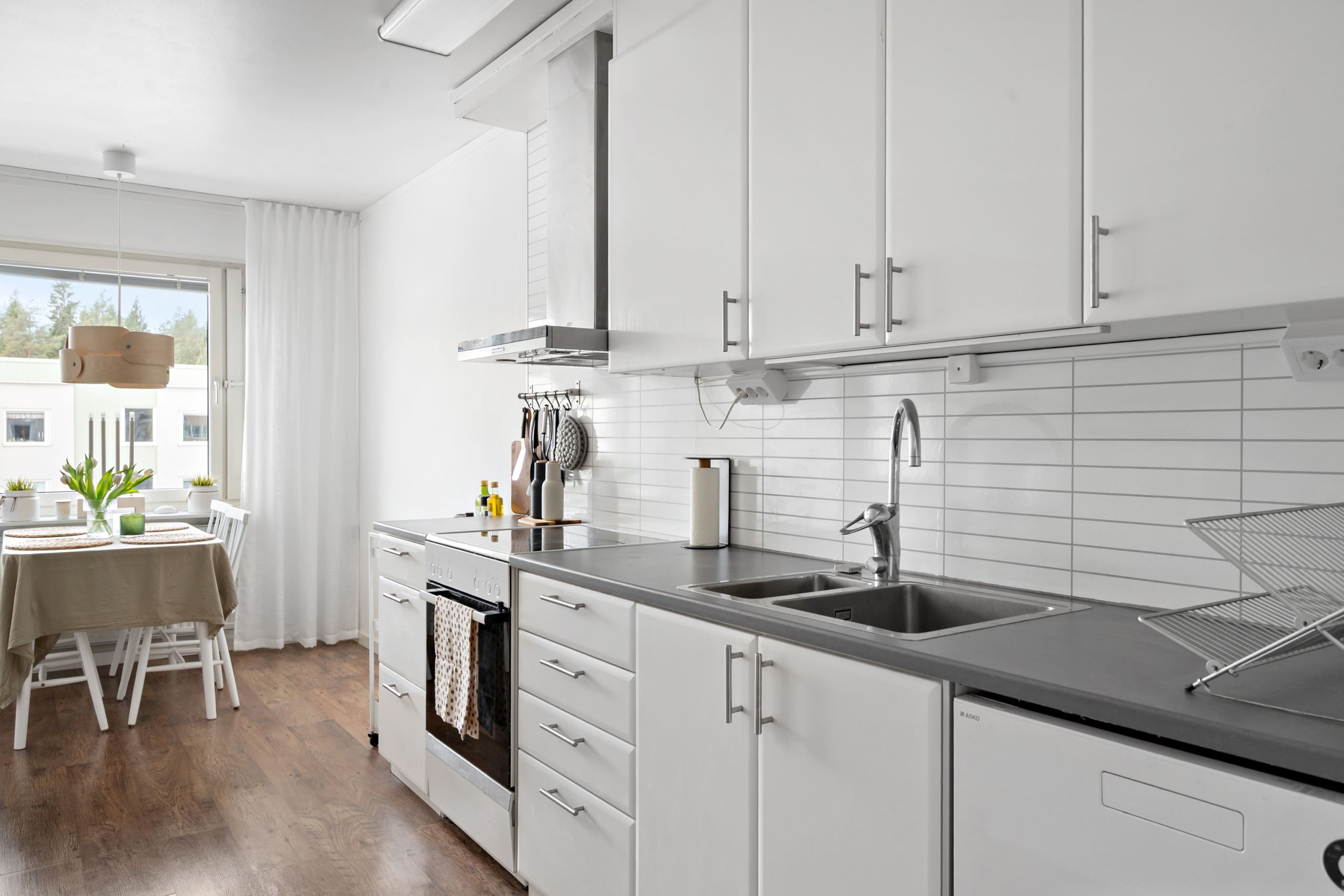 Här finns allt som behövs för både den vardagliga matlagningen och mer ambitiösa middagar, samtidigt som köket samspelar fint med vardagsrummet och skapar en luftig och inbjudande atmosfär.