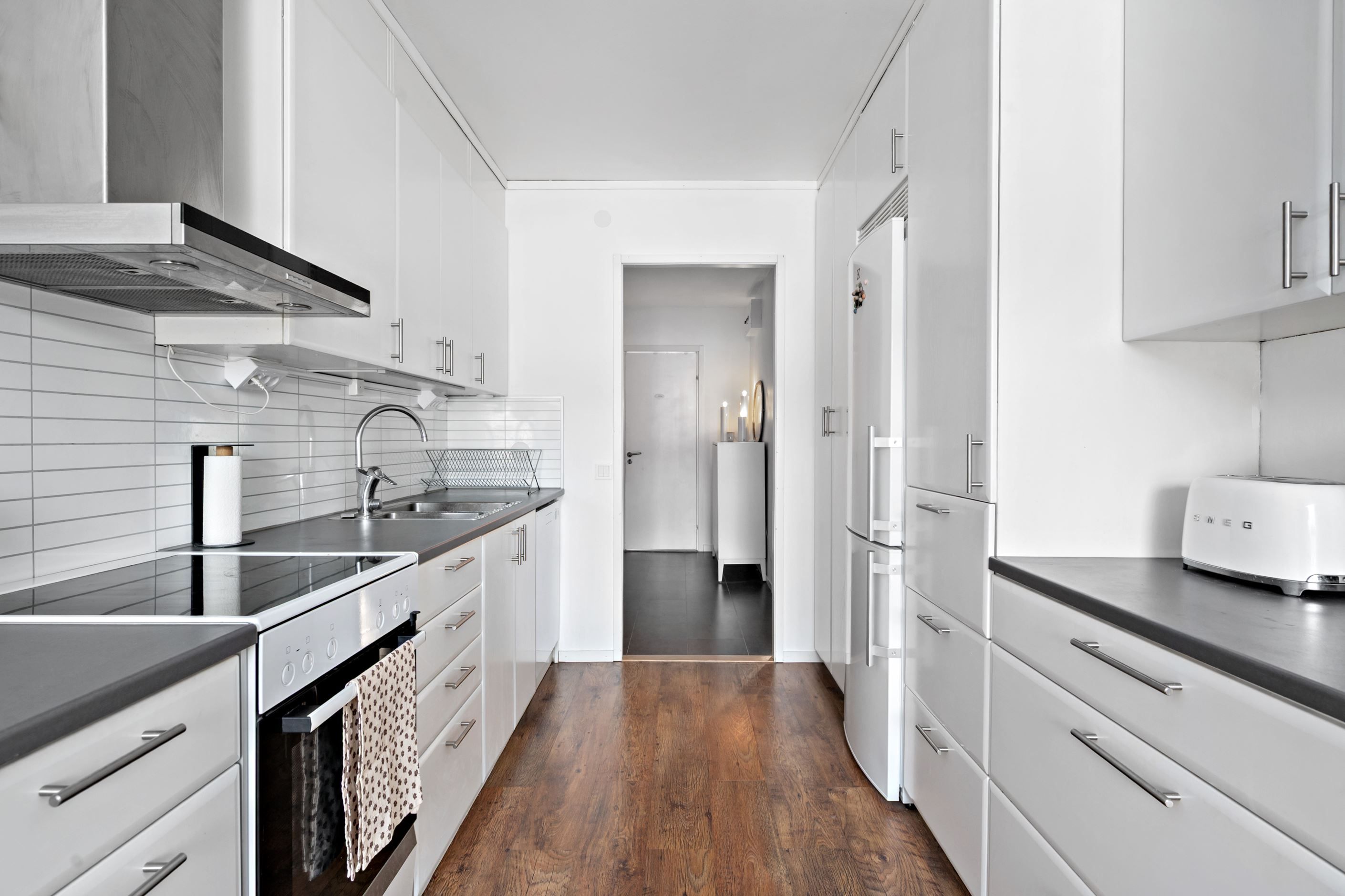 Köket är stilrent och modernt renoverat de senaste åren, med goda arbetsytor, smart förvaring och en genomgående harmonisk färg- och materialval.