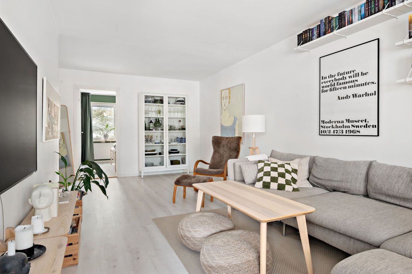 Lägenheten har genomgått en större omdisponering som verkligen lyfter helhetskänslan. Genom att flytta sovrummet och vardagsrummet har man skapat en öppen och social yta där kök och vardagsrum ligger i direkt anslutning till varandra – perfekt för både vardag och umgänge.