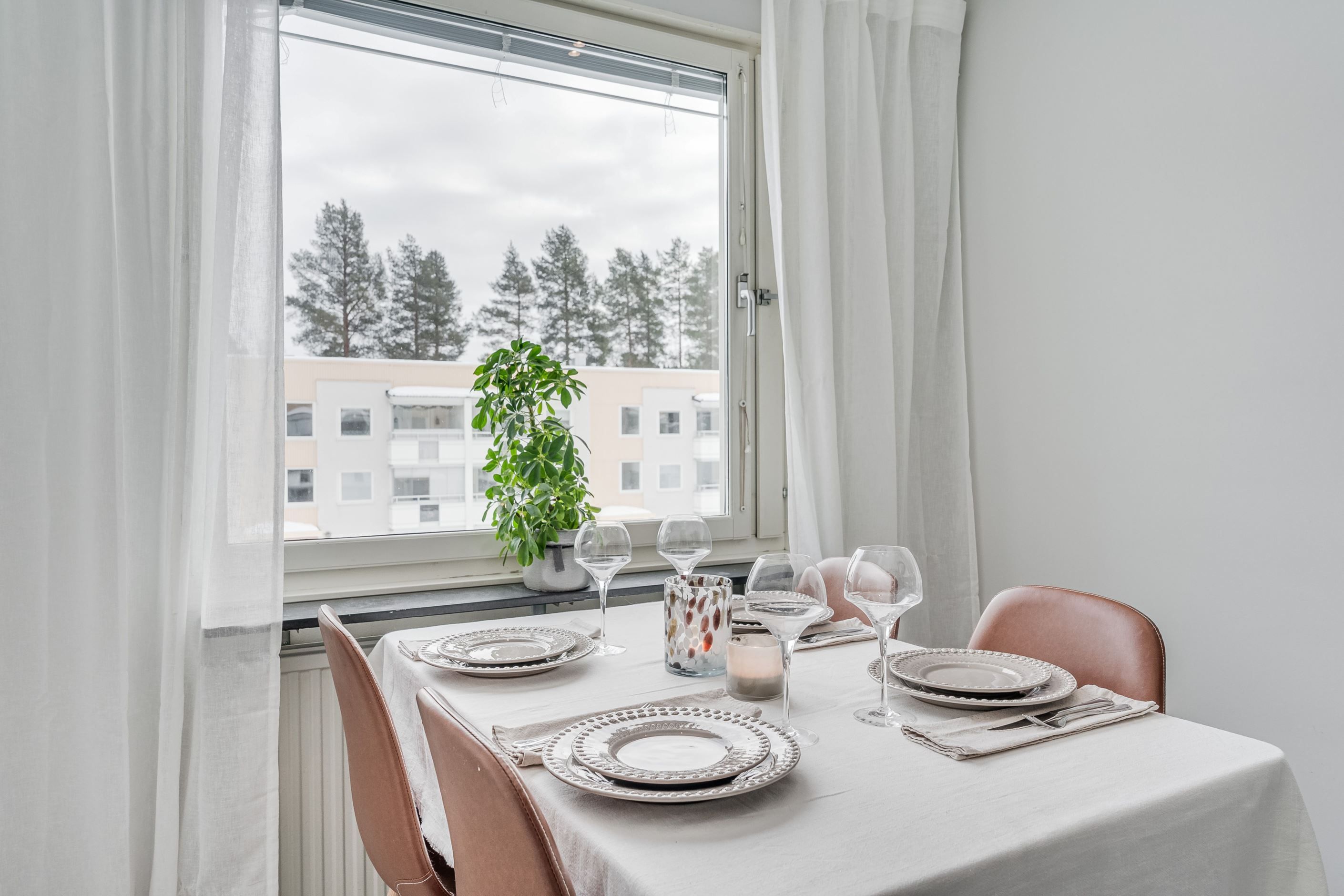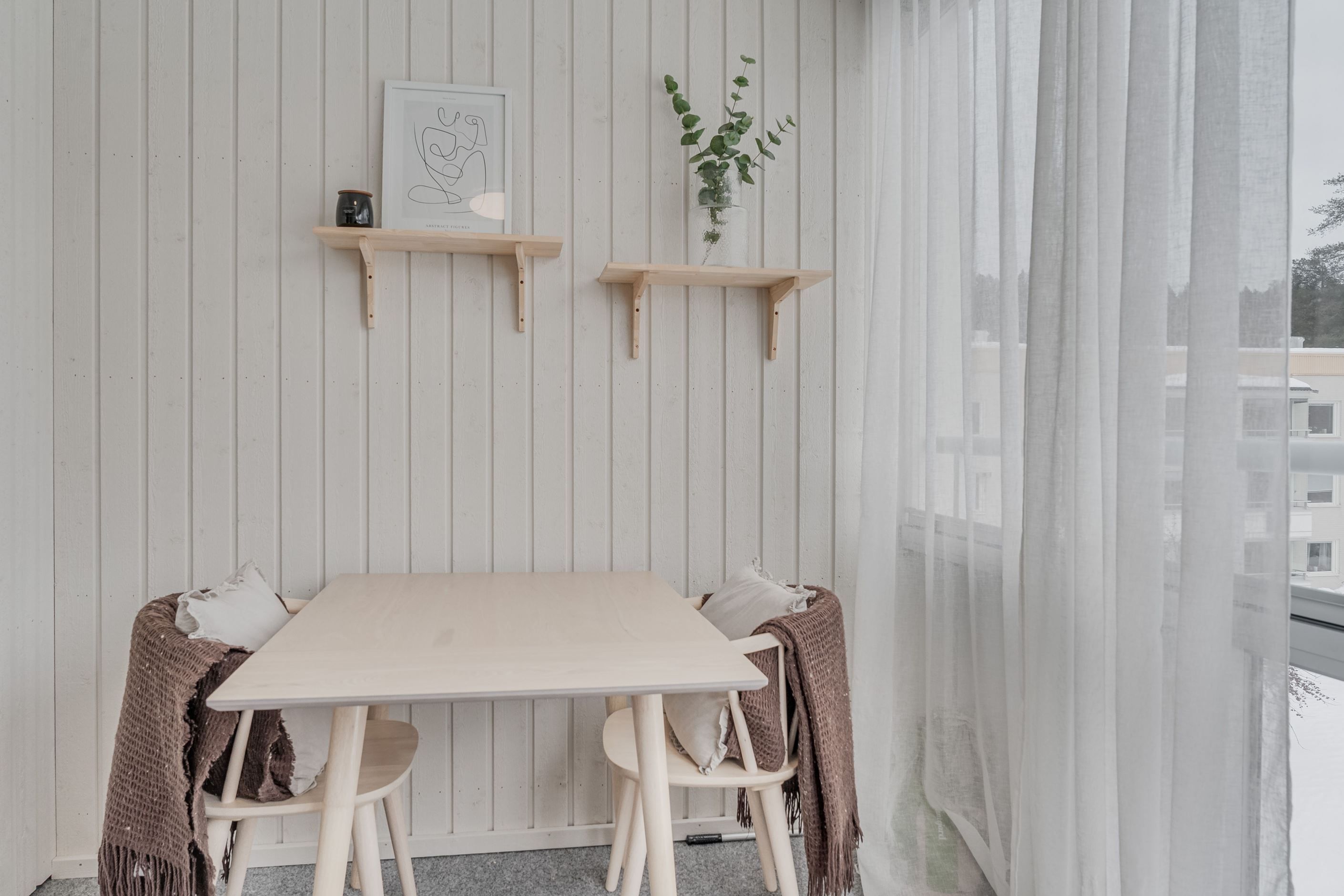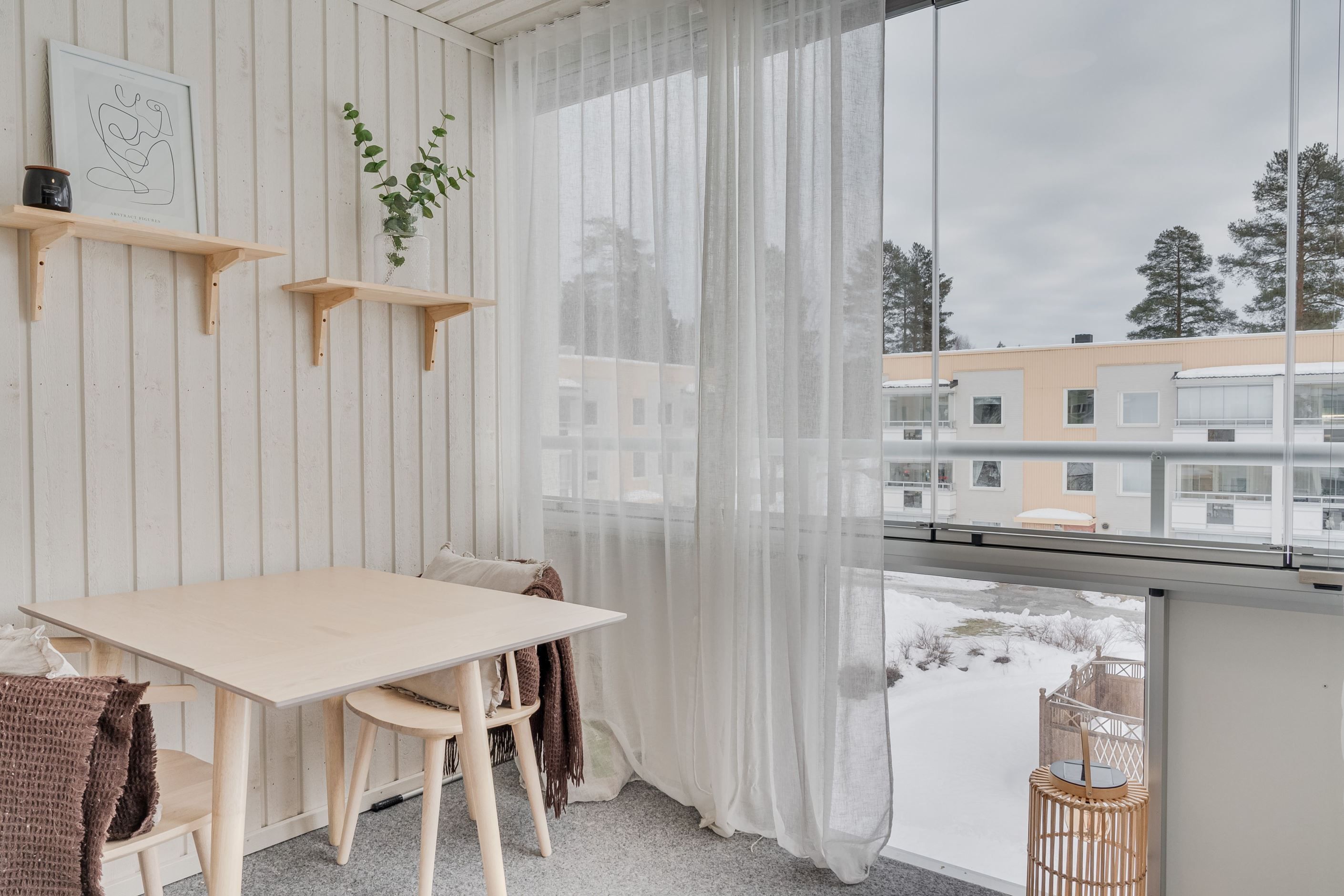 Som en förlängning av bostaden finner du den rymliga inglasade balkongen som blir ett uppskattat extrarum att nyttja stora delar av året. Här njuter du av lugnet, oavsett om det är morgonkaffet eller sena sommarkvällar.