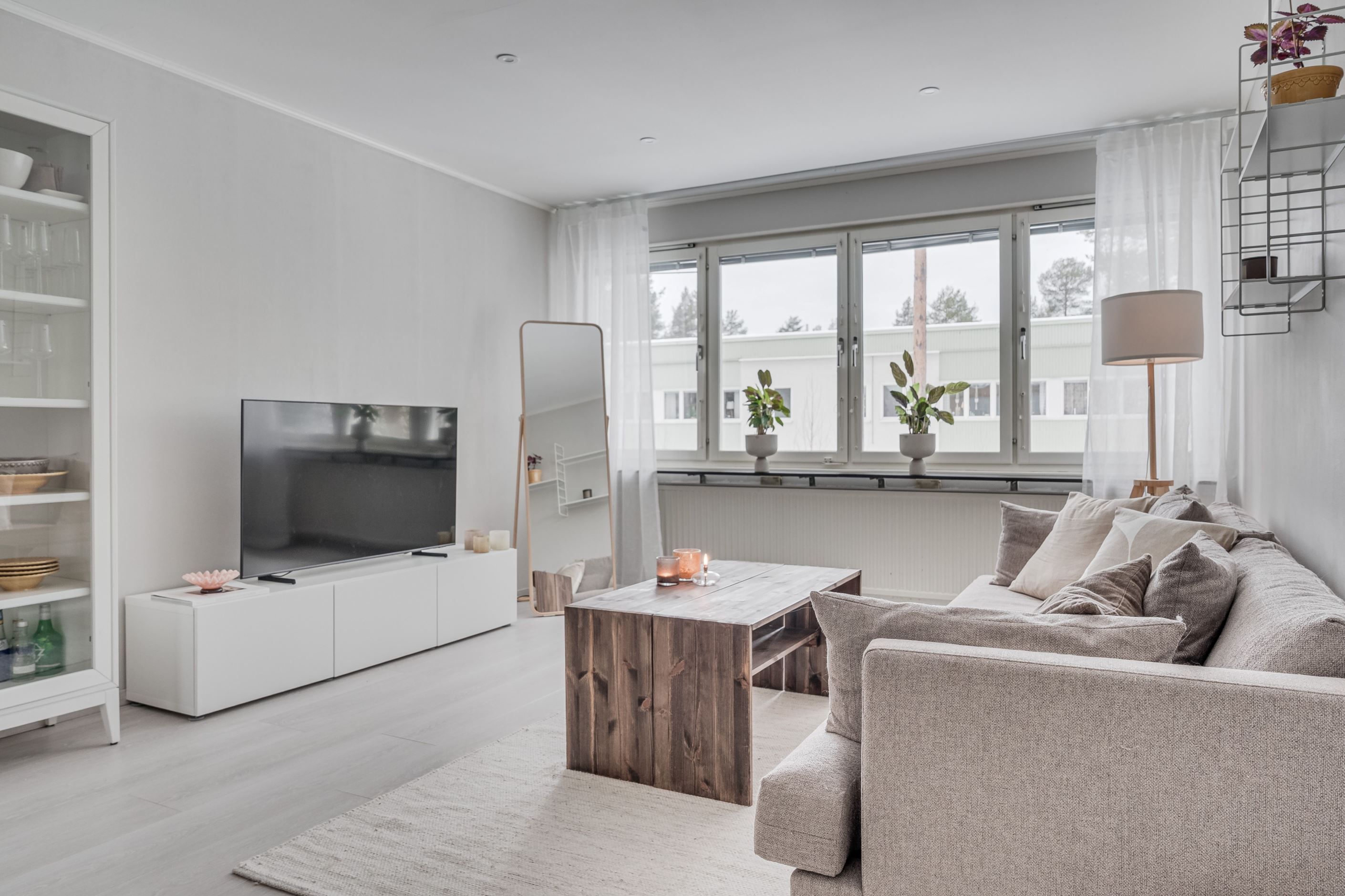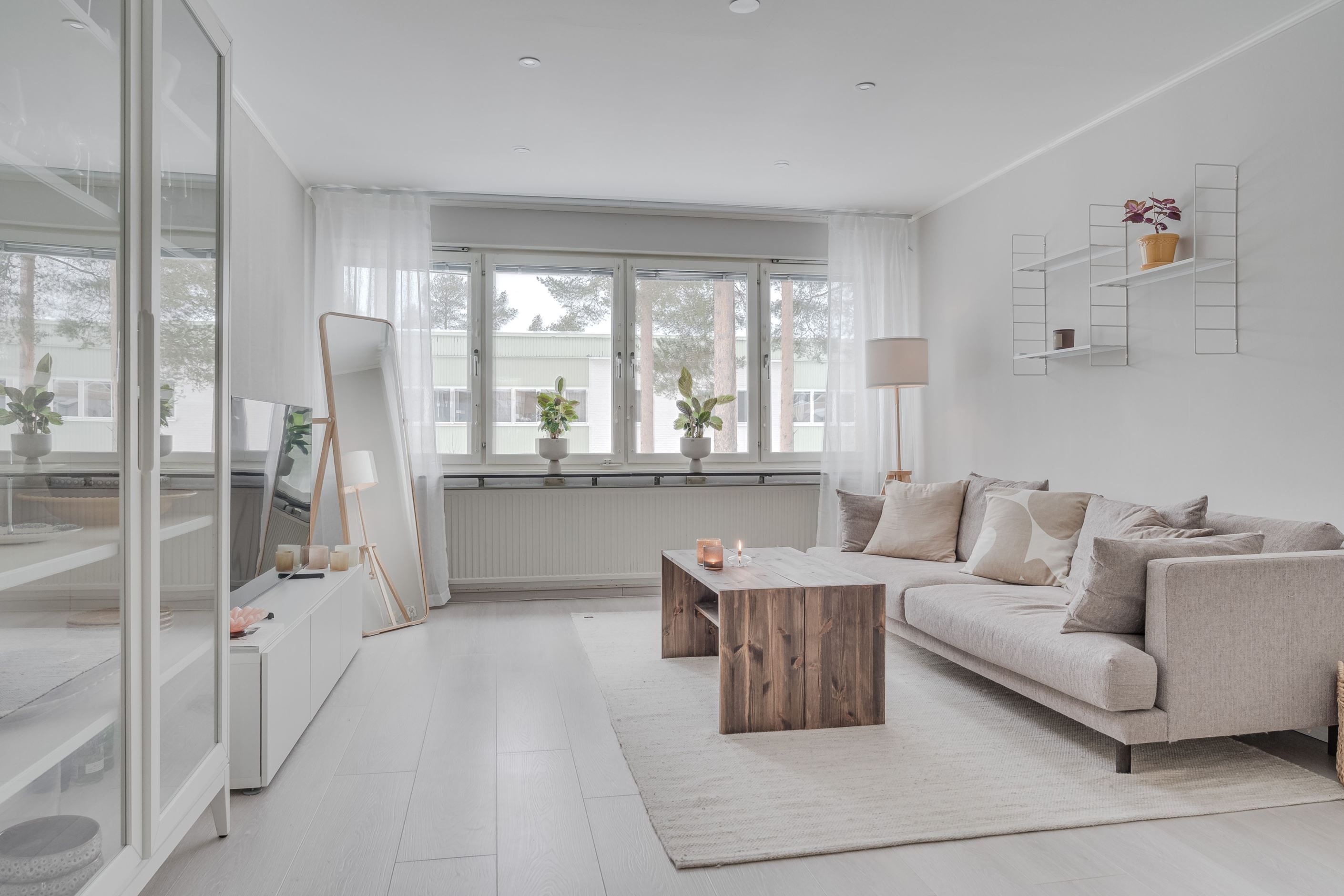 Vardagsrummet erbjuder fina sällskapsytor med gott om plats för både soffgrupp och matplats, och de stora fönsterpartierna släpper in rikligt med ljus som förstärker den luftiga känslan.