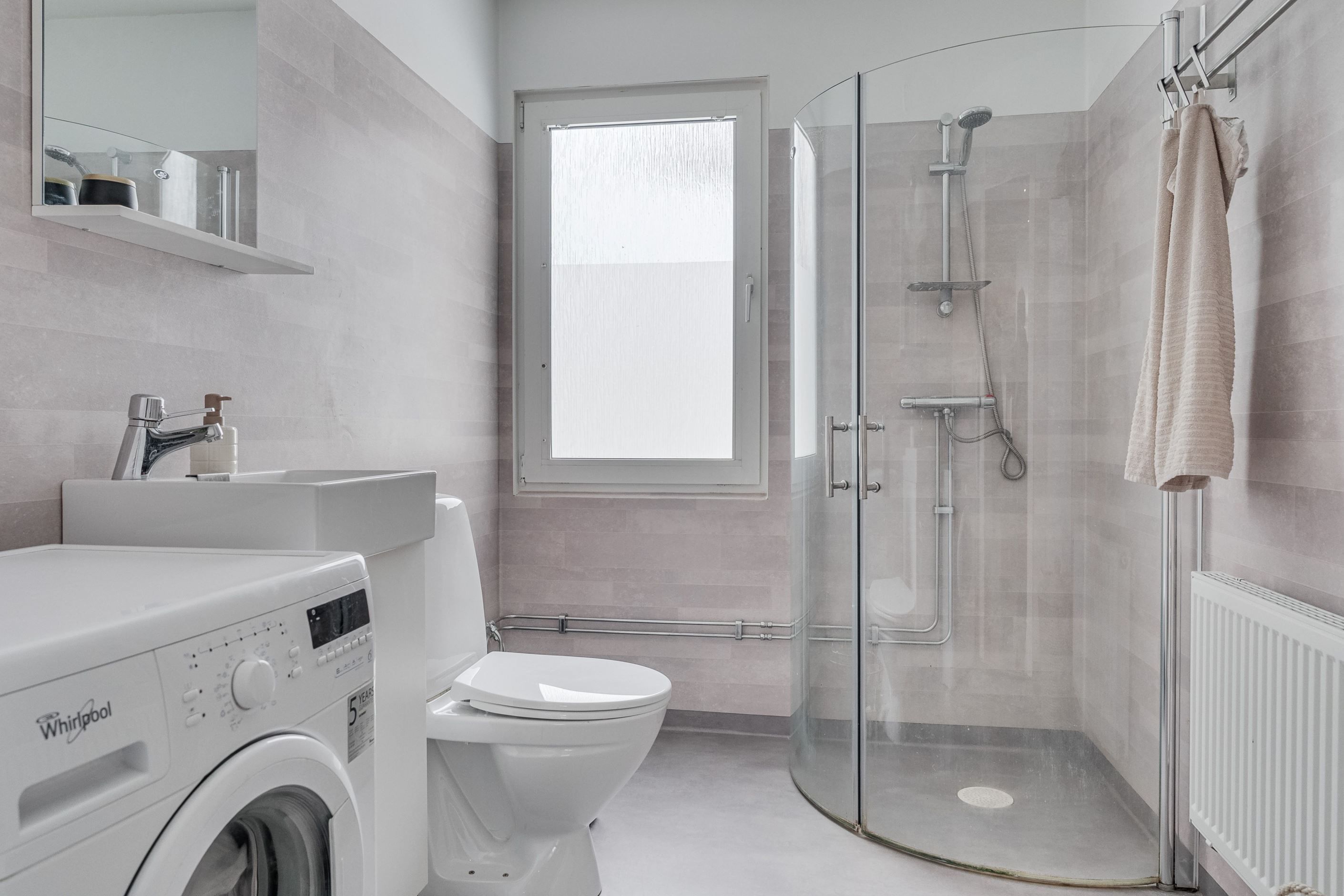 Badrummet är fräscht och funktionellt, utrustat med våtrumsmatta och våtrumstapet i tidlösa toner.