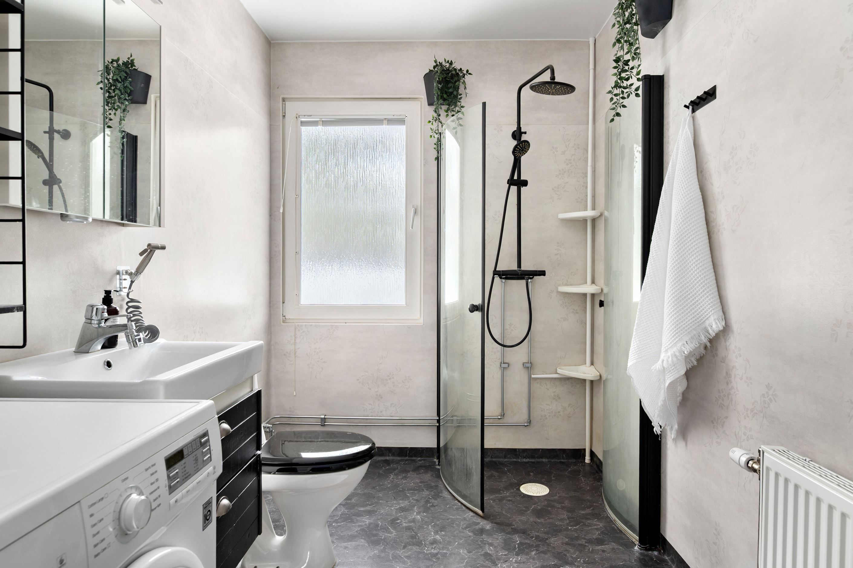Badrummet är funktionellt och praktiskt med mörk våtrumsmatta på golv och ljus våtrumsmatta på väggar. Här finns WC, kommod med förvaringslådor, spegelskåp, dusch med vikbara glasdörrar samt egen tvättmaskin - en bekvämlighet som förenklar vardagen. Ett frostat fönster bidrar med naturligt ljusinsläpp och vädringsmöjlighet.