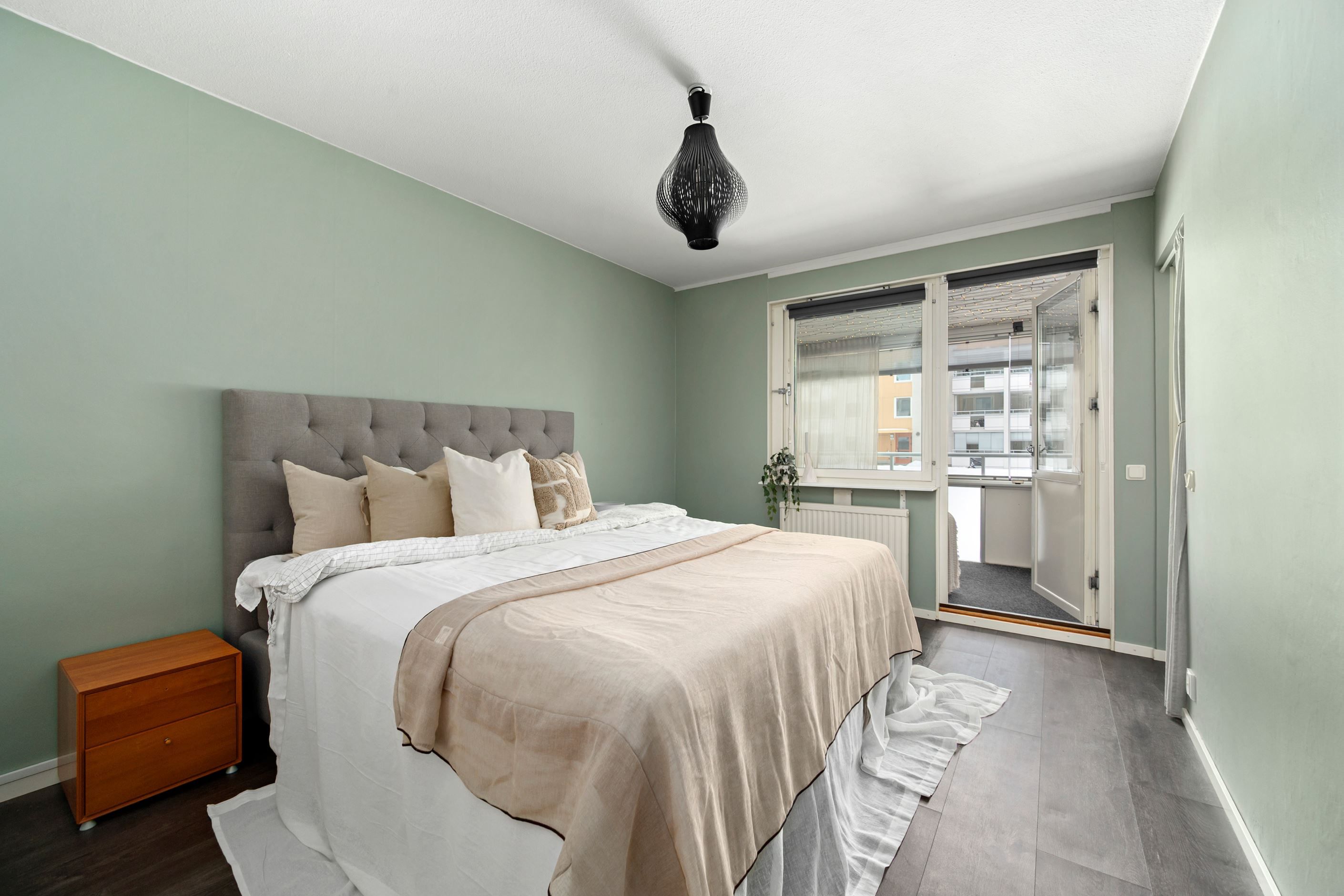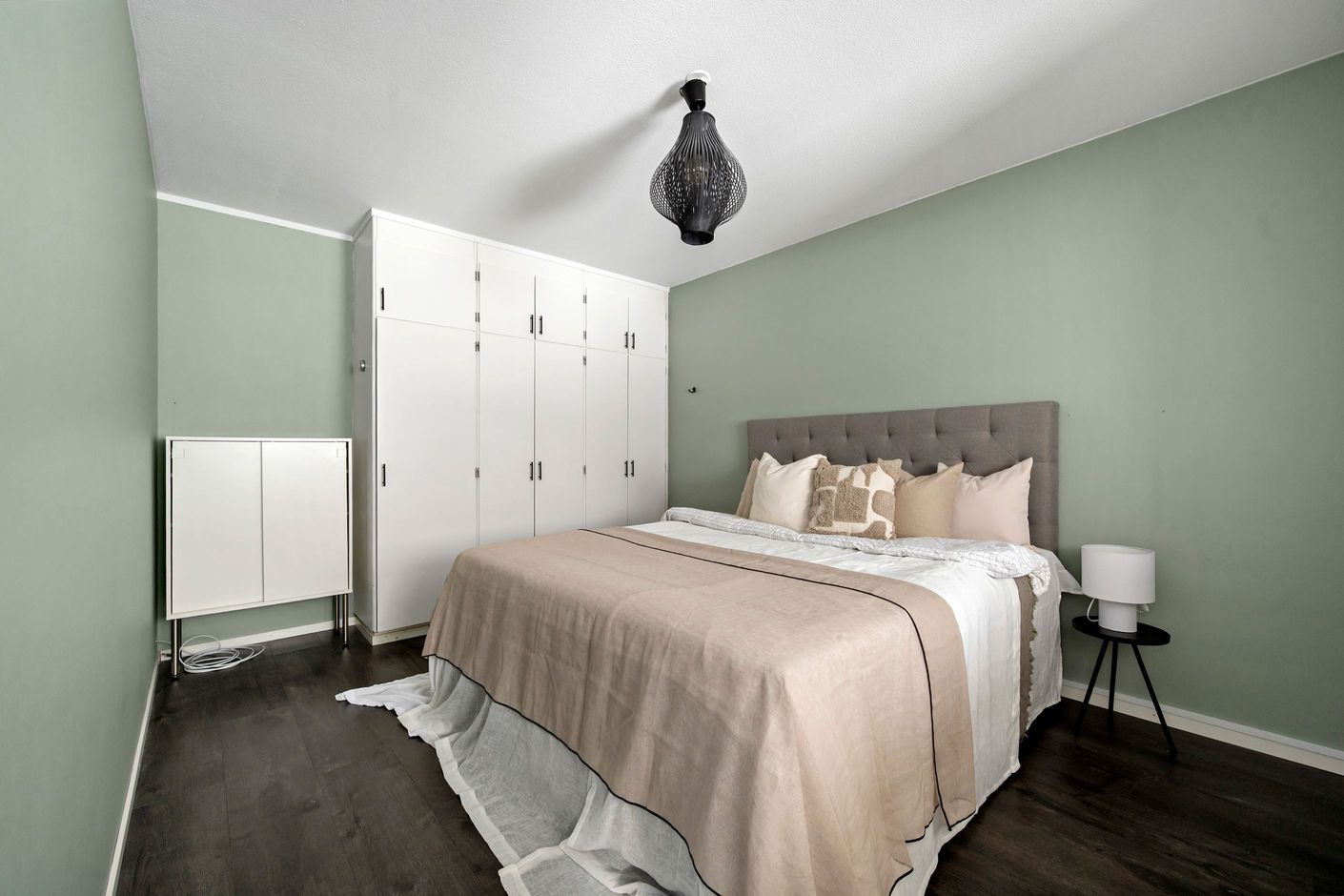 Sovrummet är rymligt och rofyllt med plats för dubbelsäng och tillhörande möblemang. Förvaringsmöjligheterna är goda tack vare flera garderober. Härifrån nås även den inglasade balkongen som är en uppskattad förlängning av bostaden och kan nyttjas stora delar av året. Med plats för loungemöbler blir detta en självklar favoritplats för såväl morgonkaffe som avkopplande kvällar.