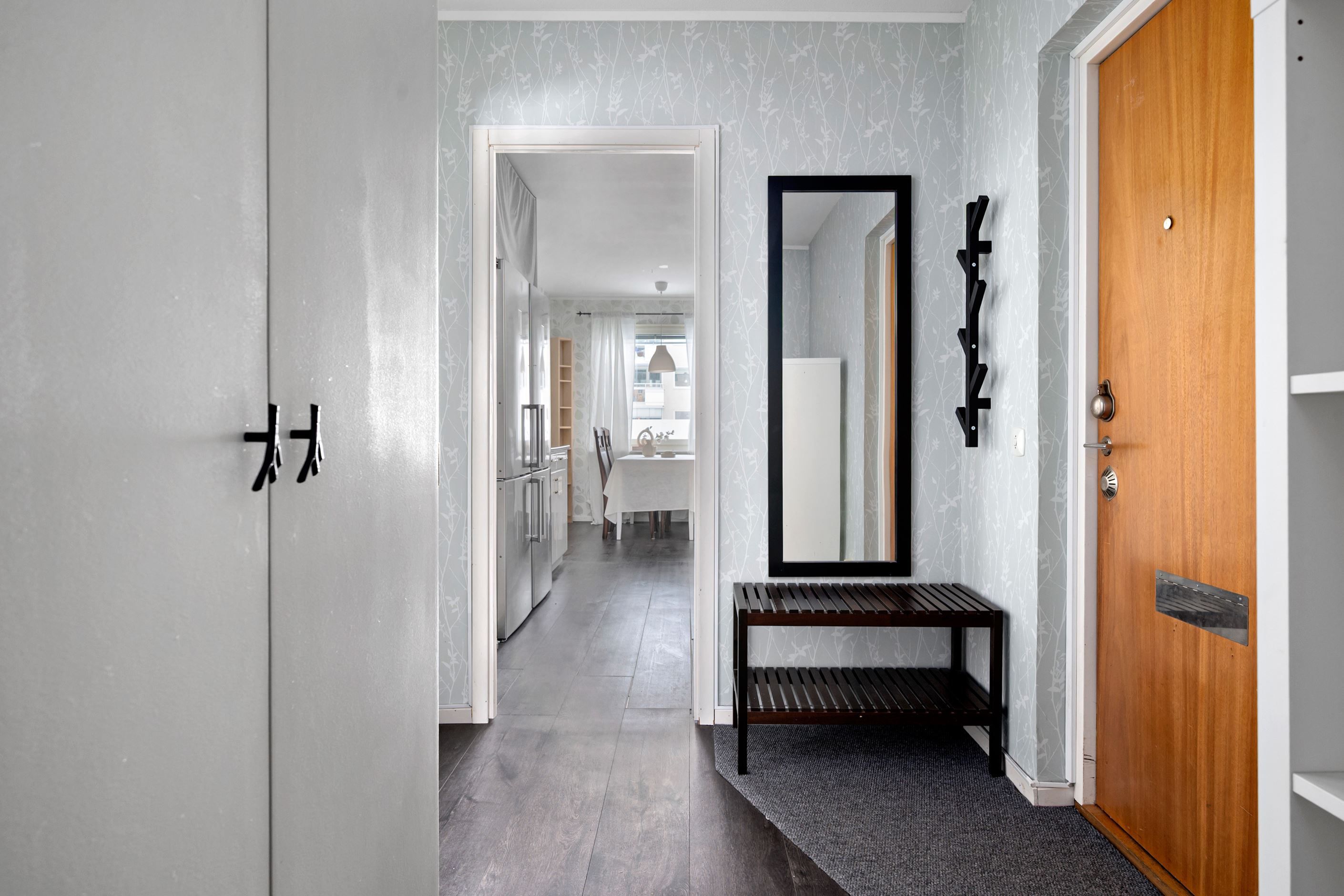 Redan i hallen möts du av en ljus och inbjudande atmosfär. Här finns gott om plats för ytterkläder och skor via praktisk hatthylla samt god förvaring i anslutande garderober. Planlösningen är genomtänkt och leder dig naturligt vidare in i bostadens sociala delar.
