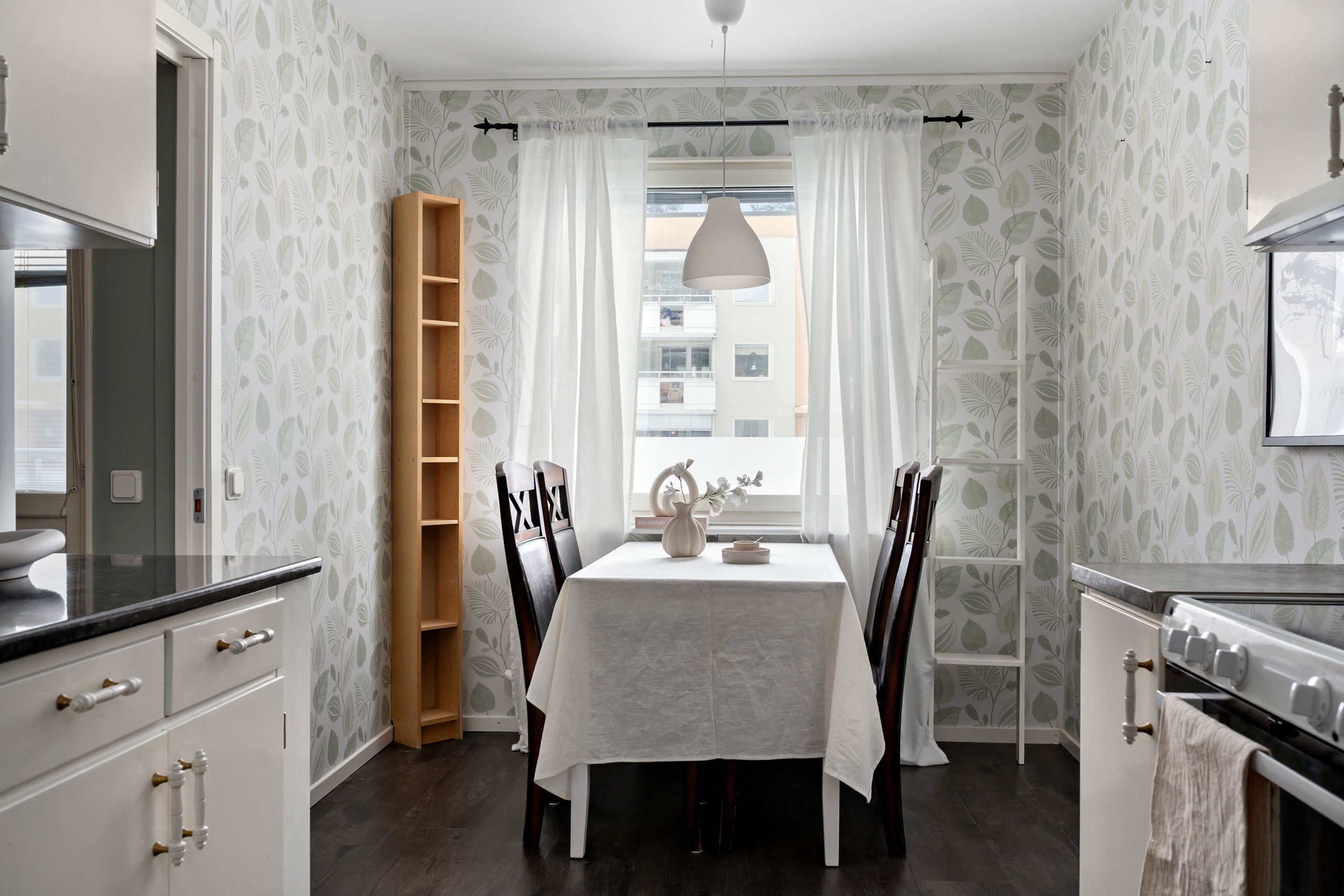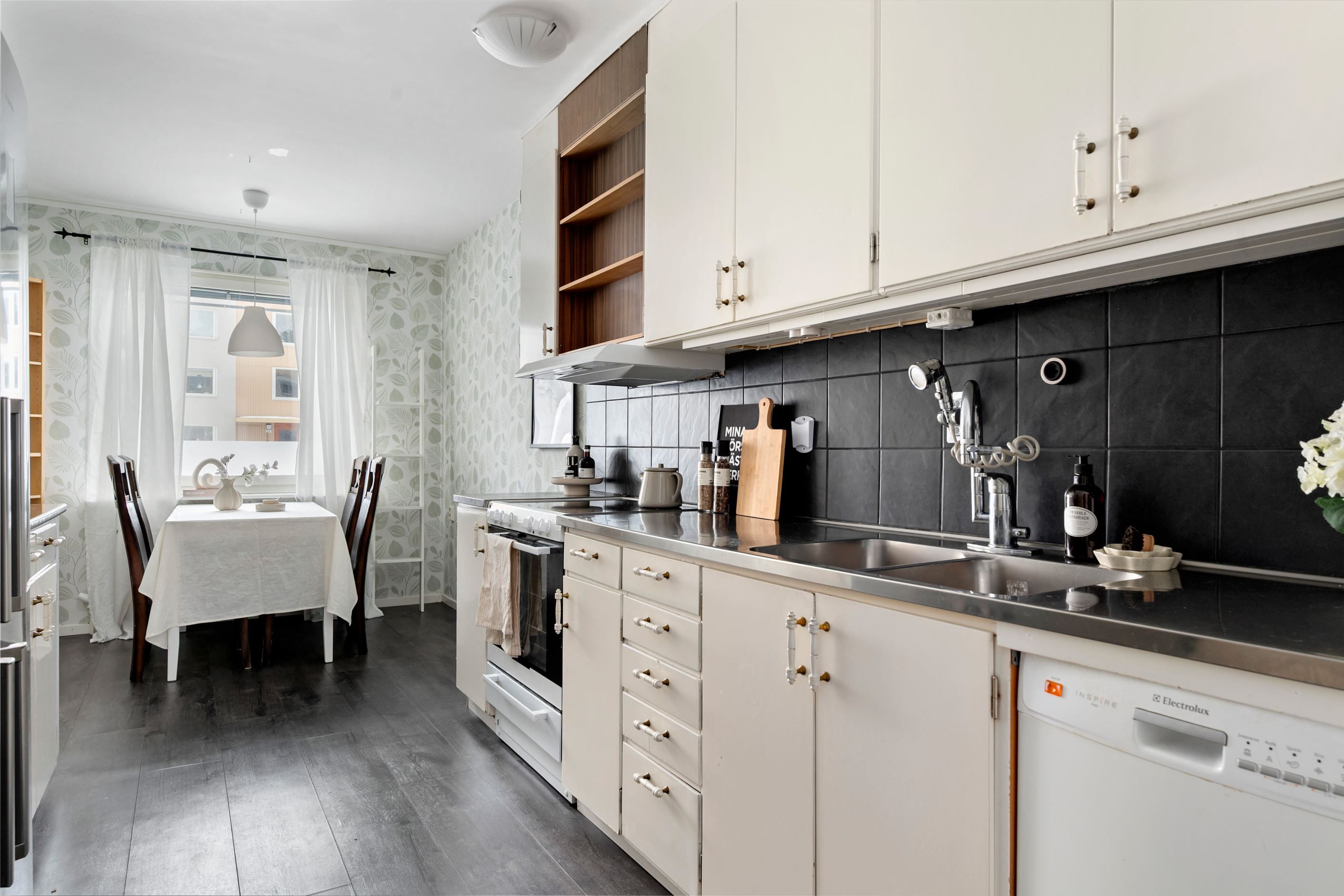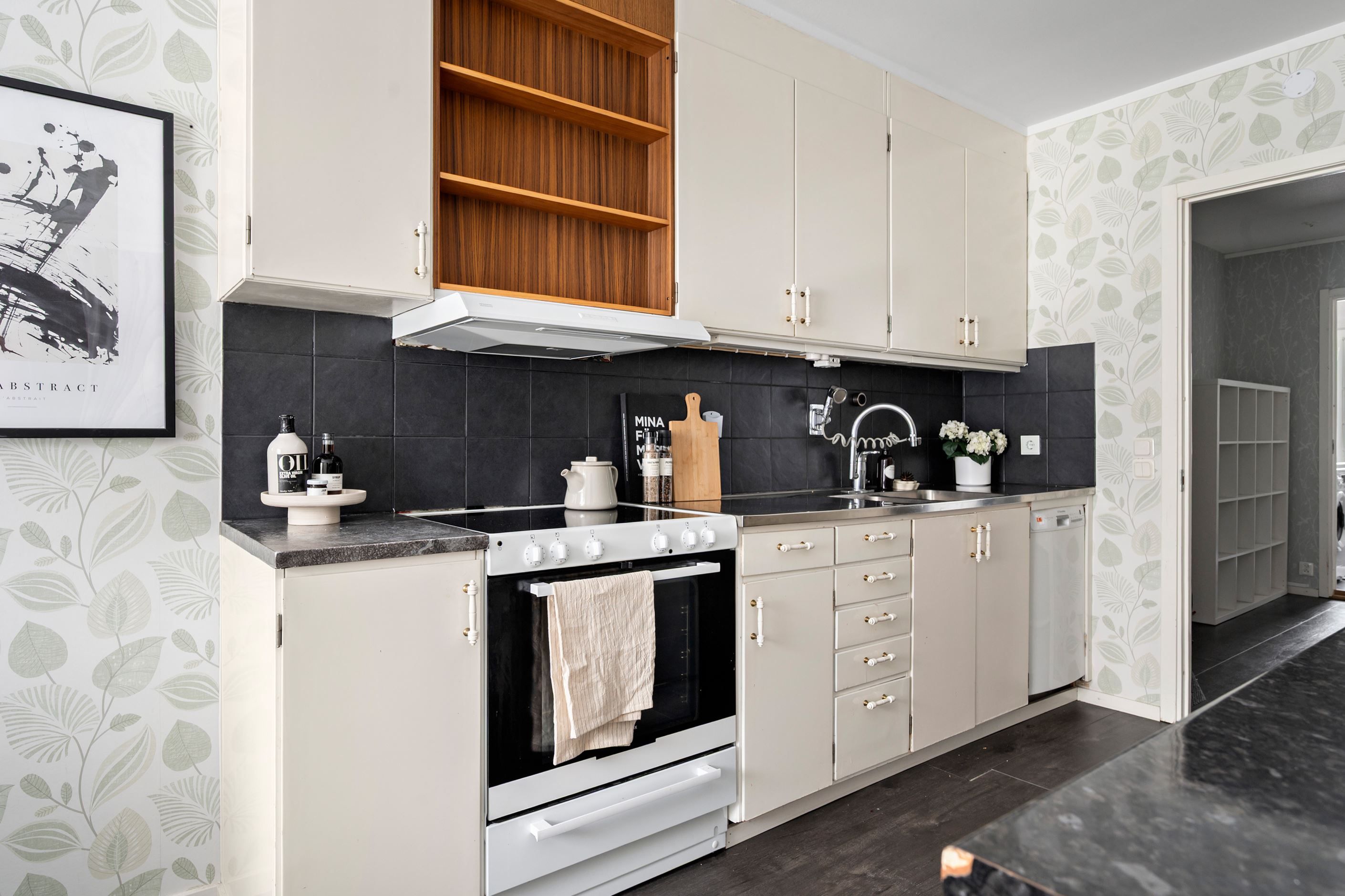 Köket är stilrent utformat med vita luckor, mörkt kakel ovan arbetsytorna och generösa förvaringsmöjligheter. Här finns full maskinell utrustning i form av spis, fläkt, diskmaskin samt kyl och frys. Intill fönsterpartiet ryms en matplats i perfekt läge, en trivsam plats för morgonkaffet, vardagsmiddagar eller helgbrunch i dagsljus.