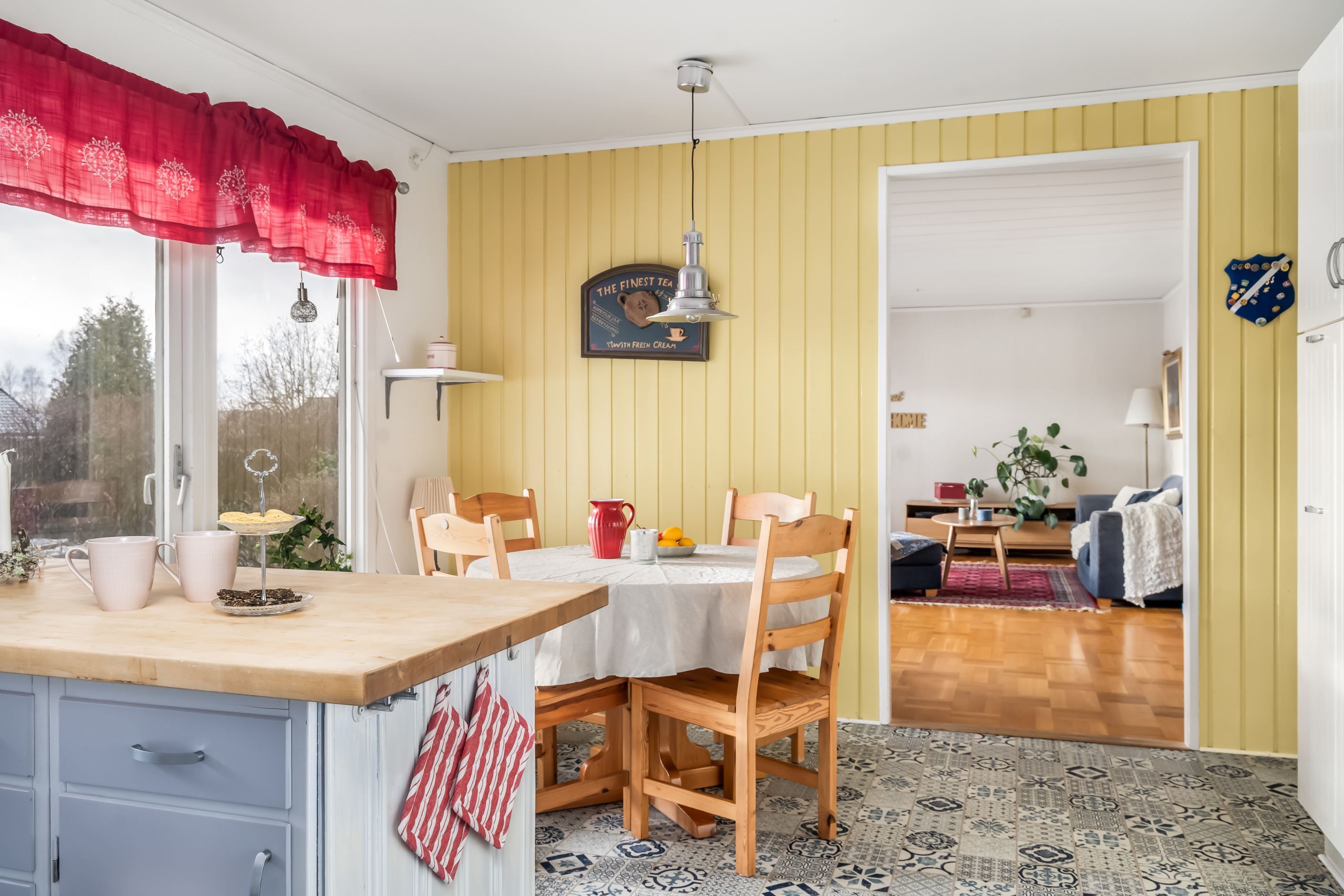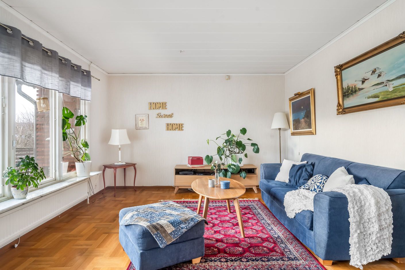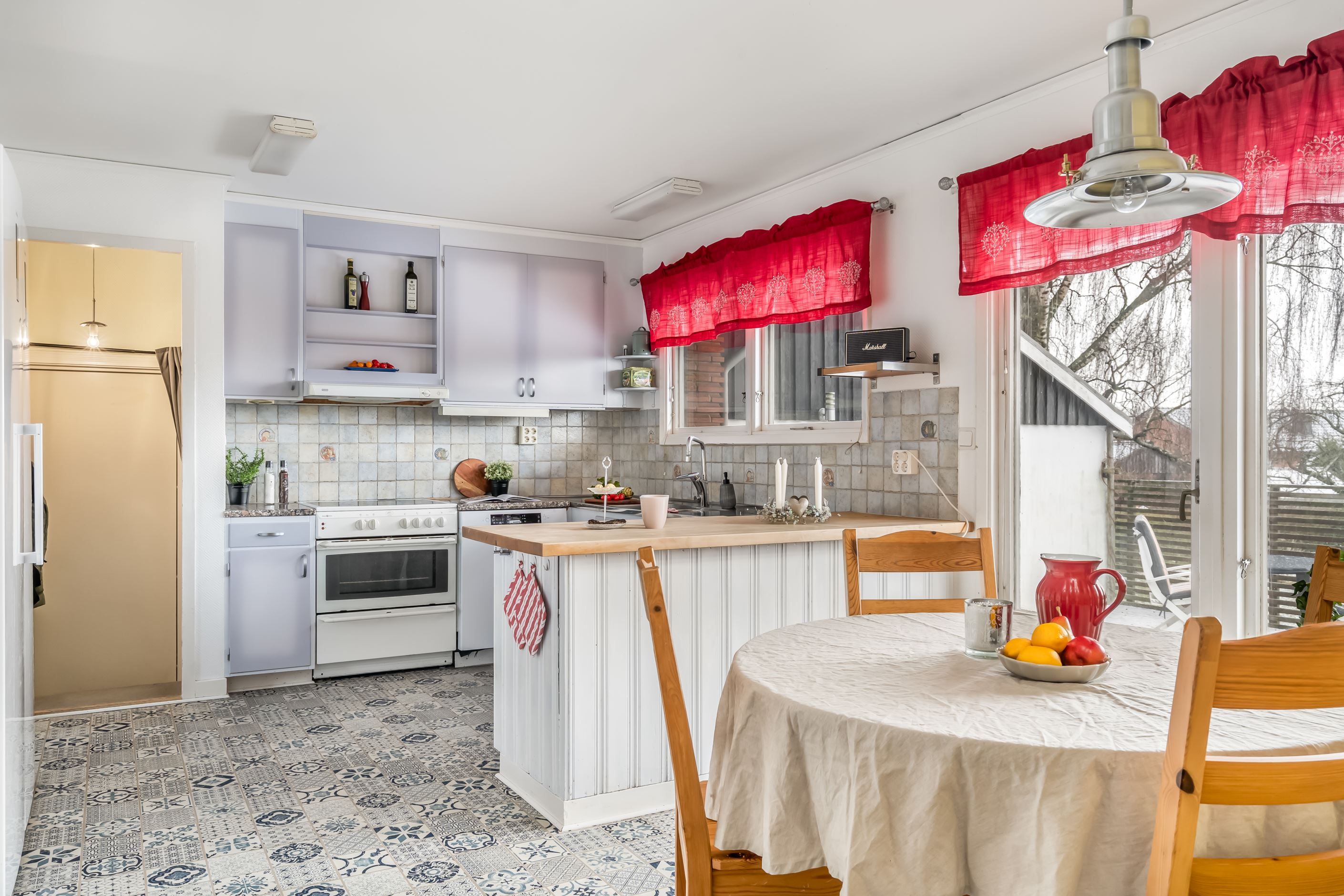 Här möts du av ett ljust vardagsrum med vacker parkett, som tillsammans med det sociala köket skapar en härlig samlingspunkt för både vardag och fest. Badrummet är renoverat och fräscht, och huset håller god standard med bland annat luft-vattenvärmepump som skapar behaglig komfort året runt.