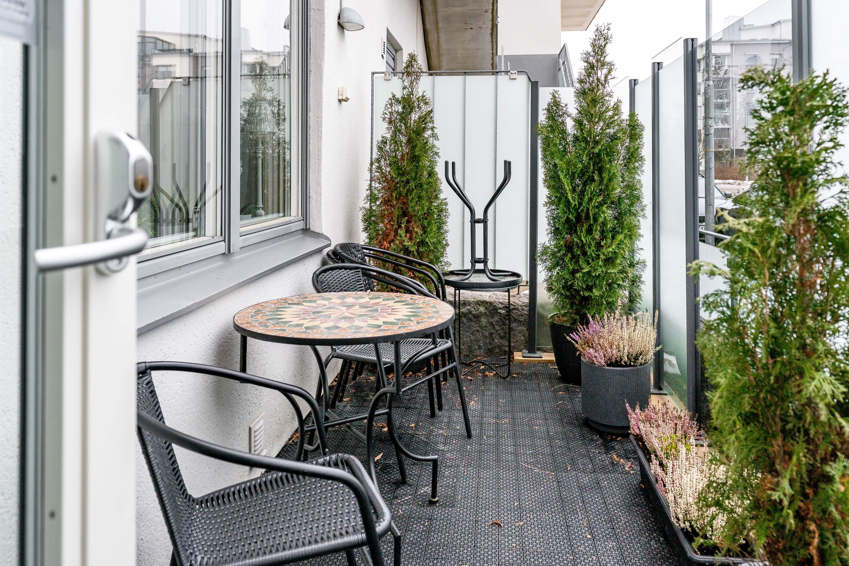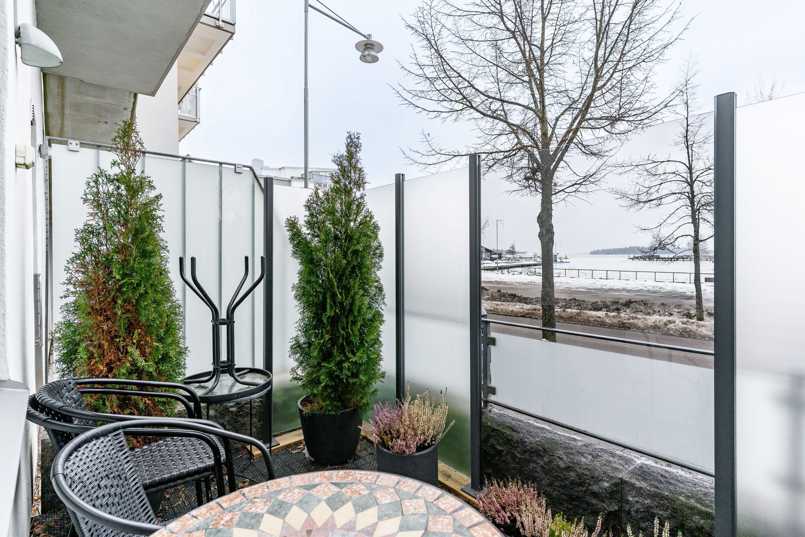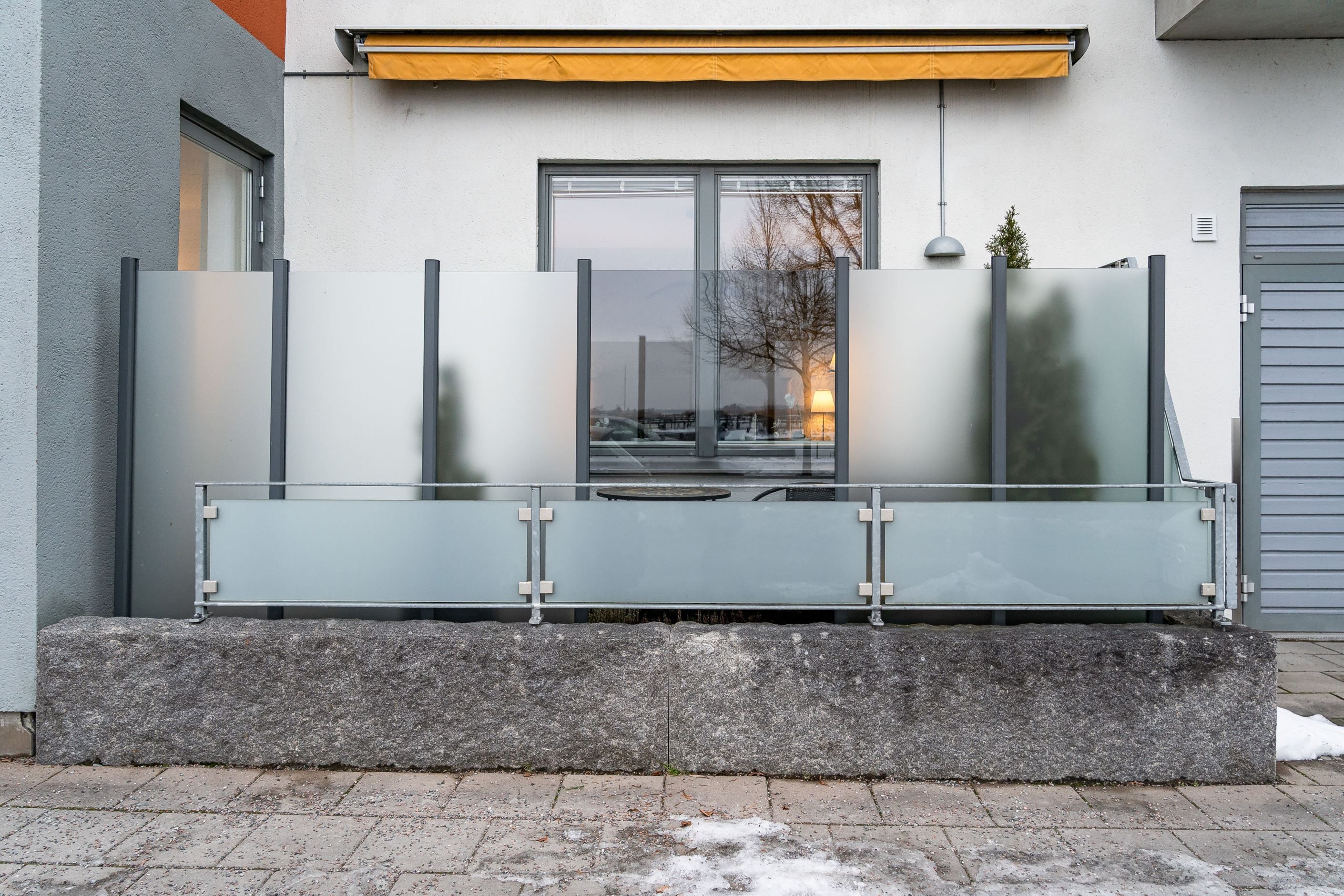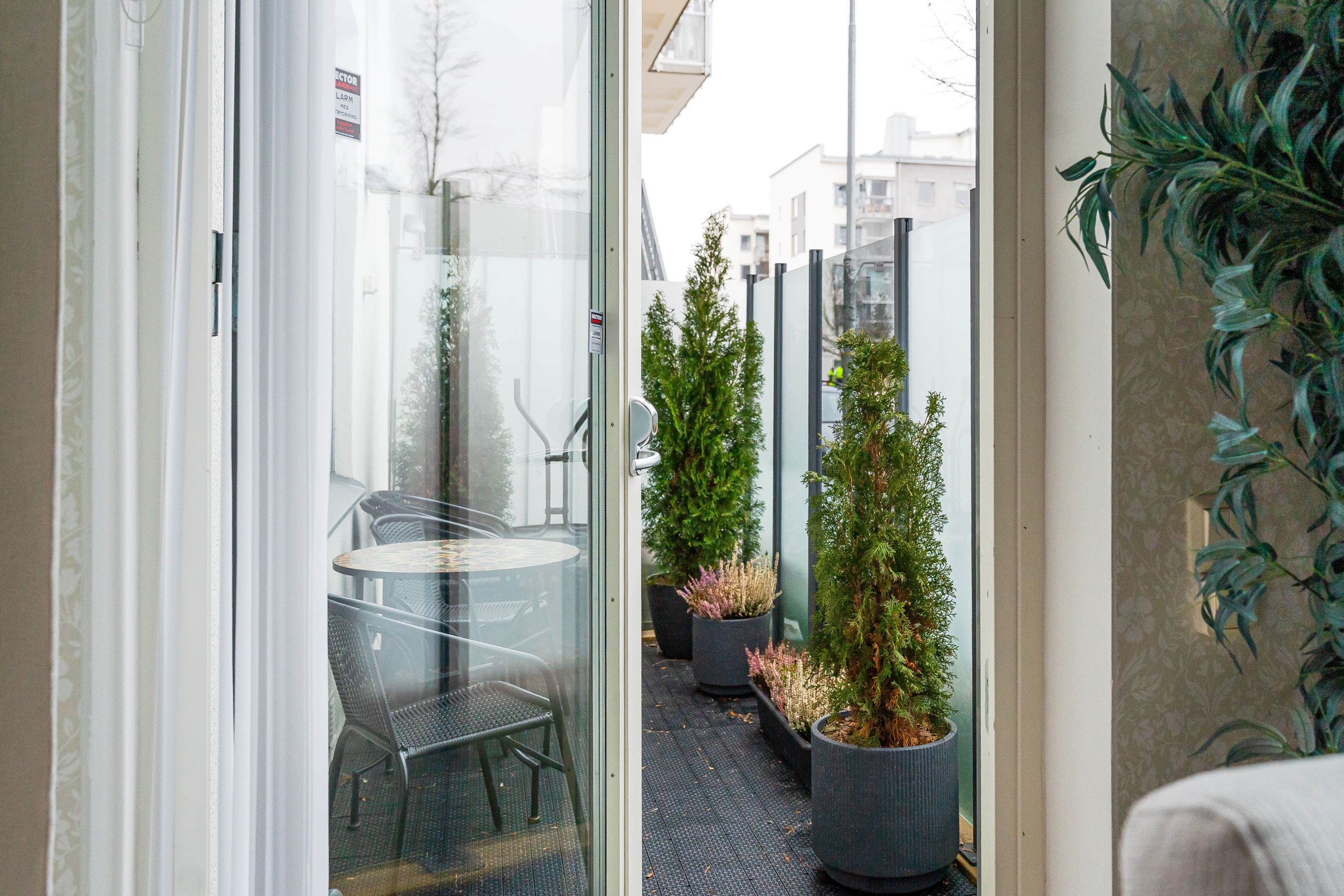 Bostaden är smakfullt tapetserad och genomgående vackra ekgolv, fönsterbrädor i marmor samt mycket välplanerad. Sovrummet är rymligt och erbjuder en praktisk och uppskattad garderobslösning med god förvaring. Från bostaden når du den inglasade uteplatsen – en förlängning av hemmet som kan nyttjas större delen av året. Den långa markisen ger både skugga och komfort under soliga dagar.