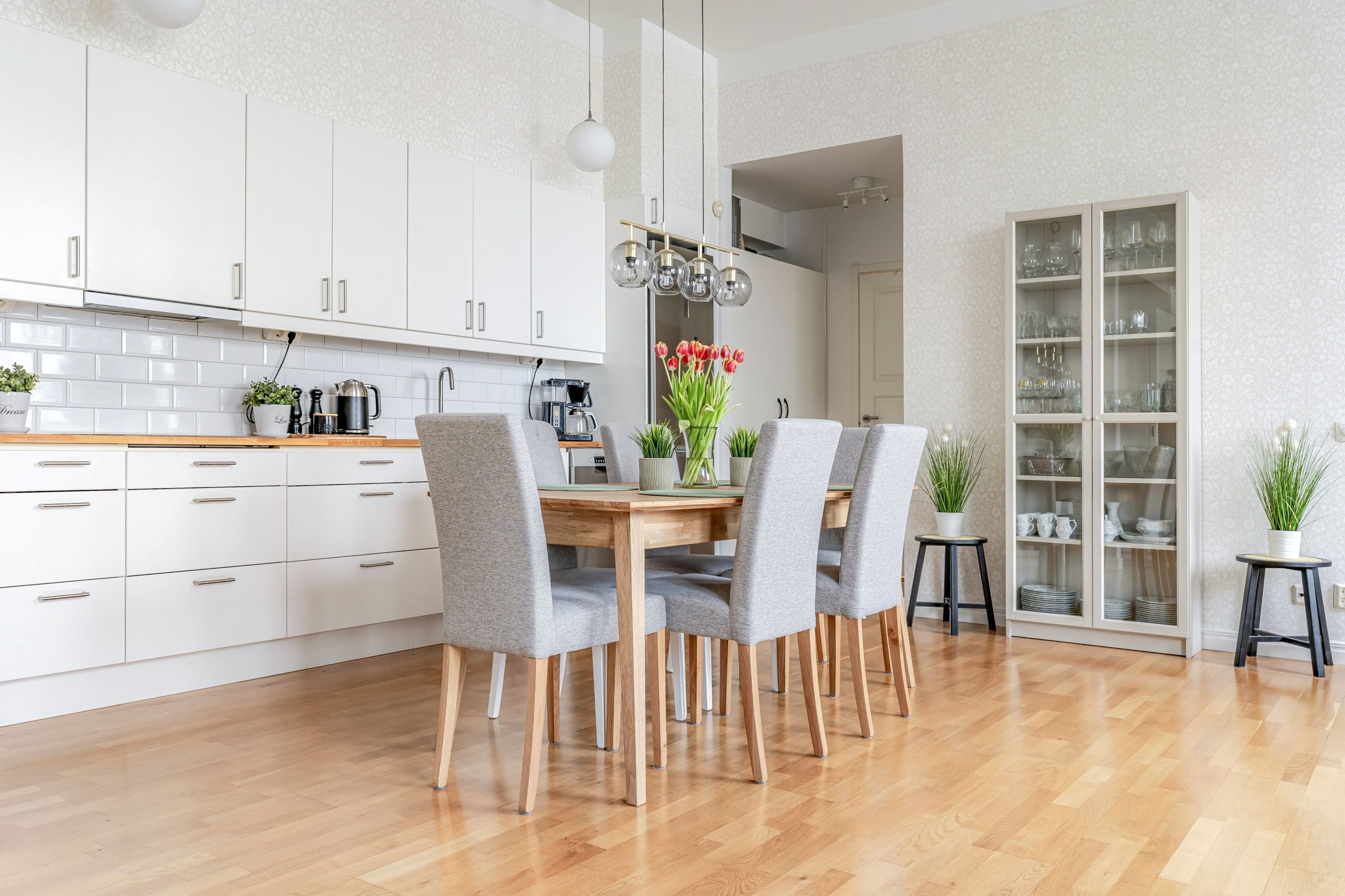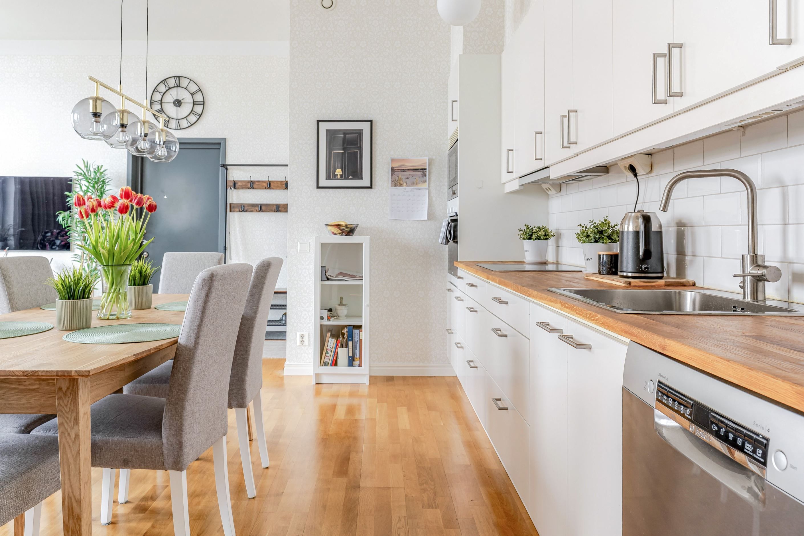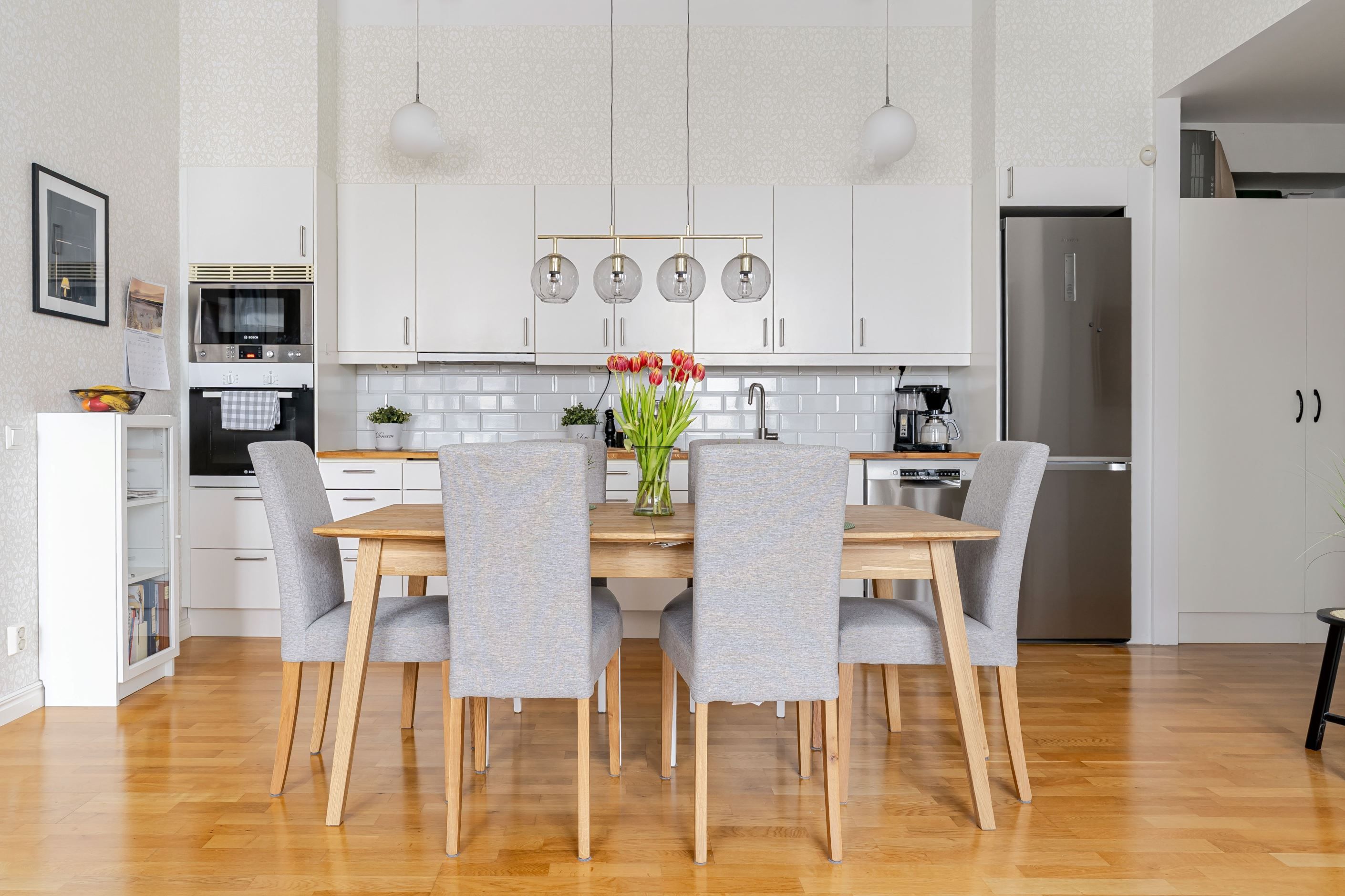 Vardagsrum och kök ligger i en öppen och social planlösning om hela 36 kvm – en yta som verkligen inbjuder till middagar, umgänge och långa kvällar i gott sällskap. Här finns gott om plats för både stort matbord och generös soffgrupp, utan att det någonsin känns trångt. Köket håller hög kvalitet med påkostade vitvaror och en stilren design som smälter perfekt in i helheten.