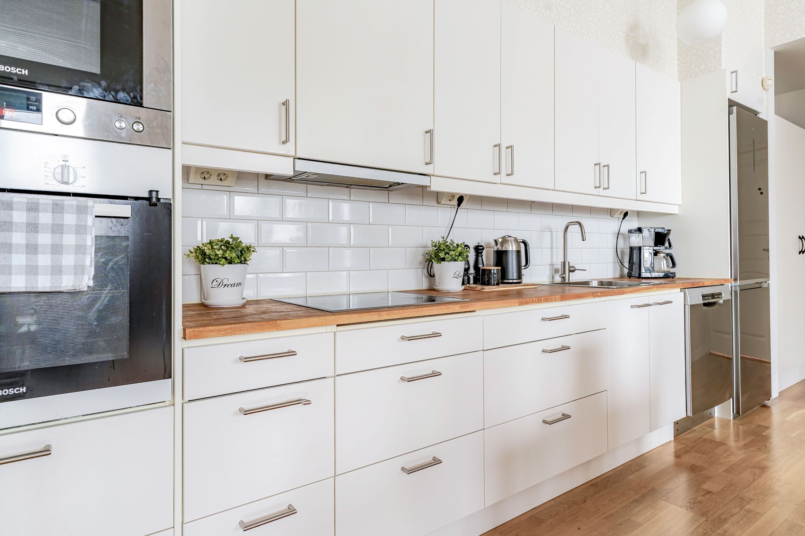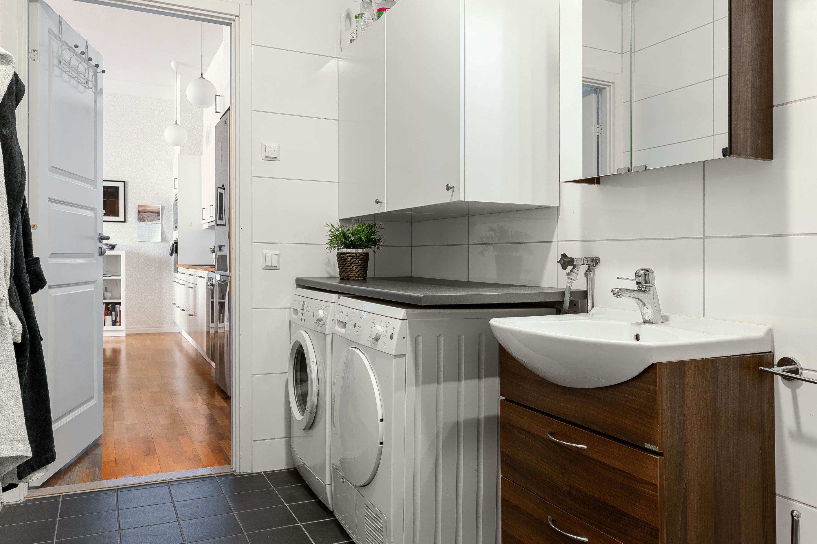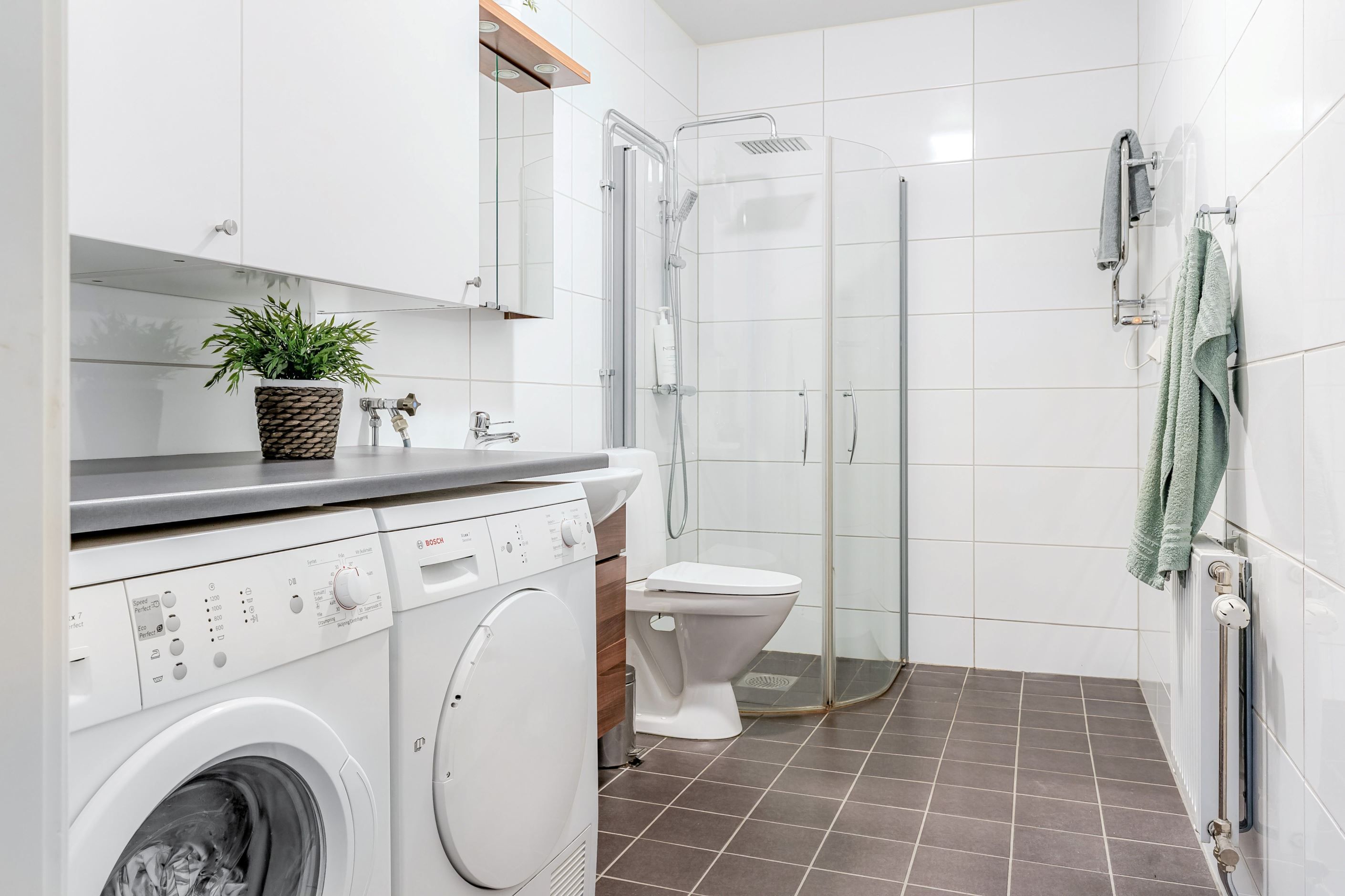 Det helkaklade badrummet är rymligt och funktionellt med bra arbetsytor, duschhörna med glasväggar samt tvättmaskin och torktumlare från Bosch – allt för en smidig vardag.
