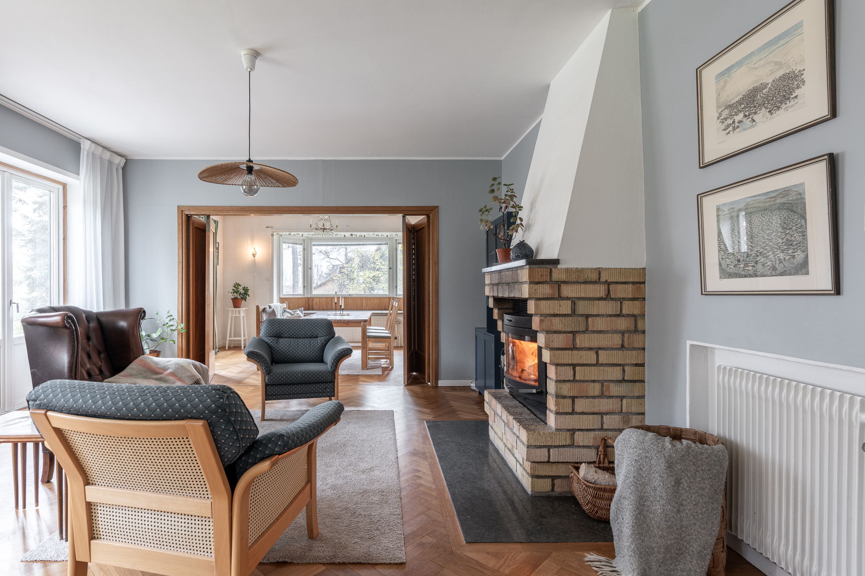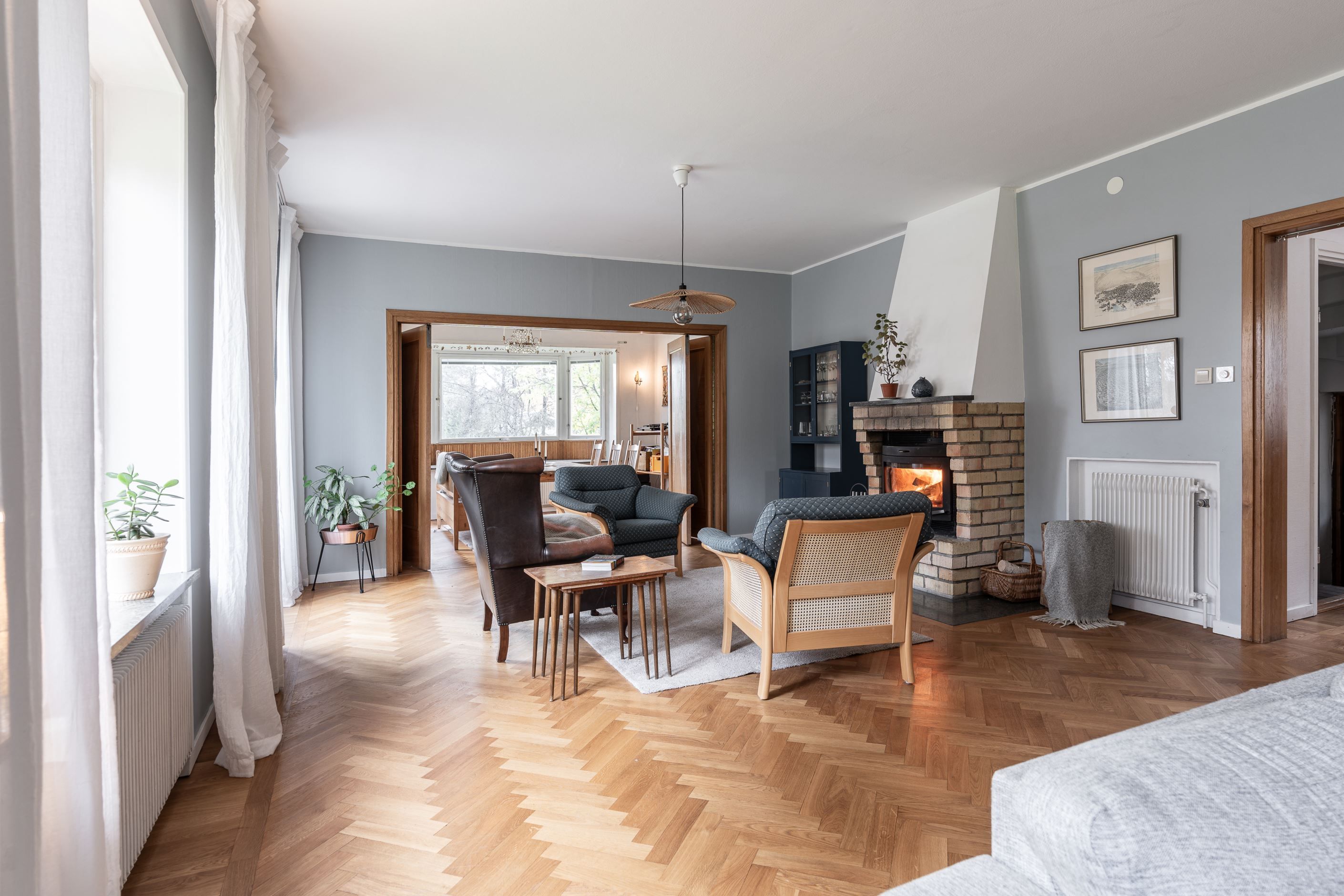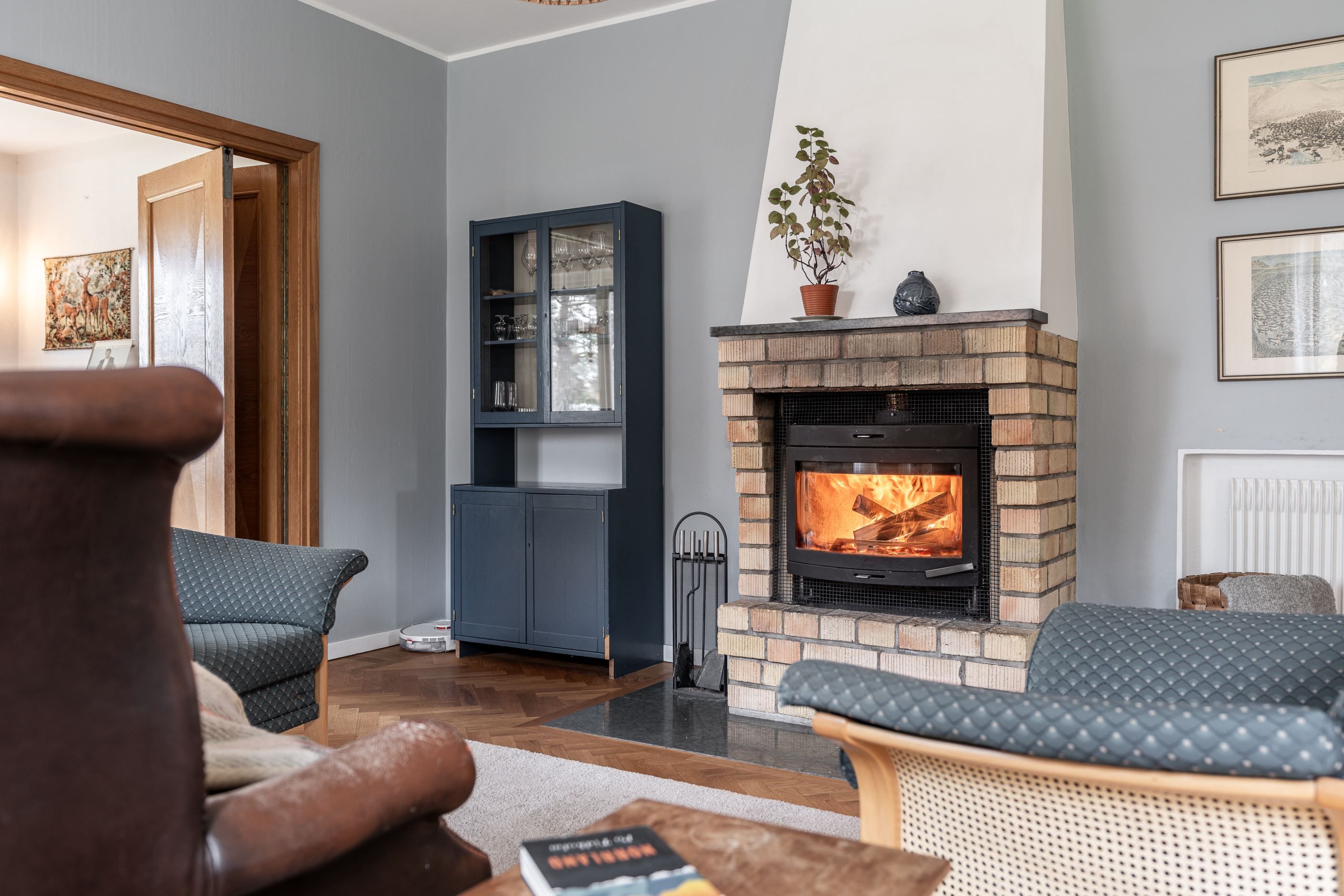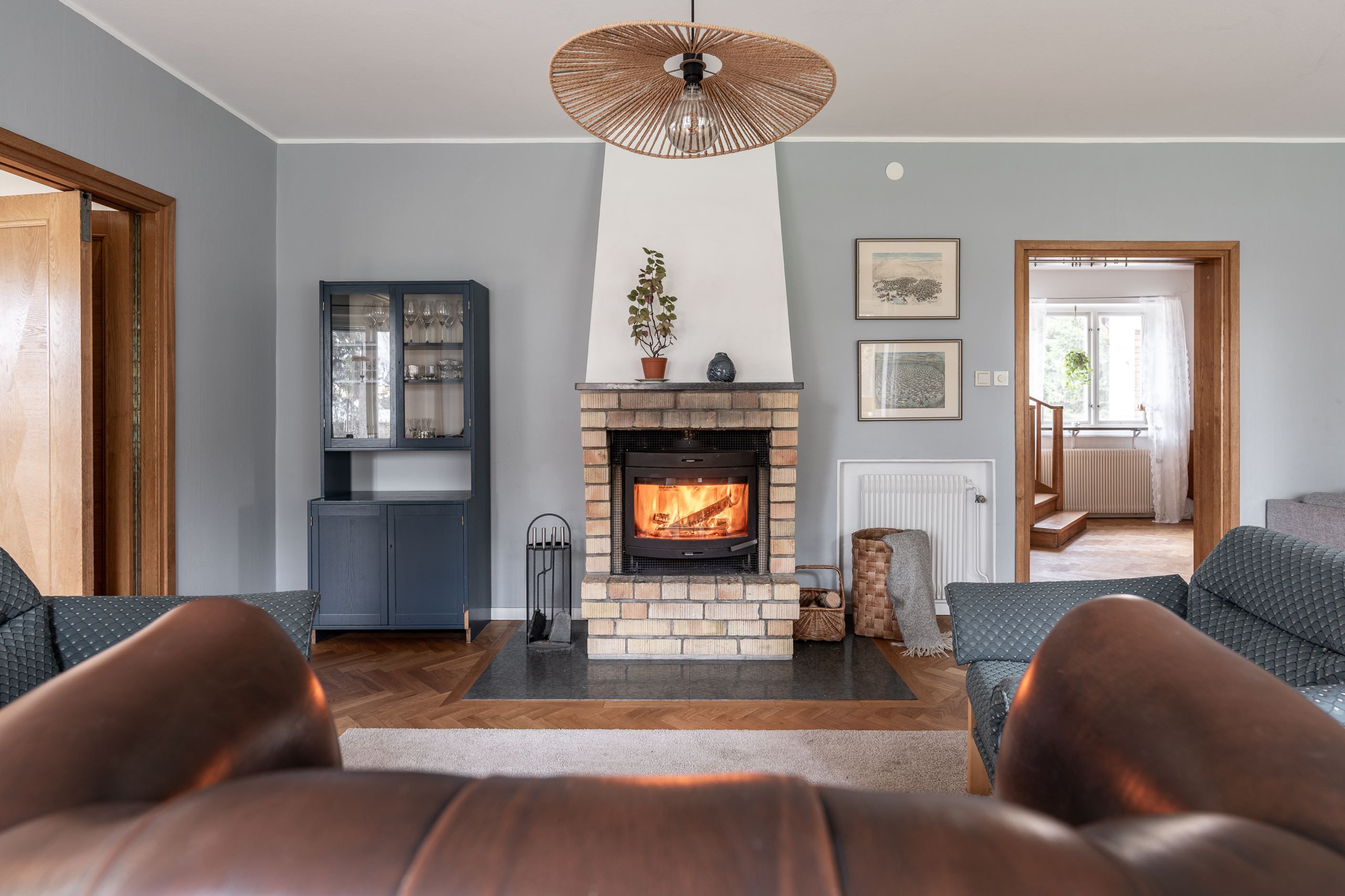 Huset bär på en historia men har samtidigt fått nytt liv! De senaste åren har det renoverats med varsam hand och badrummet fått ett modernt och stilrent utseénde, trappan har blivit vackert slipad och på hela övre plan ligger nya golv. I hallen, vardagsrummet och matsalen breder en klassisk fiskbensparkett ut sig – en detalj som direkt fångar känslan av kvalitet och tidlös elegans. Självklart finns en eldstad som bjuder på hög trivsel de kallaste dagarna och i detta hemmet behöver man inte tulla på något då ytan är väldigt generös.