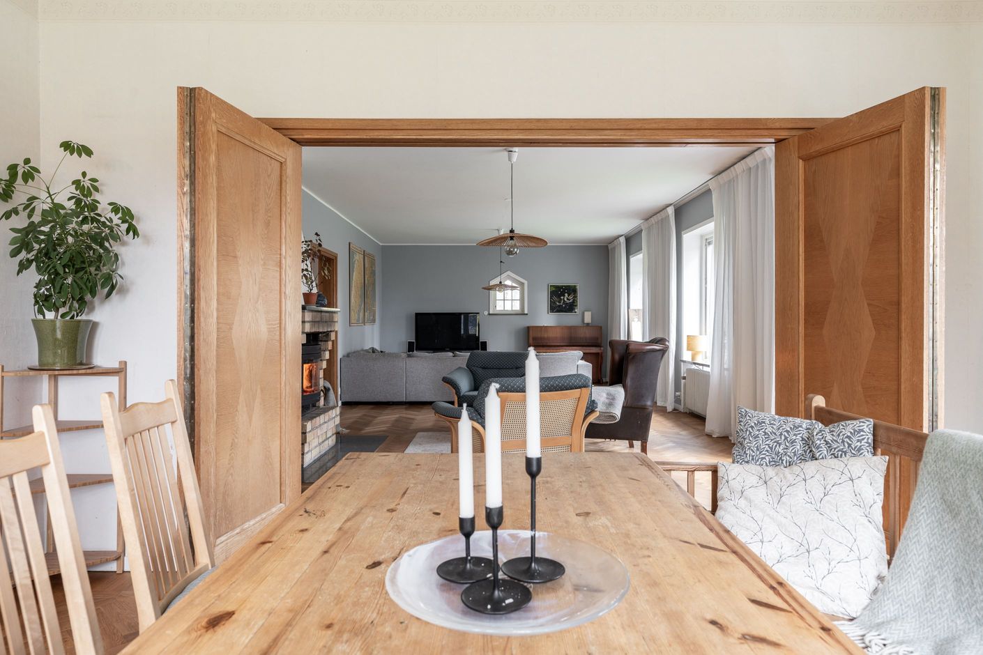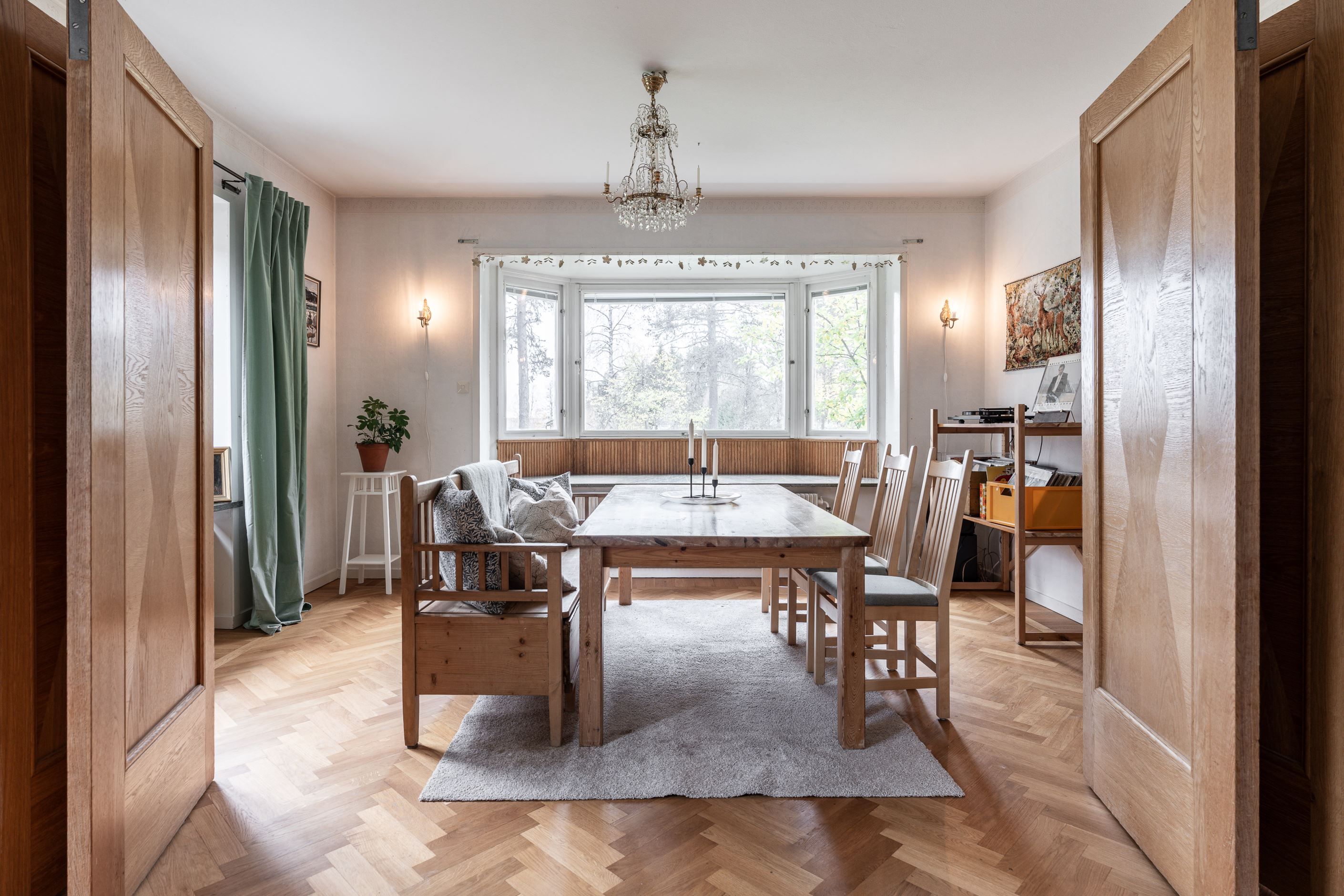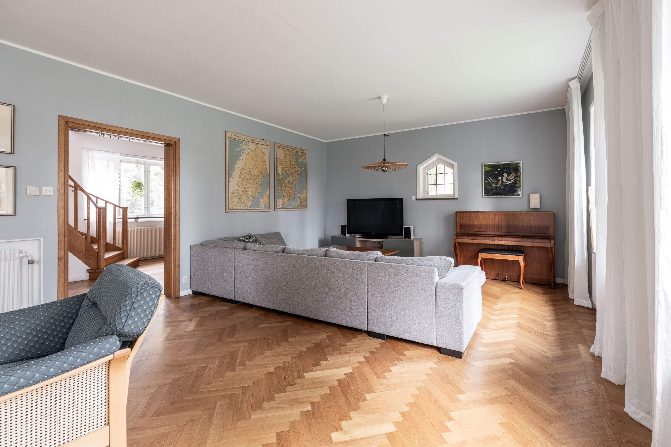 Huset bär på en historia men har samtidigt fått nytt liv! De senaste åren har det renoverats med varsam hand och badrummet fått ett modernt och stilrent utseénde, trappan har blivit vackert slipad och på hela övre plan ligger nya golv. I hallen, vardagsrummet och matsalen breder en klassisk fiskbensparkett ut sig – en detalj som direkt fångar känslan av kvalitet och tidlös elegans. Självklart finns en eldstad som bjuder på hög trivsel de kallaste dagarna och i detta hemmet behöver man inte tulla på något då ytan är väldigt generös.