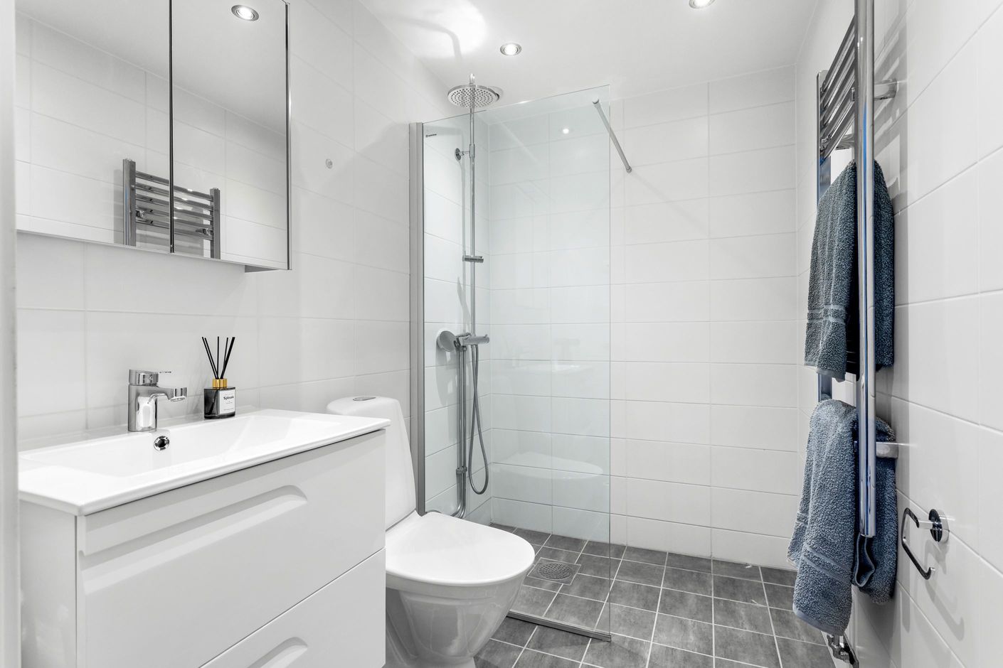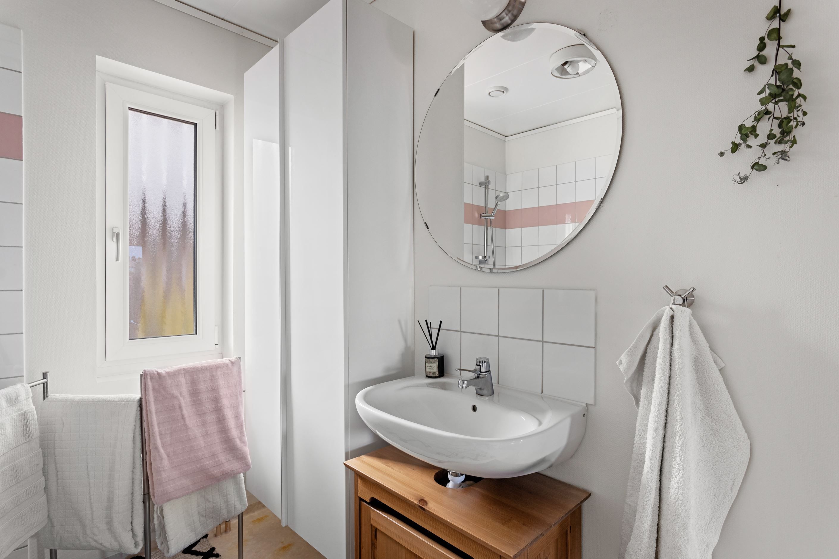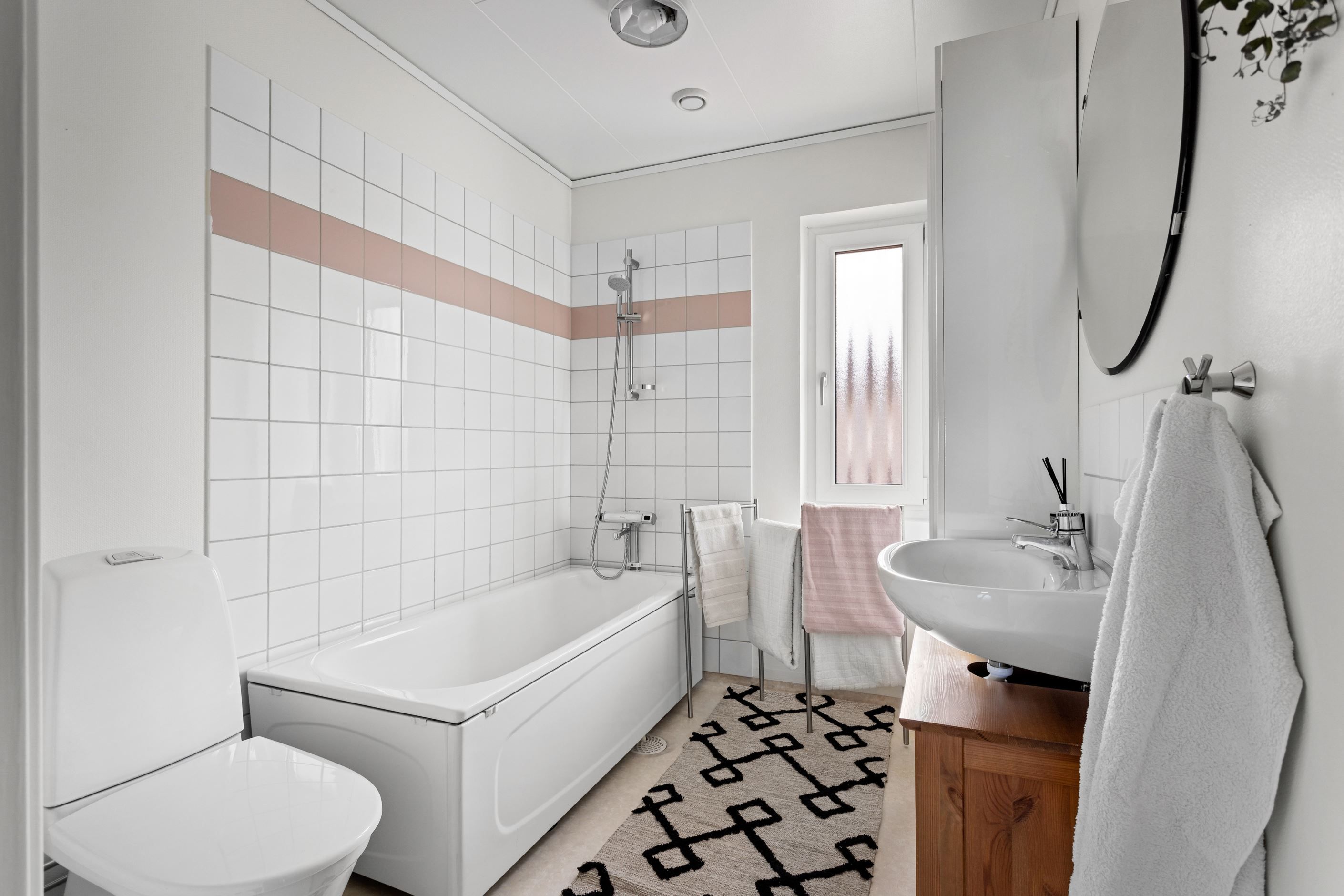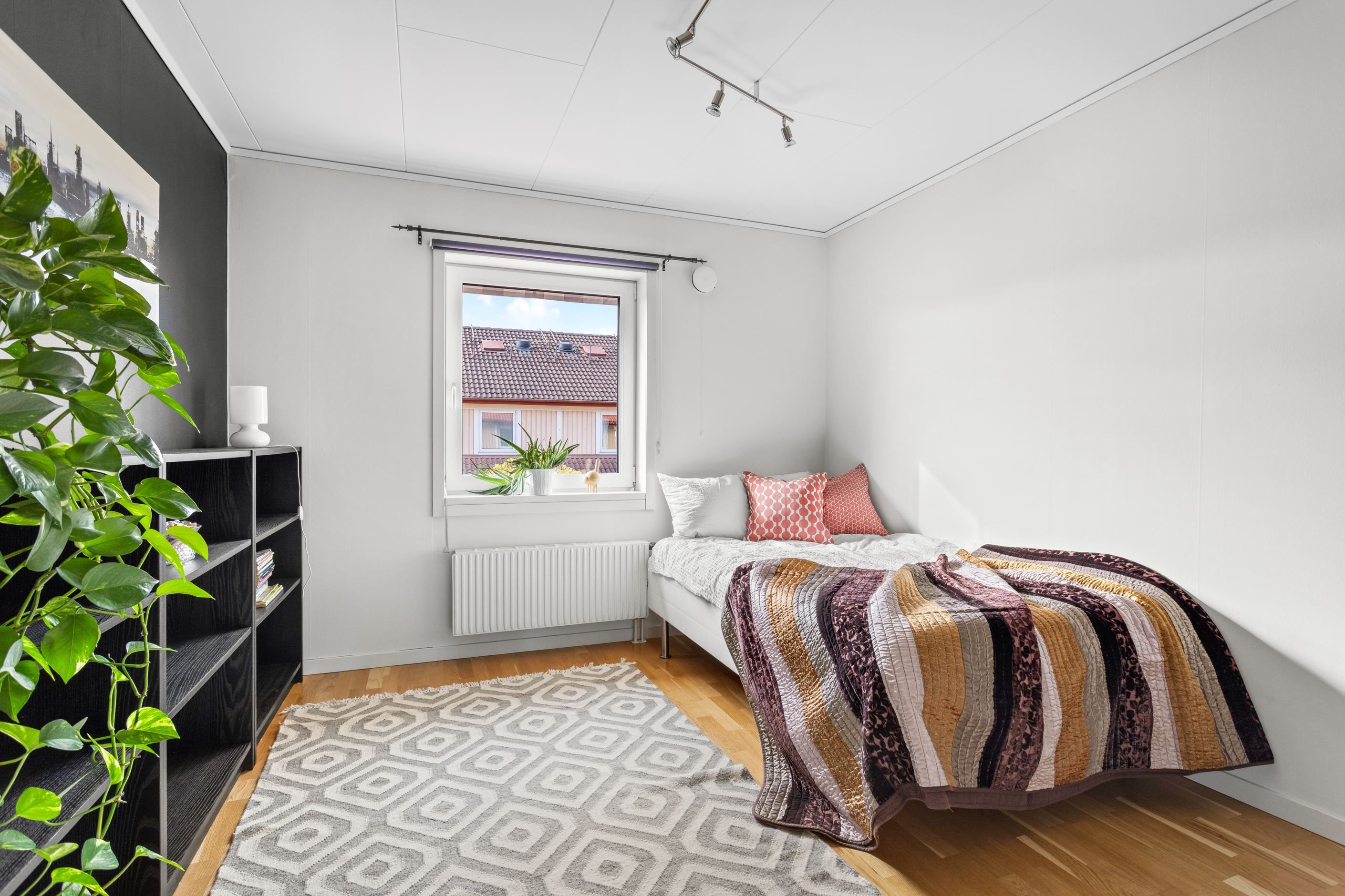 Från vardagsrummet nås bostadens härliga uteplats. Här finns plats för både matbord och grill och övriga utomhus möblemang i ostört läge. Tillbaka in i bostaden på samma våningsplan finner ni ett modernt wc/badrum med stilfulla färger och utanför entrédörren finner ni en till uteplats i soligt läge.