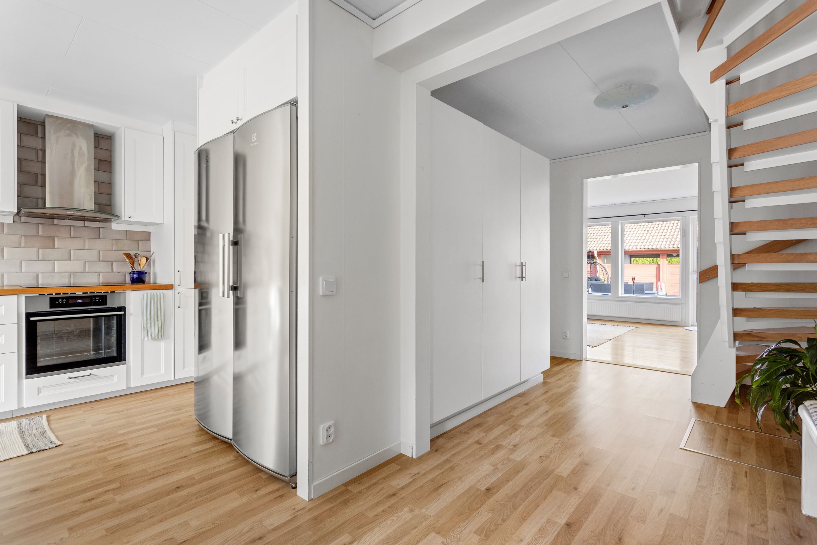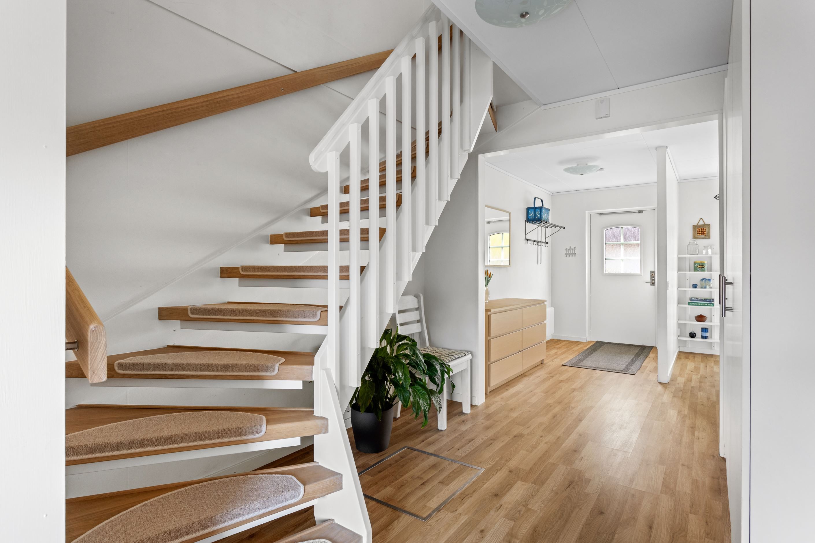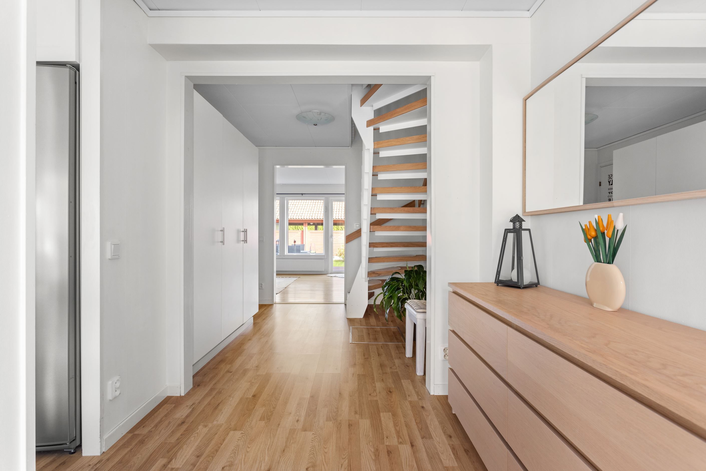 När ni tar första steget in genom entrédörren blir ni genast omfamnad av den inbjudande hallen som vägleder er in till samtliga rum på entréplan. I hallen finns det gott om förvaring och avhängning möjligheter. I anslutning till hallen finner ni hemmets nav, nämligen köket. Här finner ni ett stilrent och modernt kök med matplats för ca 4-6 personer. Köket blir den perfekta platsen att utvidga era kulinariska mat kunskaper framför vänner och bekanta. Intill köket finner ni en egen tvättstuga med tvättpelare som underlättar vardagens bestyr. Vidare på entréplan nås den ljusa och härliga vardagsrummet som inbjuder till sociala tillställningar med familj och vänner.