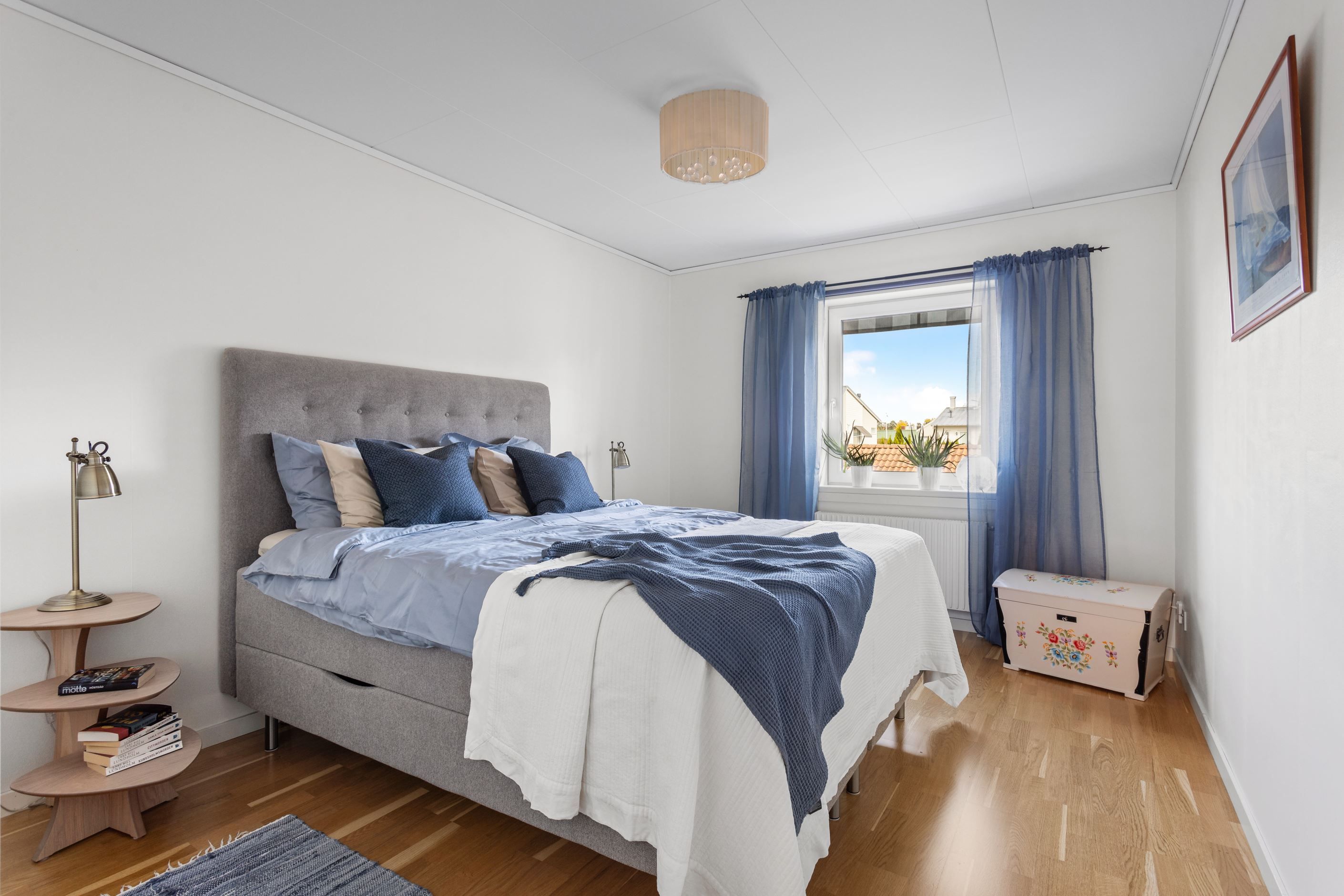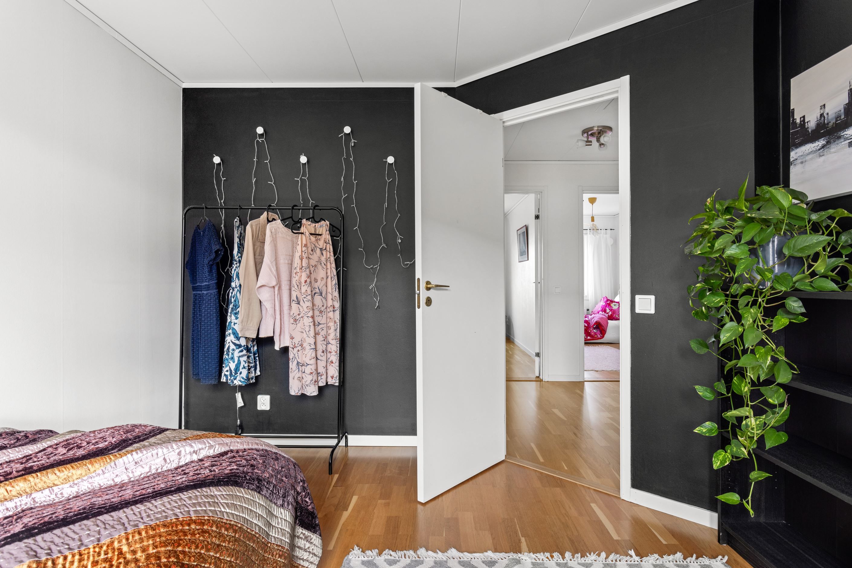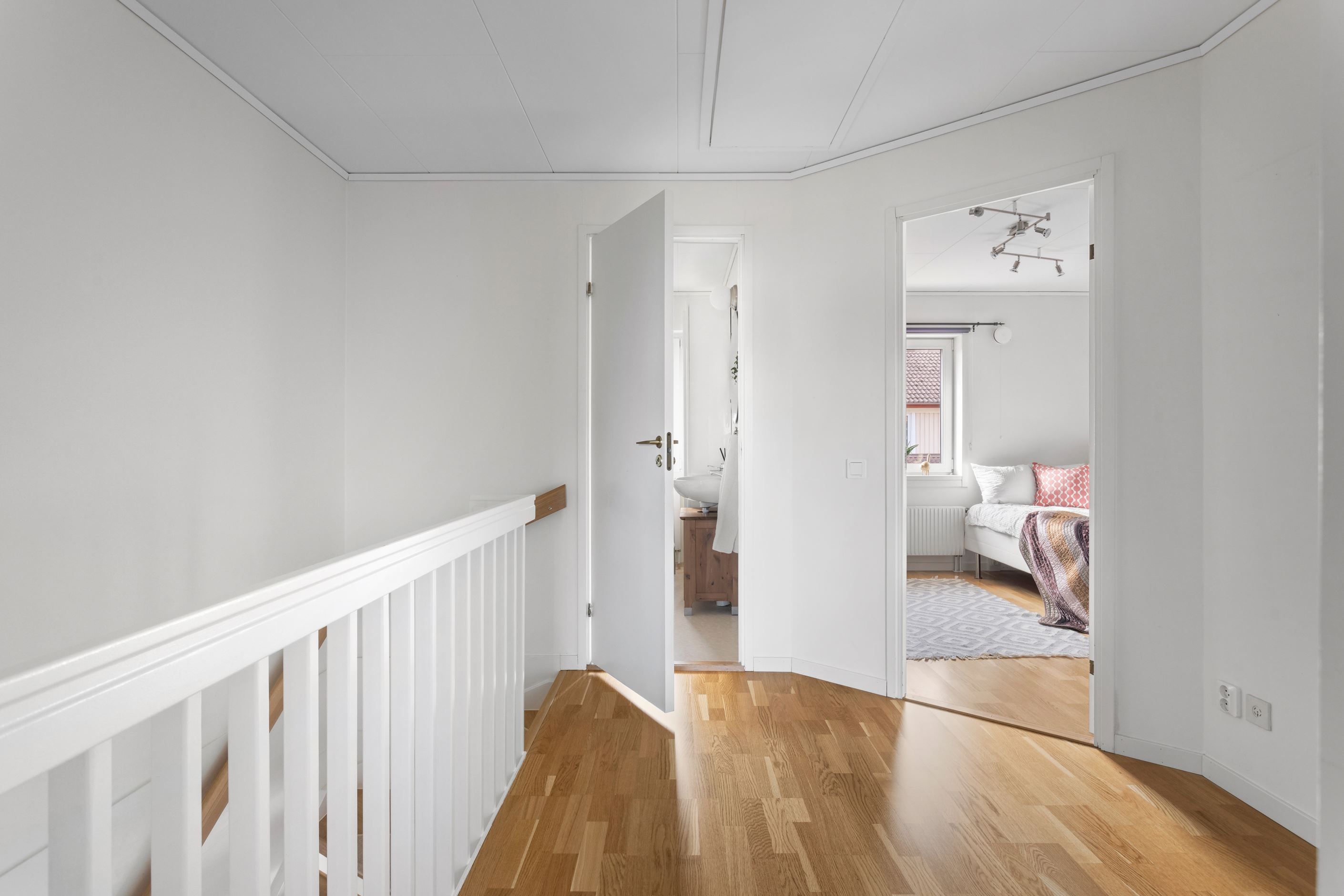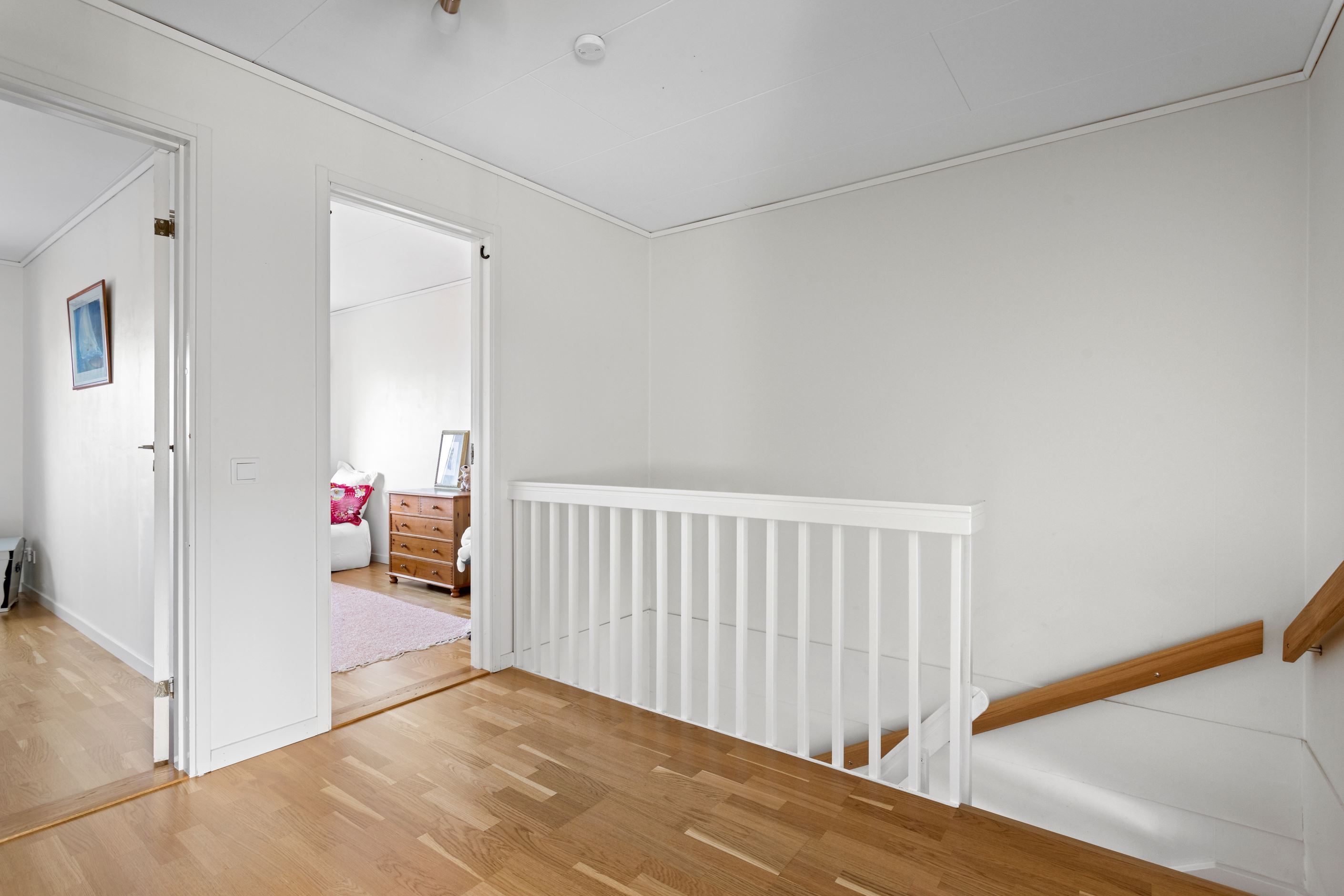 En trappa upp kommer ni fram till familjens privata avdelning. Här erbjuds två generösa sovrum och ett mindre sovrum. Här finns det plats för säng, garderober och övriga möblemang. På övre plan finner ni även ett stort wc/badrum och en klädkammare intill sovrummen.