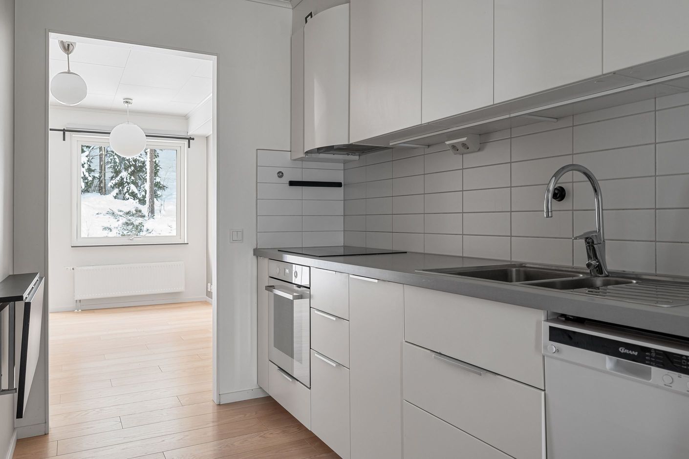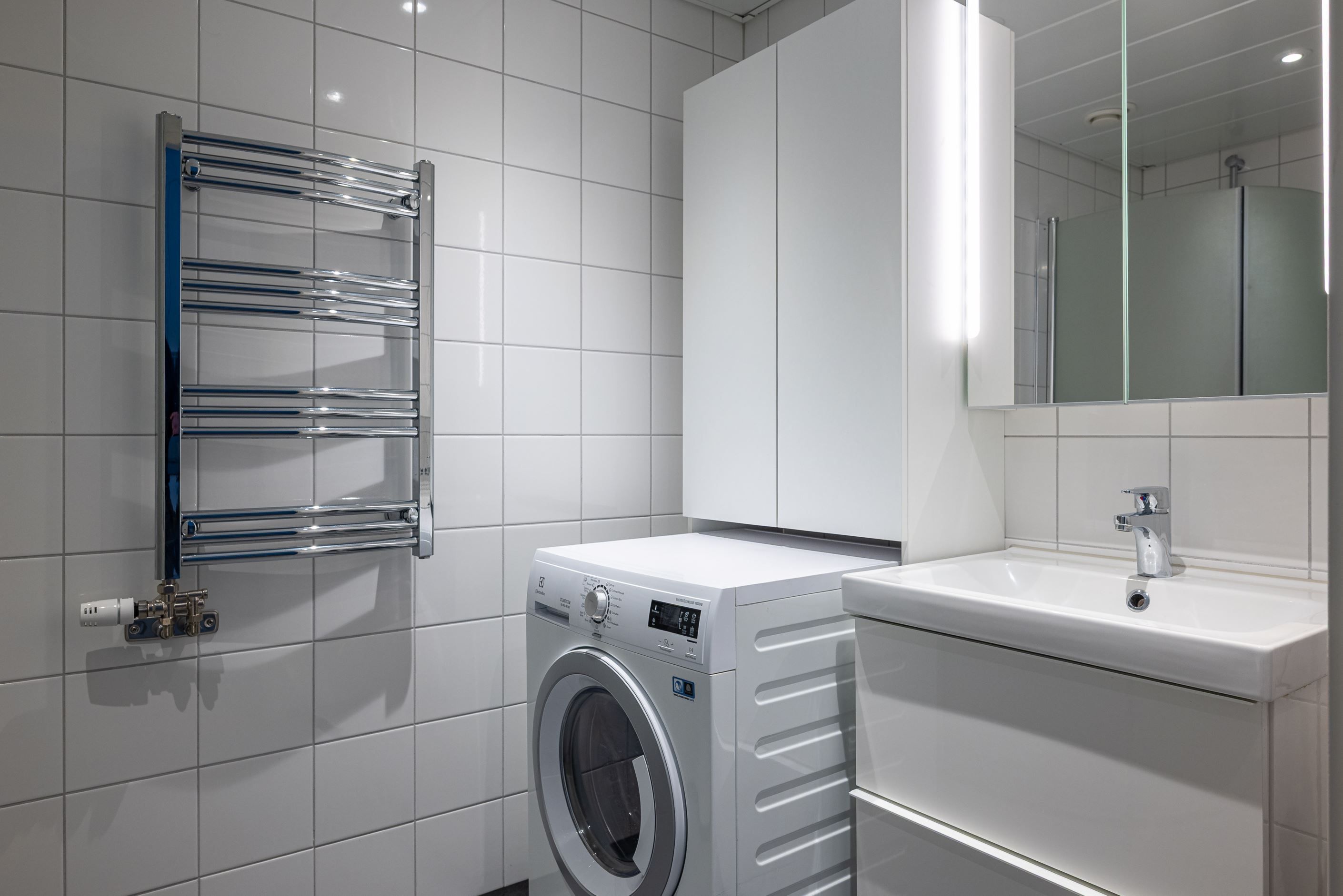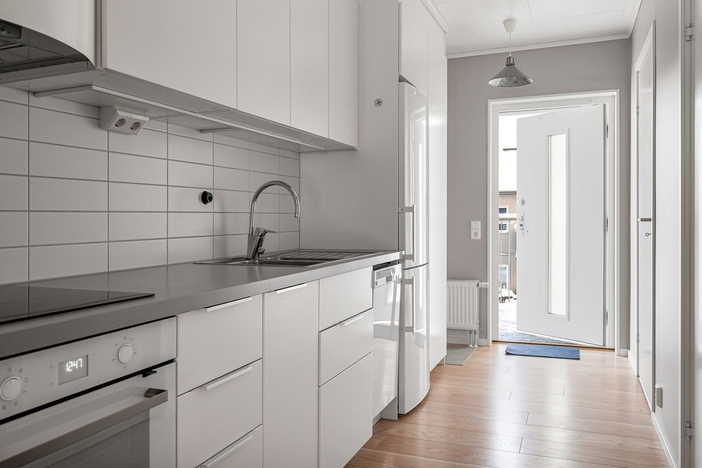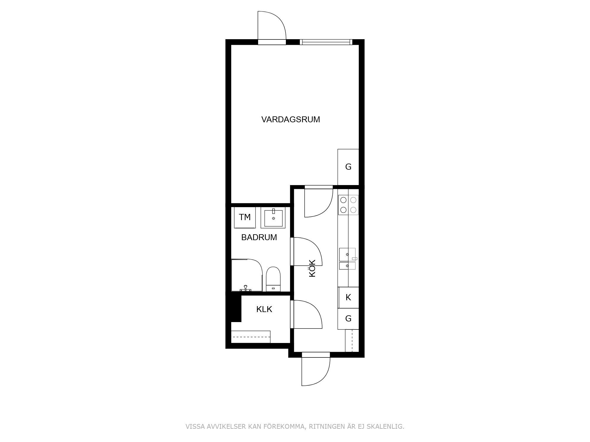 Egen ingång till hall med plats för avhägning, direkt till vänster finns en rymlig klädkammare/förråd. Köksdel med vita skåpsluckor, kyl/frys, spishäll, diskmaskin samt ugn. Från köket når ni sedan allrum med garderober och plats för både säng och soffa. Här finns även en fransk balkong. Stort badrum med våtrumsmatta och helkaklade vita väggar, duschhörna med duschväggar i glas, wc, handfat med kommod och tvättmaskin.