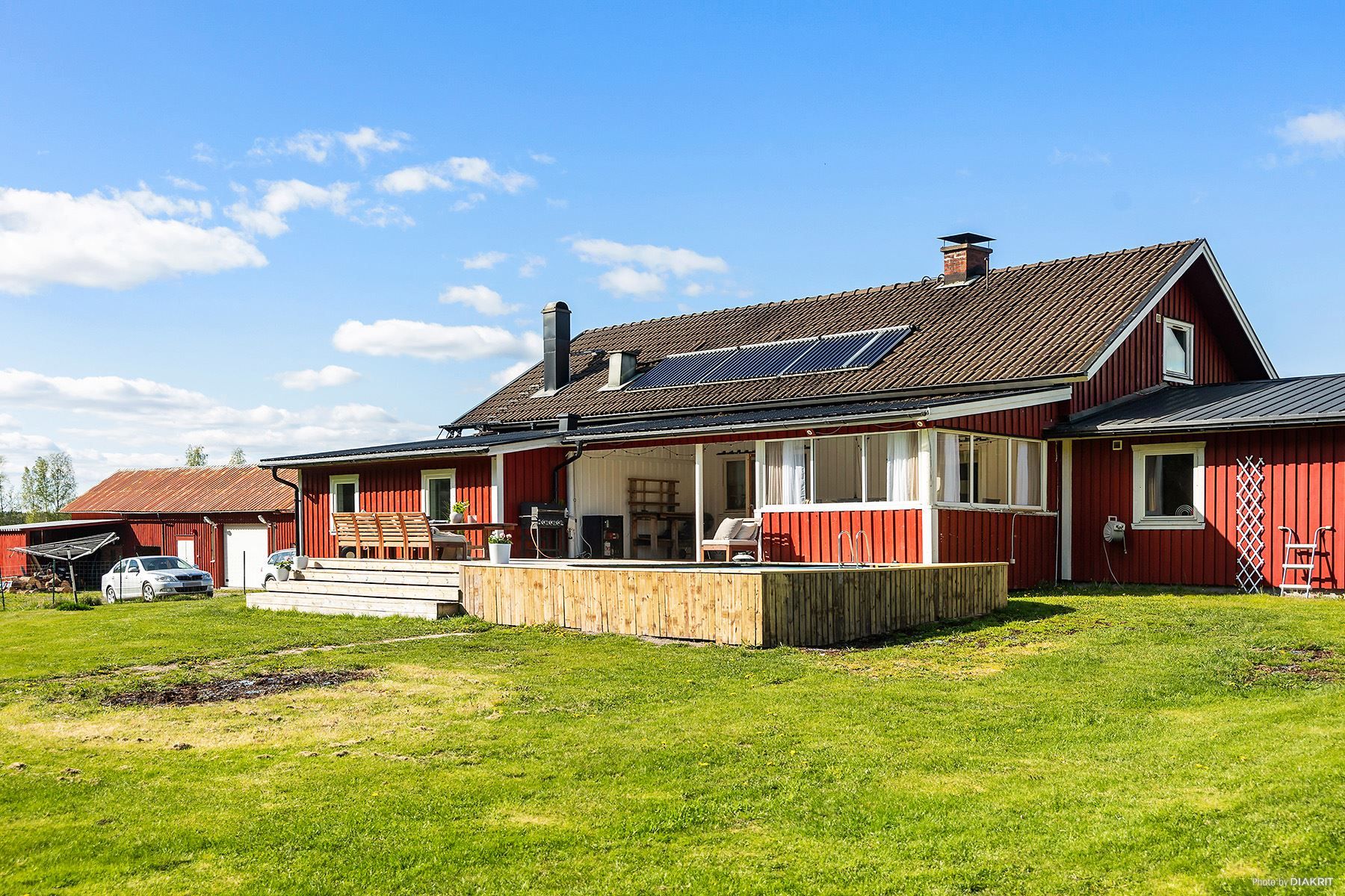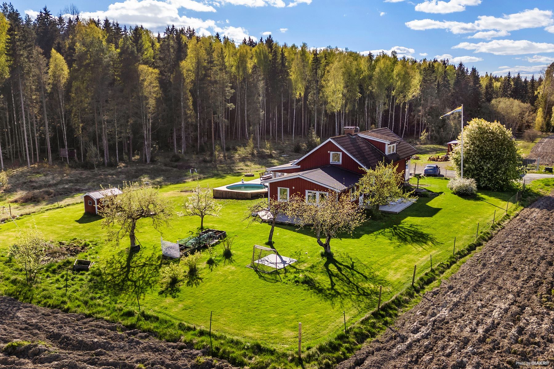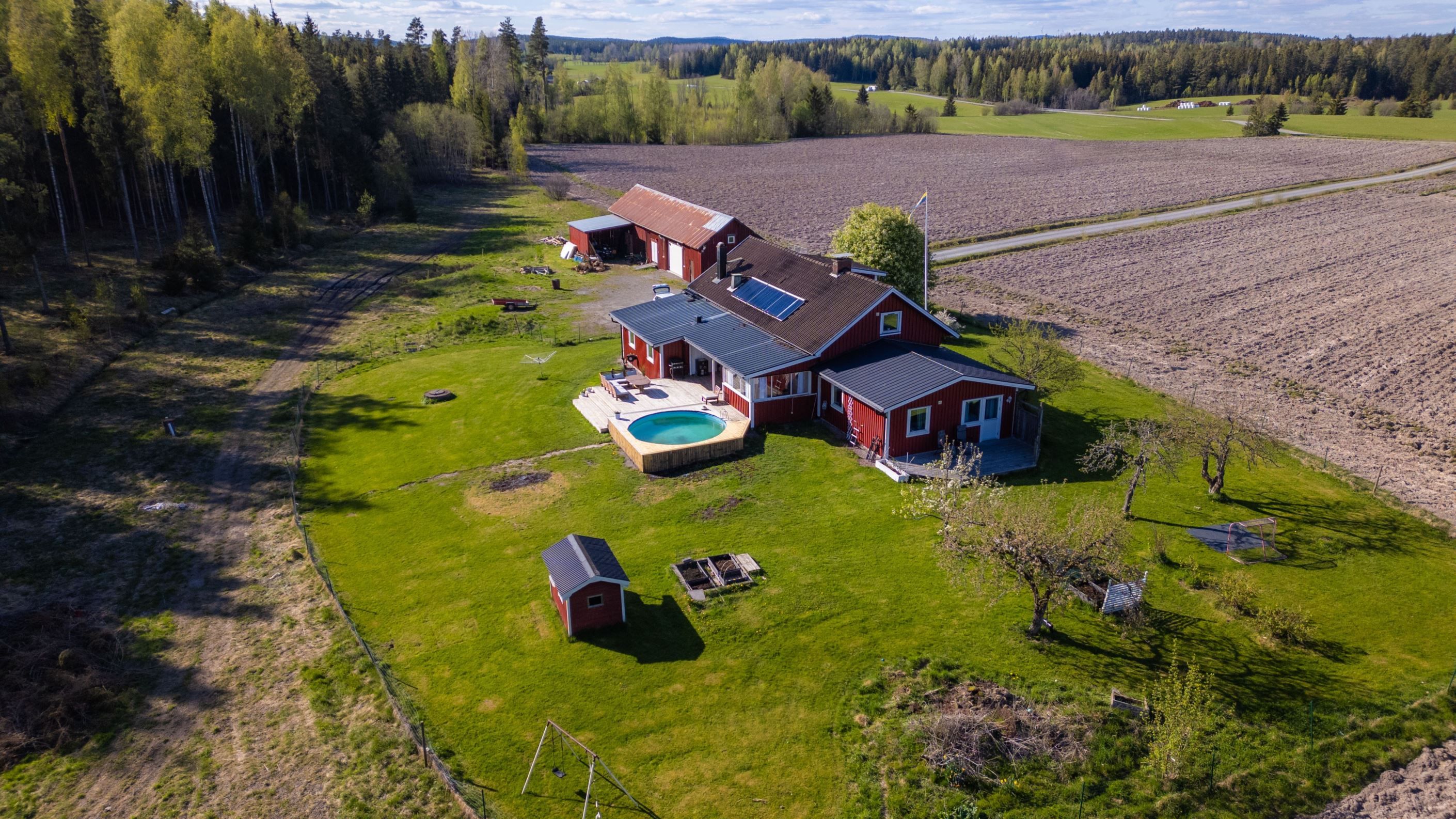 Charmig gård med rött hus, pool och uthus – lantligt läge med naturen som granne