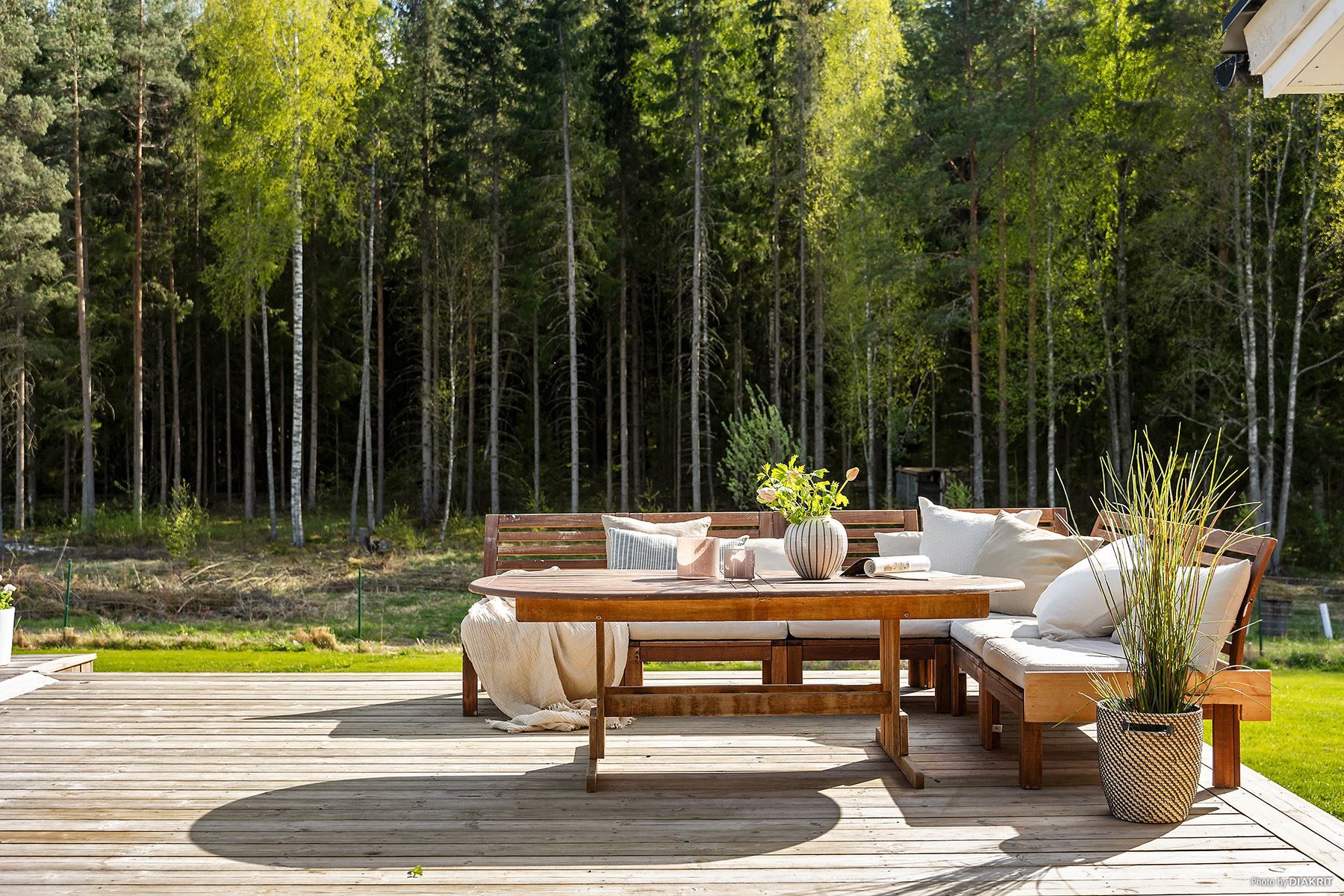 Trädgården är minst lika tilltalande som interiören. Här finns flera uteplatser som följer solen under dagen och på baksidan väntar ett stort trädäck med infälld pool – en idealisk plats för sommarens svalka och trevligt umgänge. Tomten är vackert anlagd med odlingar, lekyta och plats för kreativa trädgårdsprojekt.