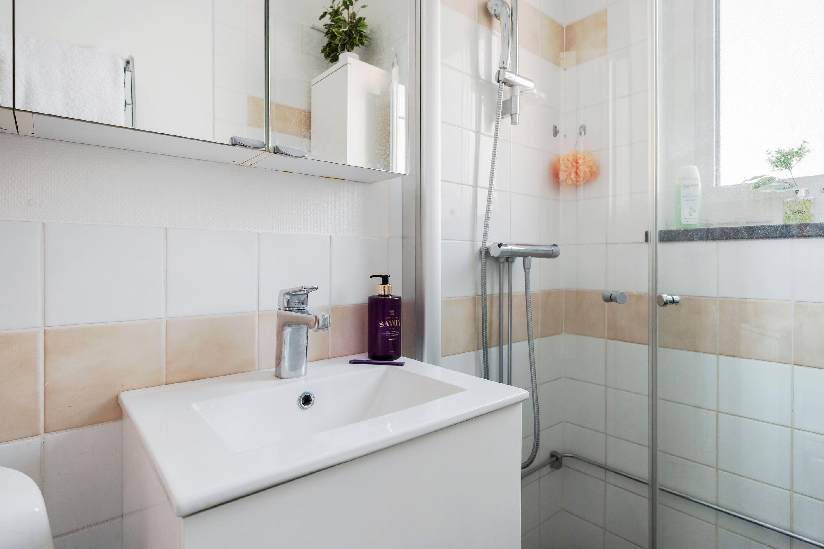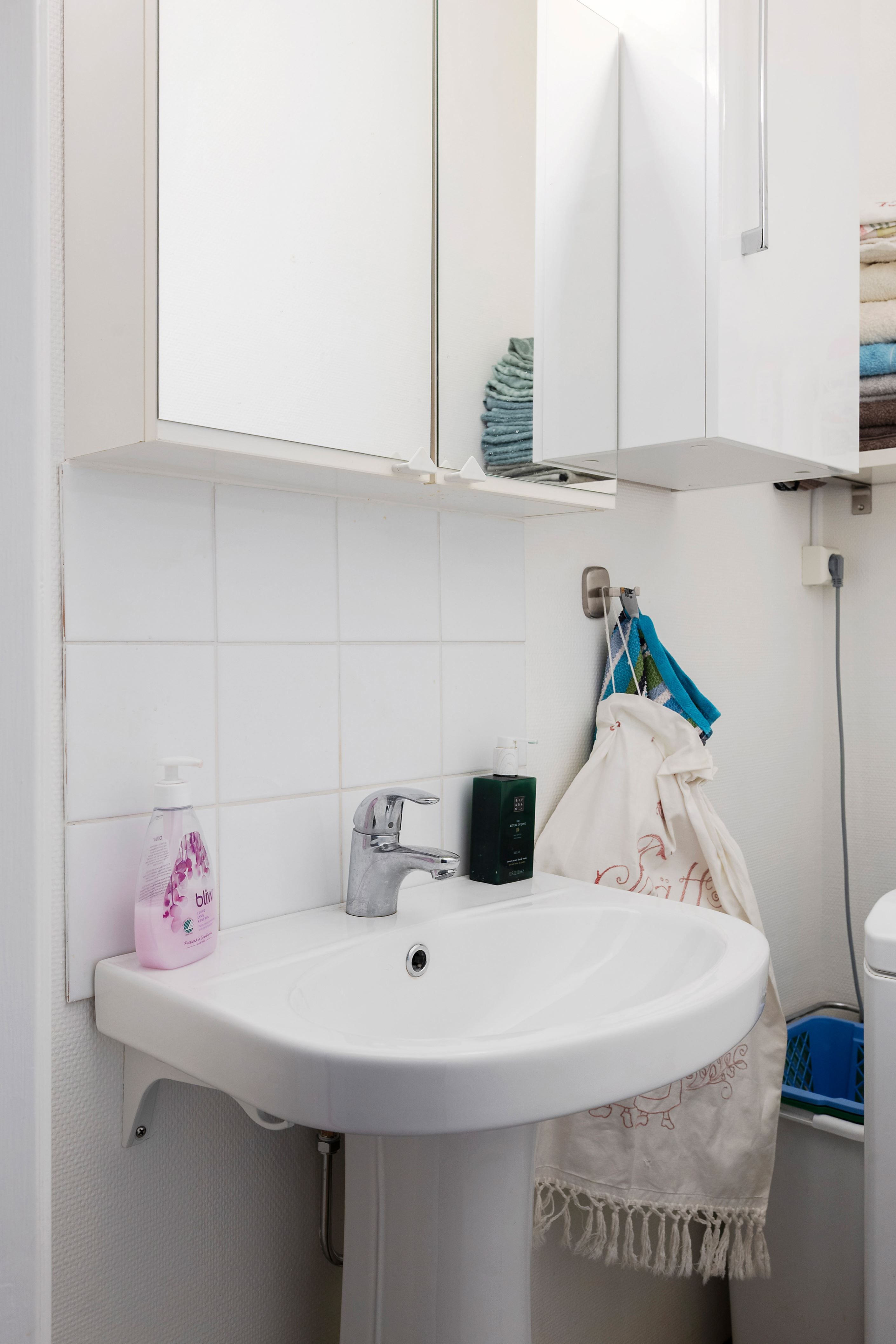Vidare finns ett badrum med kaklade väggar samt en praktisk, mindre wc. Genom hela bostaden löper ett enhetligt parkettgolv och de ljusa ytskikten skapar en modern och harmonisk helhet.