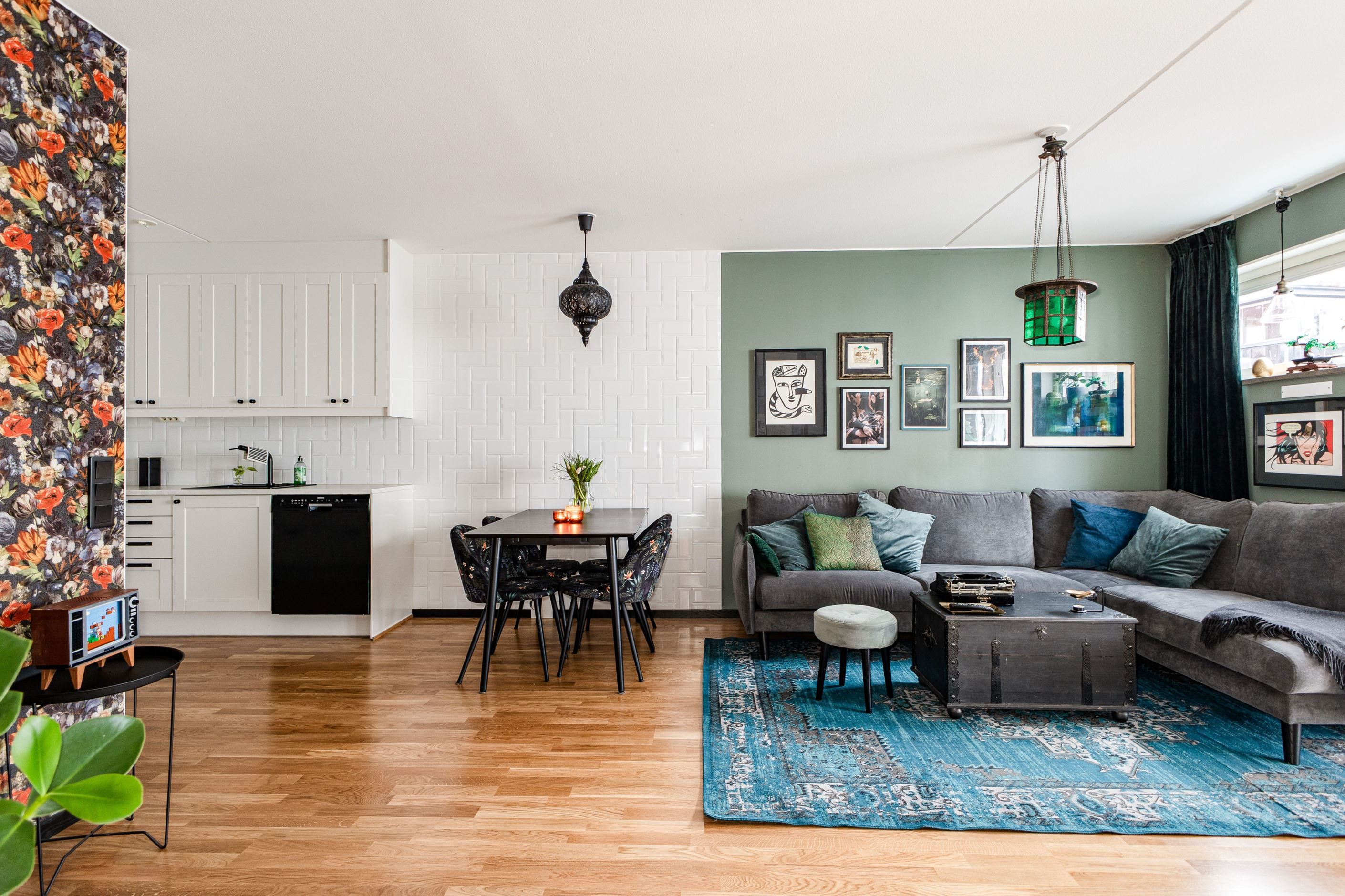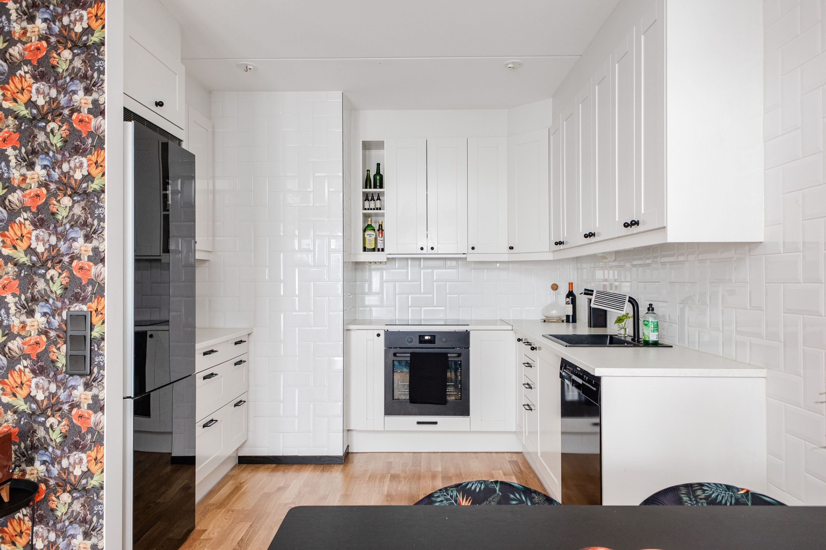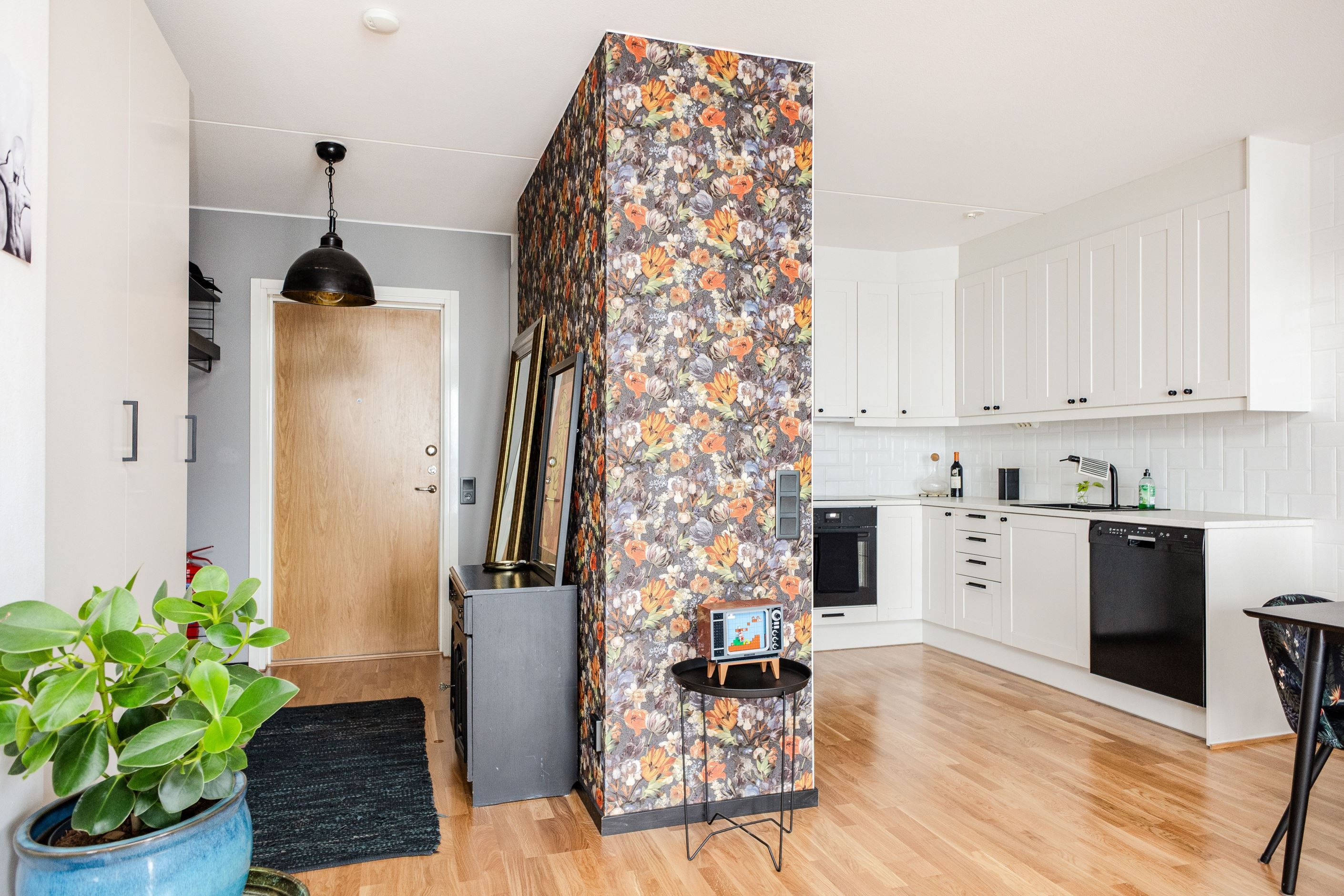 Redan i hallen välkomnas du av en varm och inbjudande atmosfär, där den smakfulla tapeten sätter tonen för resten av bostaden. Det moderna köket imponerar med sin stilrena design, smarta förvaringslösningar och generösa arbetsytor som gör matlagningen både enkel och lustfylld. Tack vare den öppna planlösningen mot vardagsrummet får matplatsen en naturlig och central position, vilket skapar en social och trivsam helhet. Vardagsrummet erbjuder gott om utrymme för avkoppling, umgänge och stunder du minns. Från vardagsrummet når du den stora inglasade balkongen i optimalt västerläge - en fantastisk förlängning av hemmet. Här njuter du av soliga eftermiddagar, ljumma kvällar och rogivande stunder långt in på sensommaren.