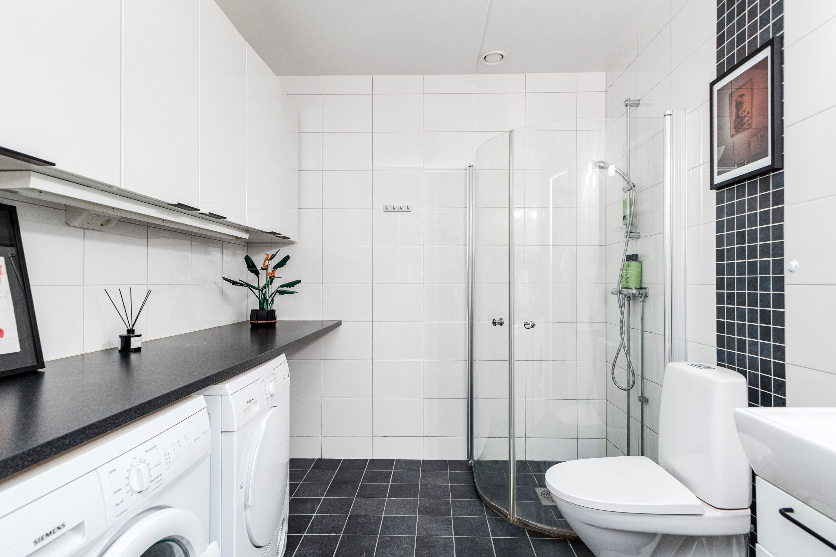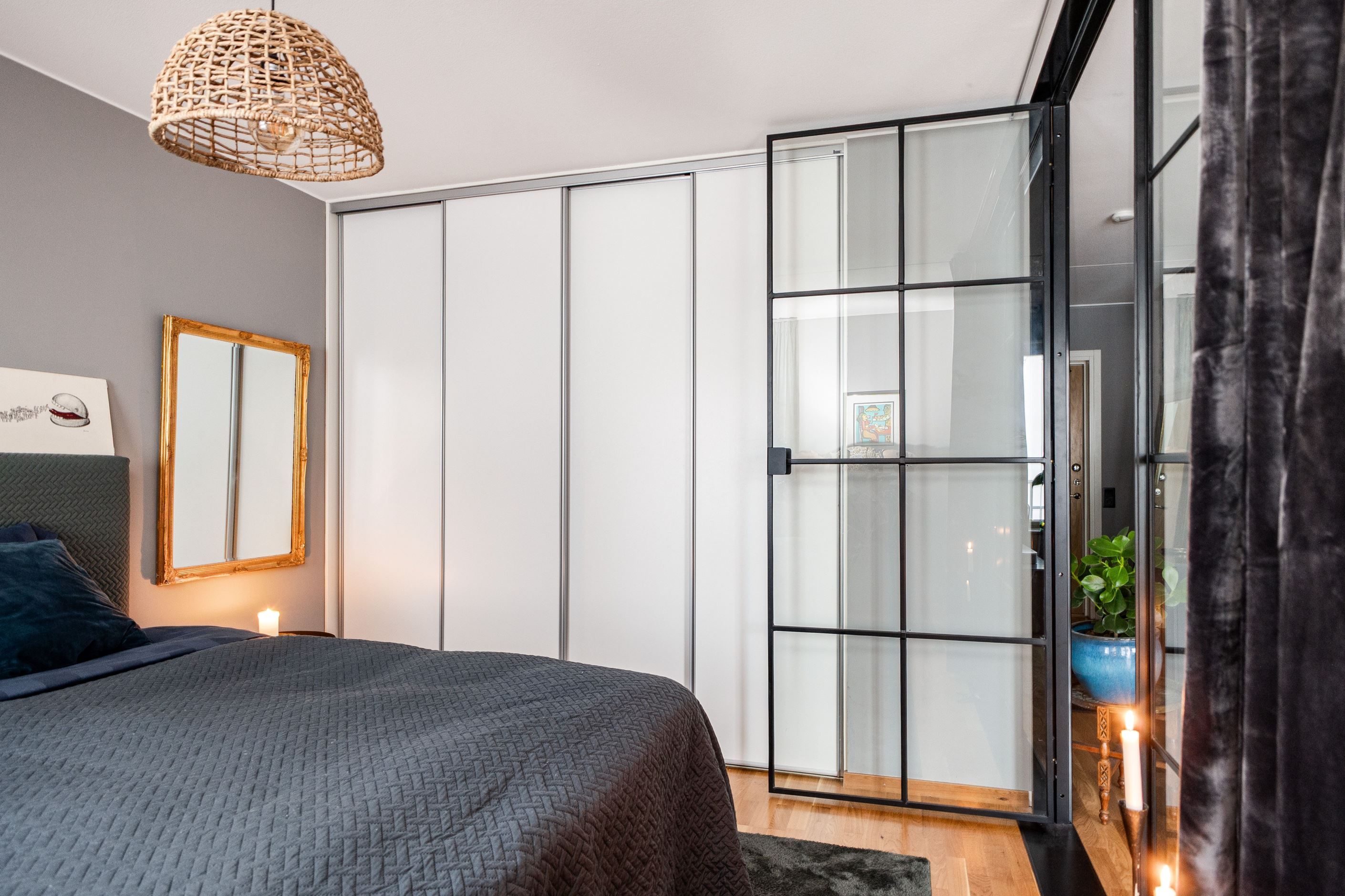 Genom den stilfulla industriglasväggen tar du dig vidare till det rogivande sovrummet, utrustat med praktiska skjutdörrsgarderober som erbjuder utmärkt förvaring. Vidare finner du ett helkaklat badrum som dessutom är utrustat med smart klädvård och tvättmöjligheter för en bekväm vardag.