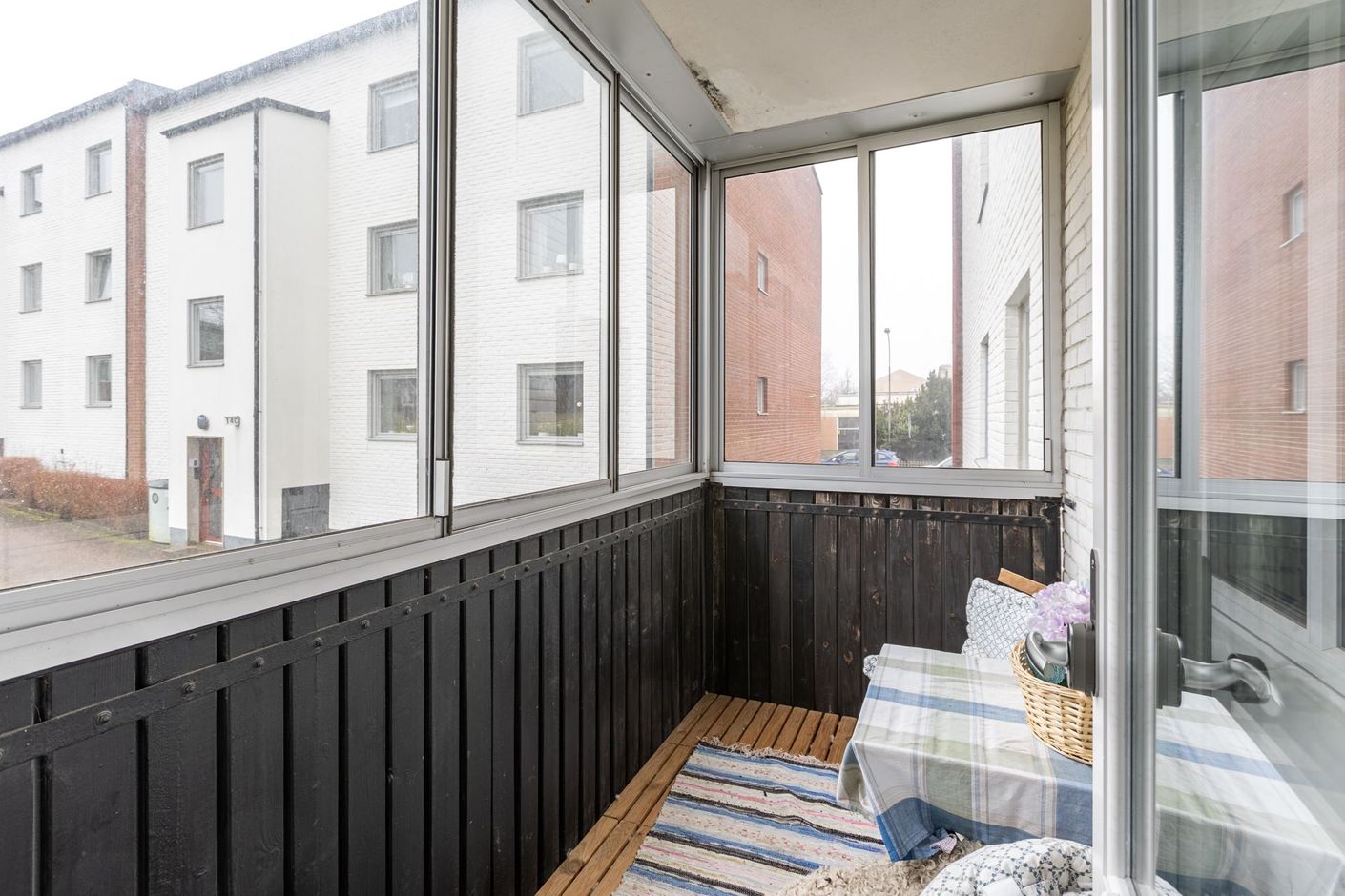 Hallen erbjuder gott om förvaring med flera garderober. Det helkaklade badrummet är utrustat med duschhörna, toalett och handfat med spegel. Vardagsrummet har plats för både soffgrupp och säng. Här finns möjlighet att avskilja med gardin eller bygg upp en praktisk vägg. Härifrån når du även den inglasade balkongen – en perfekt plats att njuta av året om och ett extrarum på vintern.