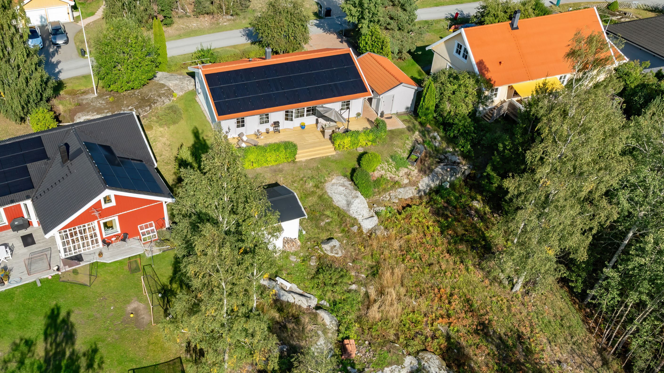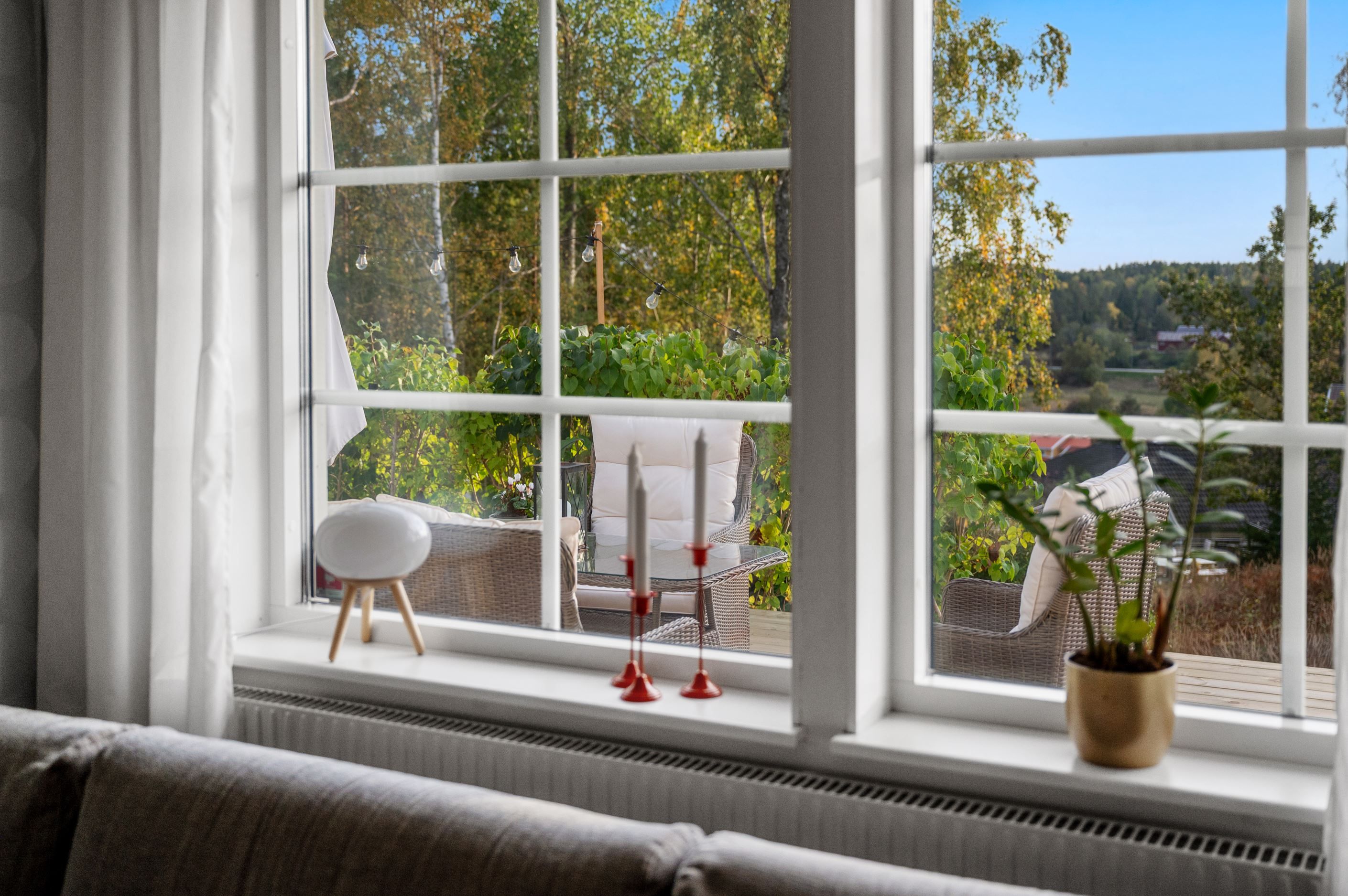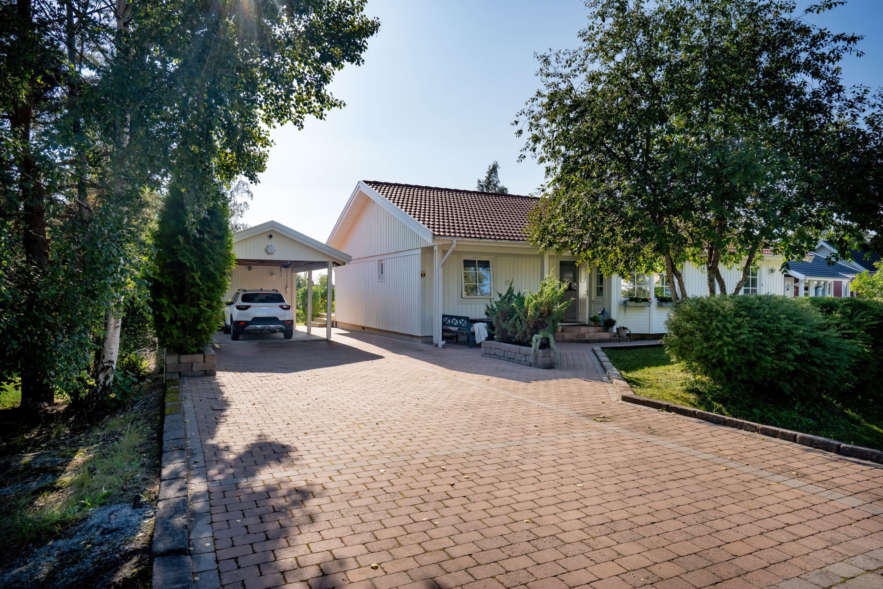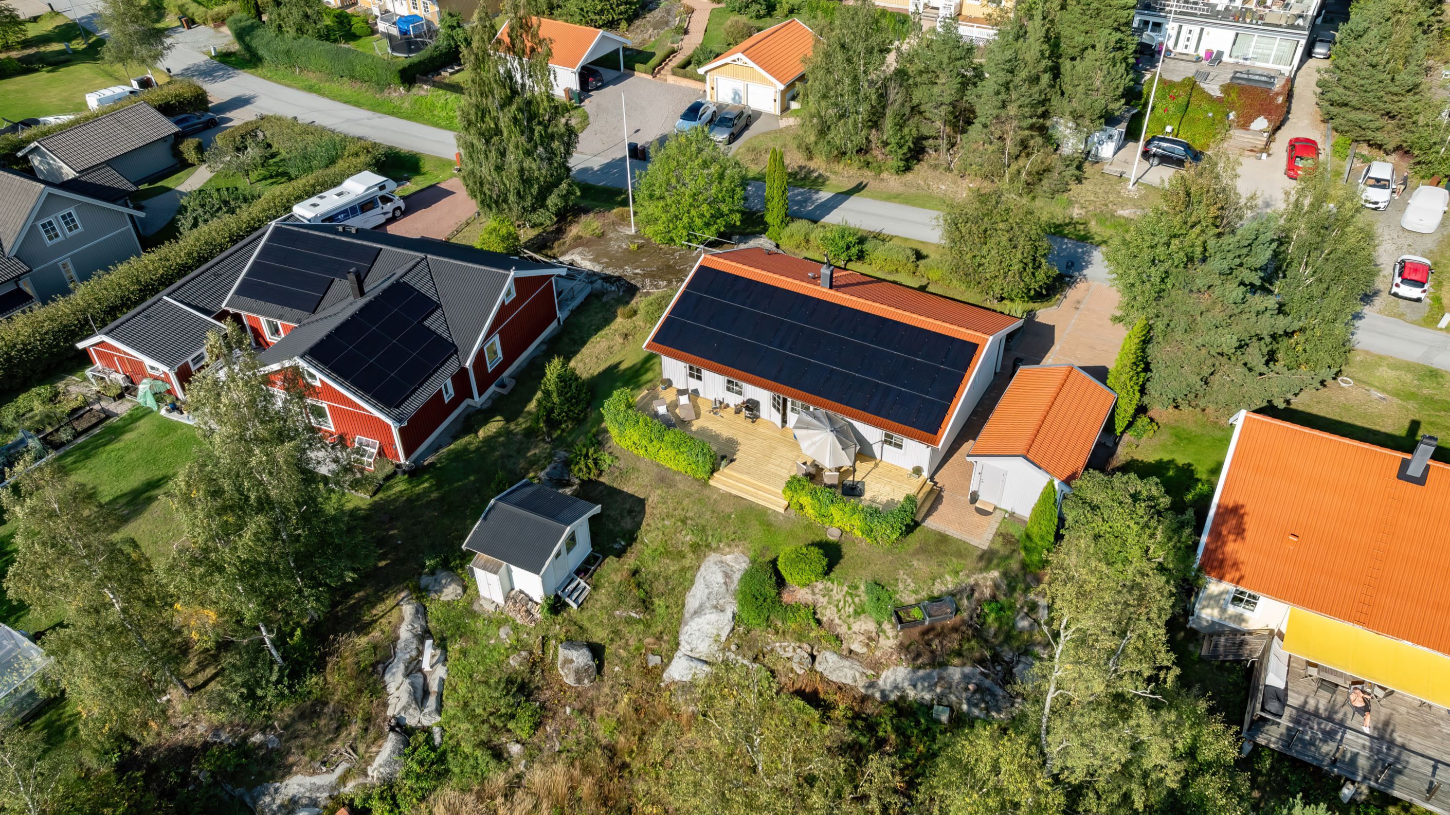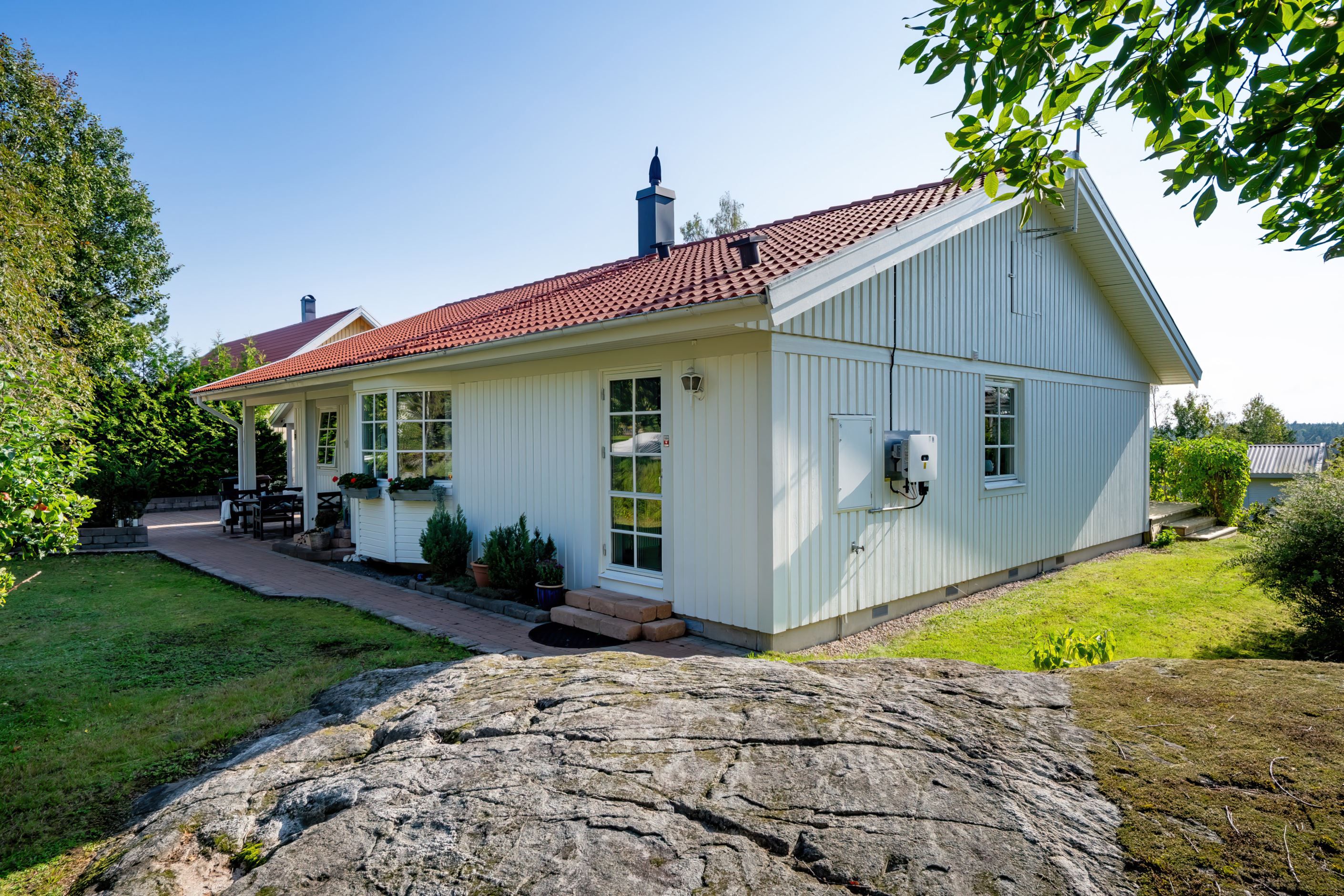 Här finns två badrum – ett nyrenoverat med dusch och ett med badkar – samt en nybyggd altan i soligt söderläge där du kan njuta av utsikten och härliga sommardagar. Hållbara energilösningar med solceller håller driftskostnaderna nere. På tomten finns även carport, stor uppfart och en fristående gäststuga som med fördel kan användas som kontor.