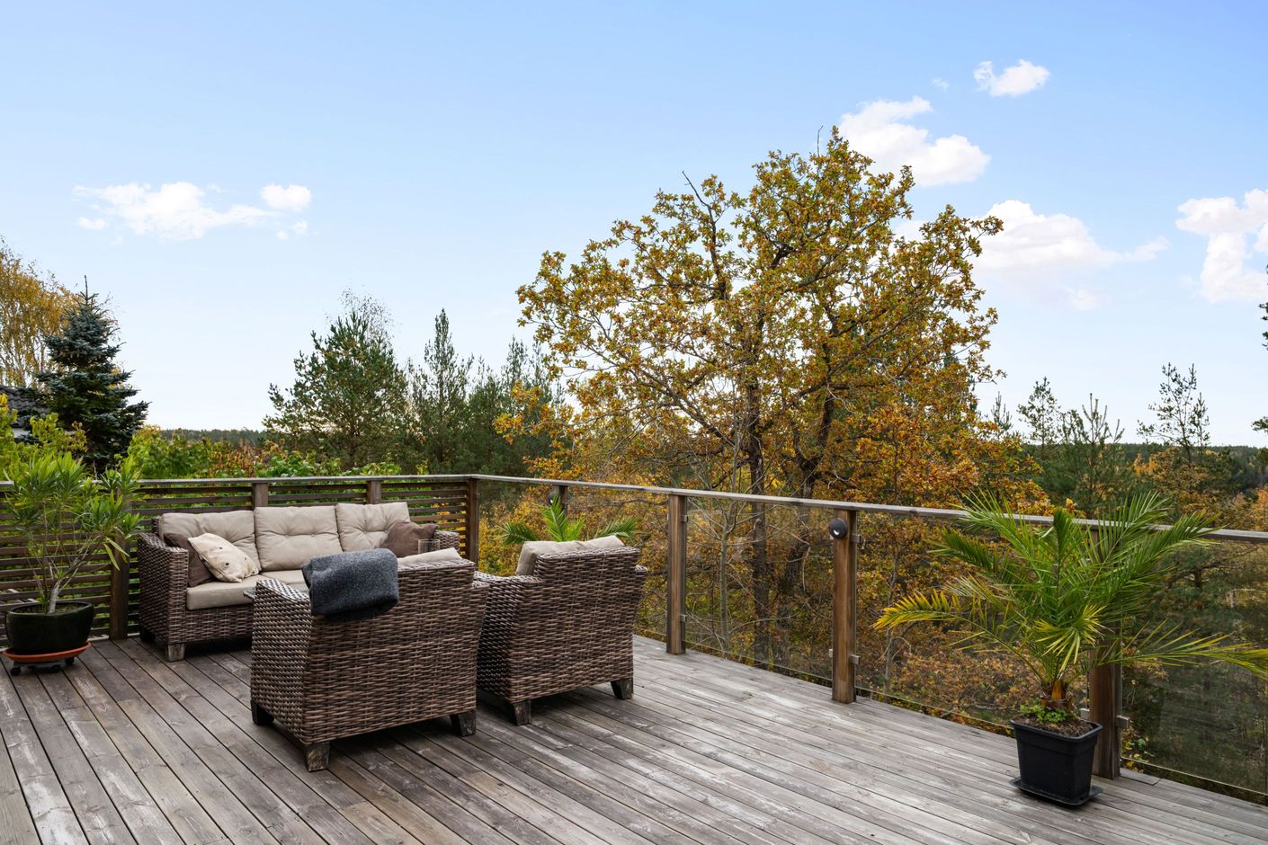 Redan i hallen möts du av en välkomnande känsla. Direkt till höger leder trappan till övervåningen och rakt fram öppnar huset upp mot det stora, ljusa vardagsrummet – ett härligt rum med plats för generös soffgrupp och stora fönsterpartier. Här finns även en braskamin som skapar både värme och mysfaktor under årets kallare månader. Från vardagsrummet når du den stora terrassen, utrustad med markis för skugga under soliga dagar.