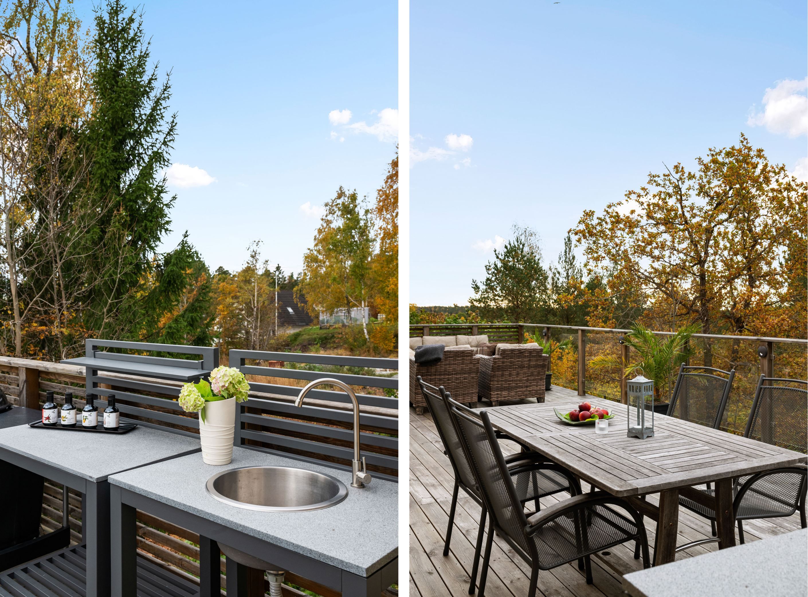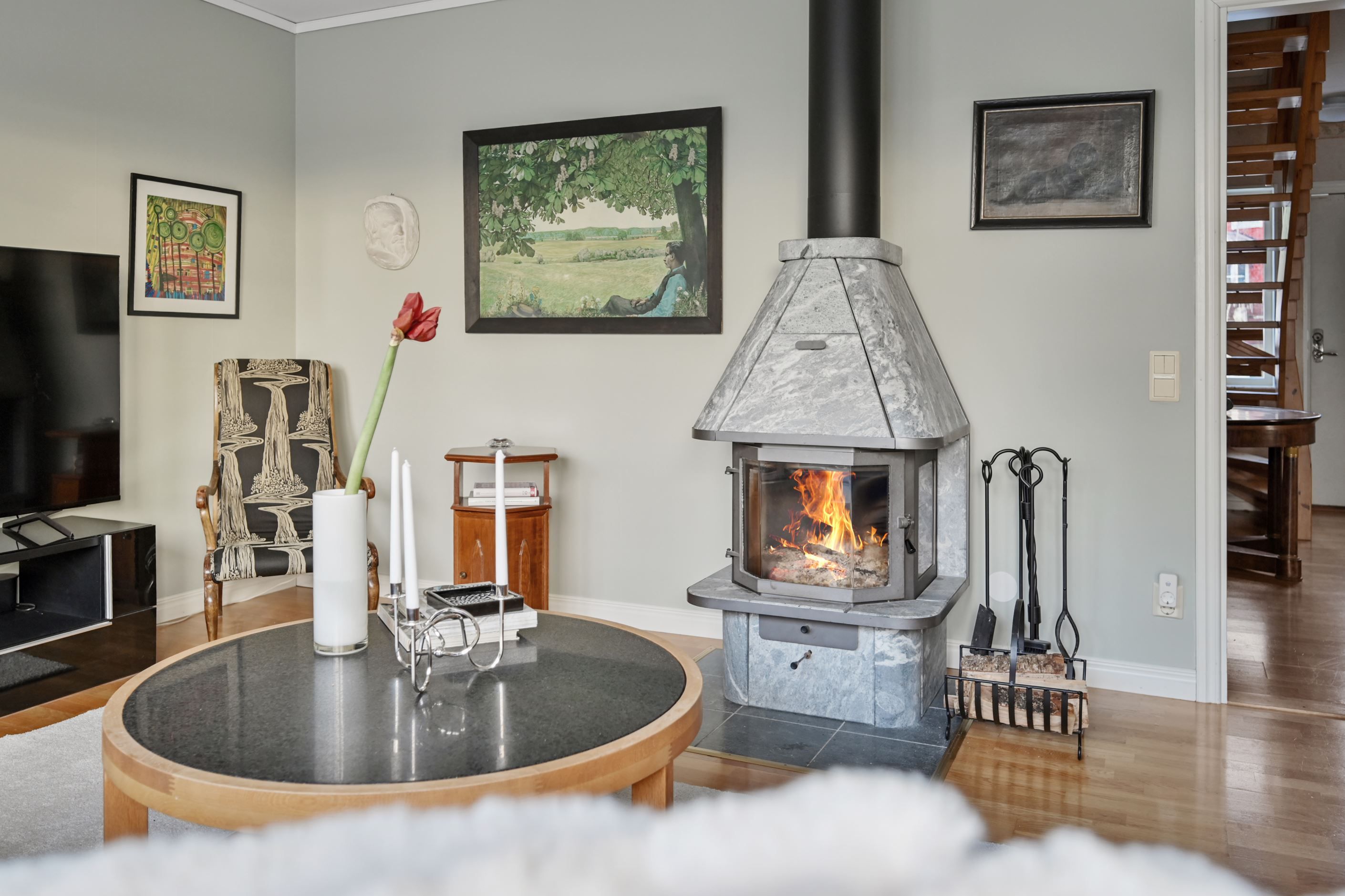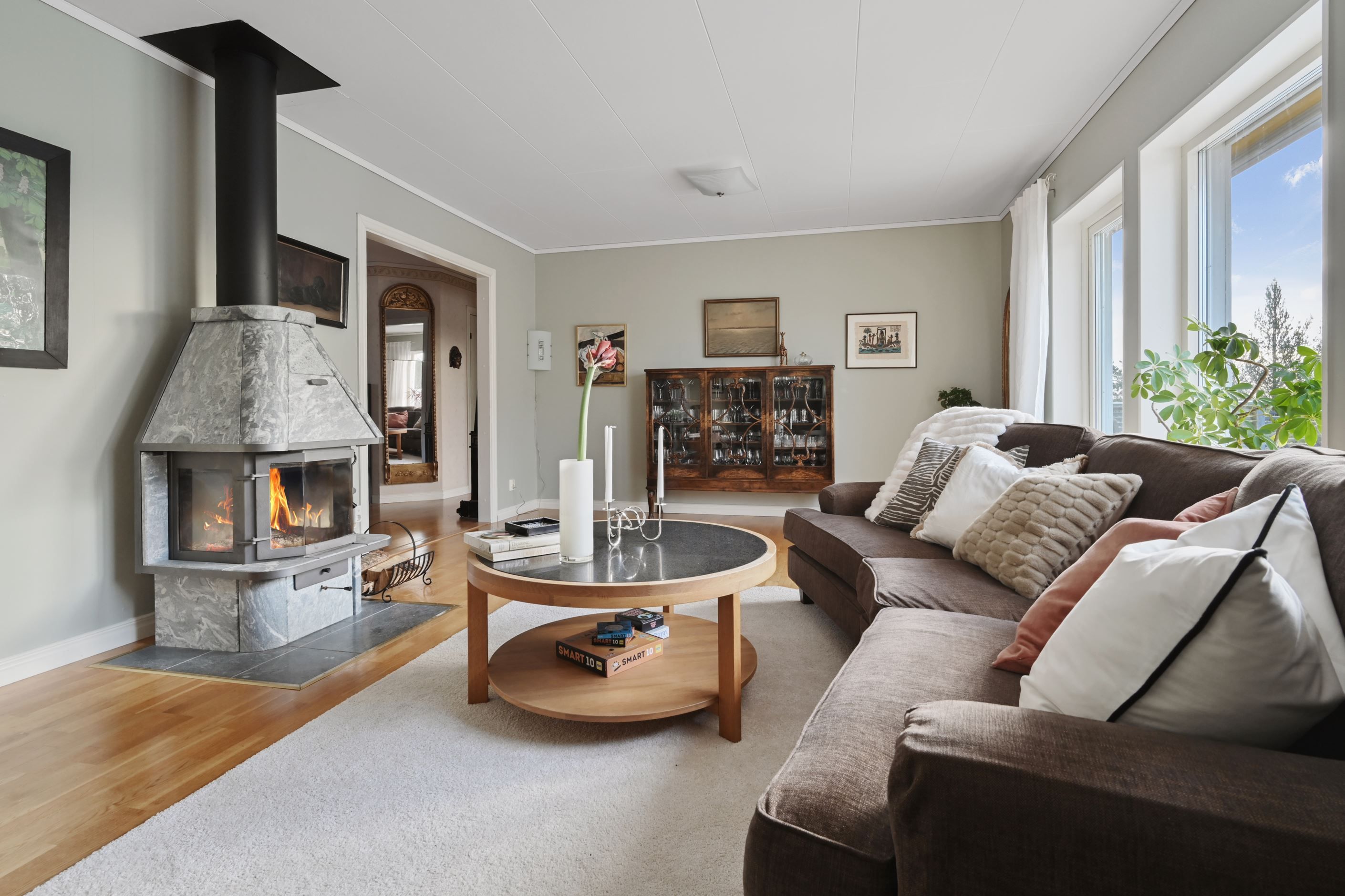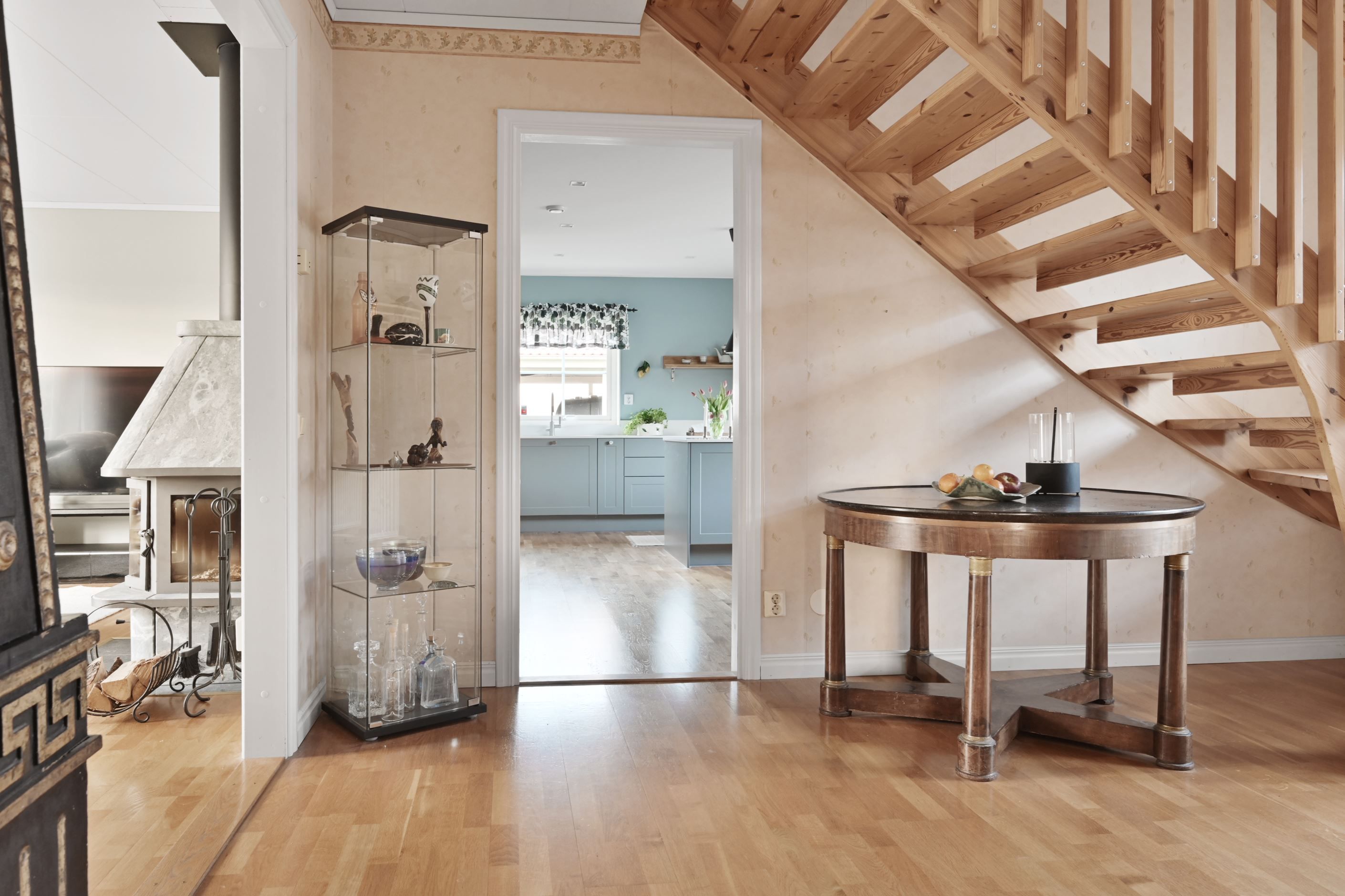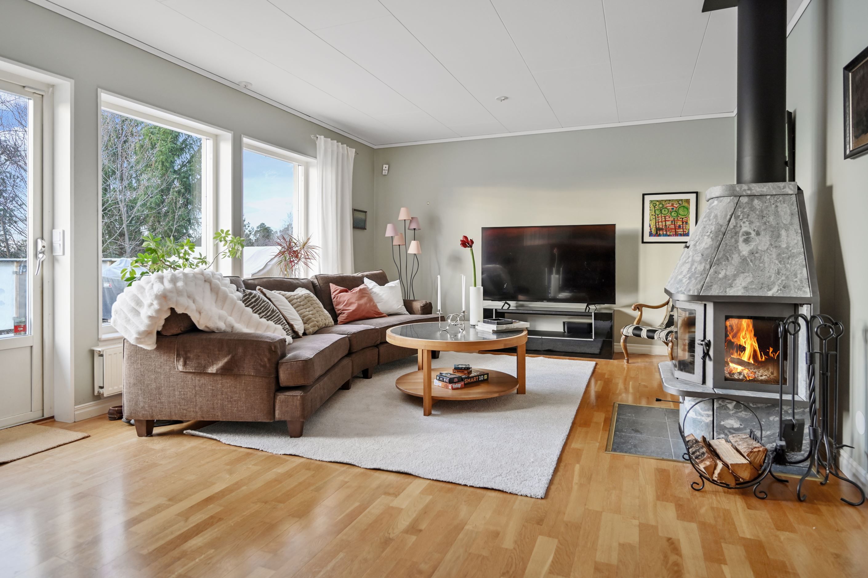 Redan i hallen möts du av en välkomnande känsla. Direkt till höger leder trappan till övervåningen och rakt fram öppnar huset upp mot det stora, ljusa vardagsrummet – ett härligt rum med plats för generös soffgrupp och stora fönsterpartier. Här finns även en braskamin som skapar både värme och mysfaktor under årets kallare månader. Från vardagsrummet når du den stora terrassen, utrustad med markis för skugga under soliga dagar.