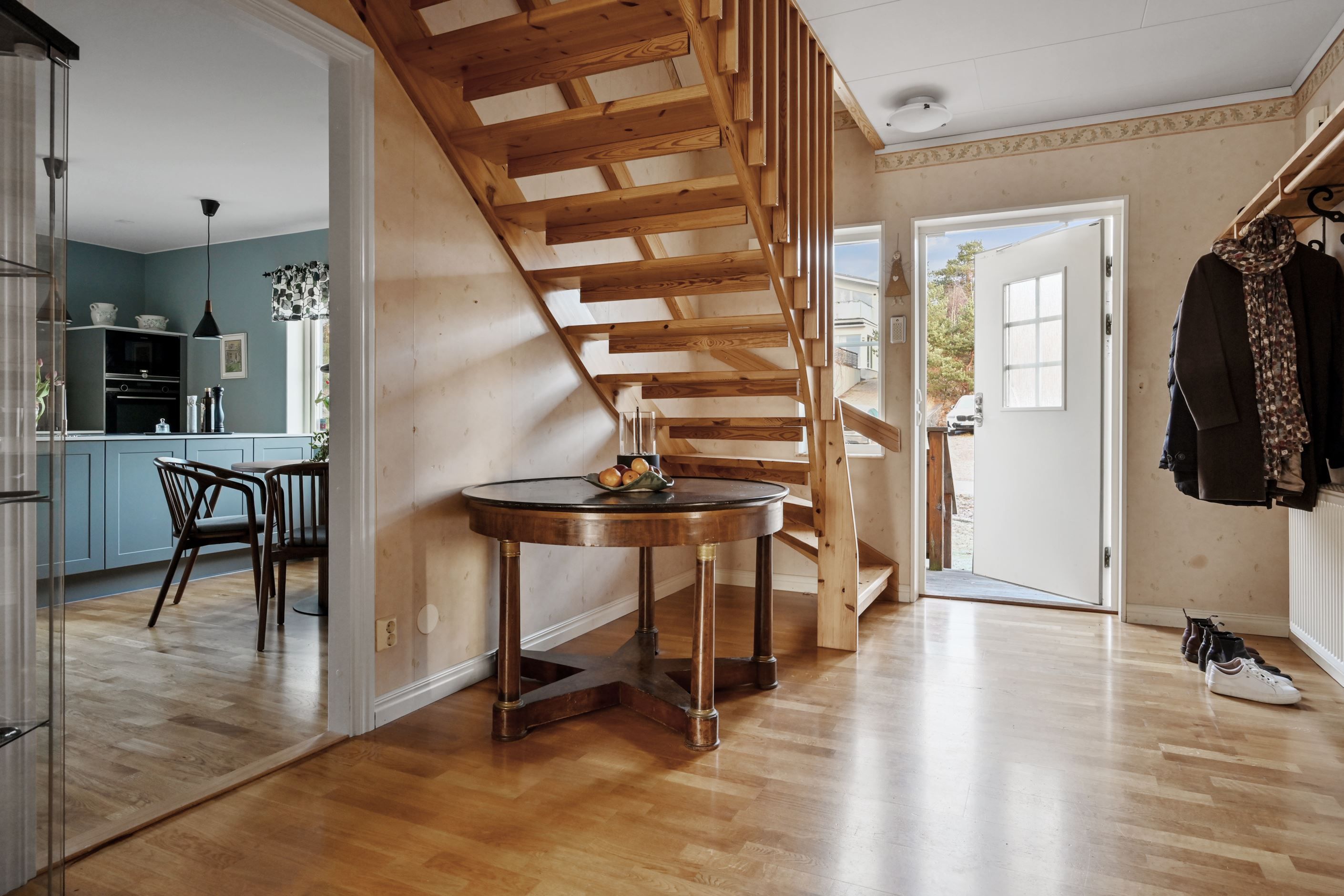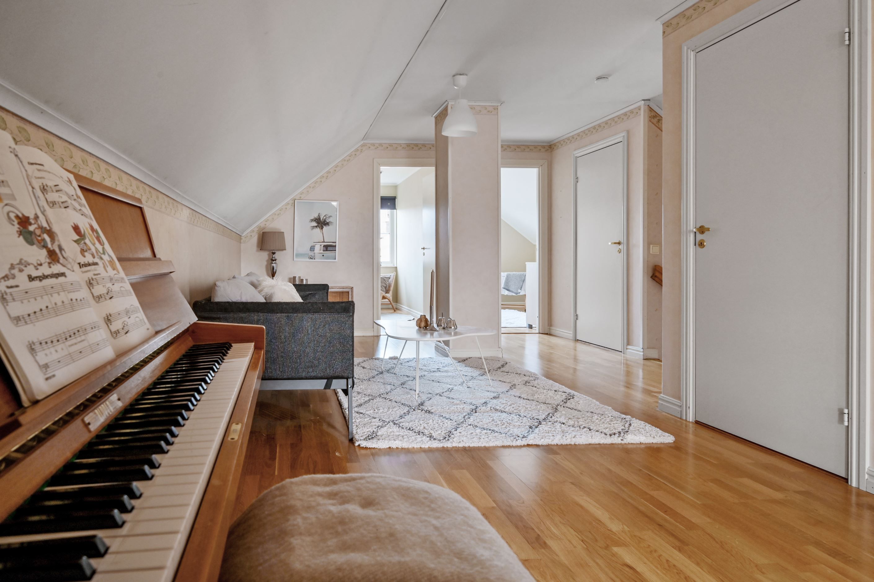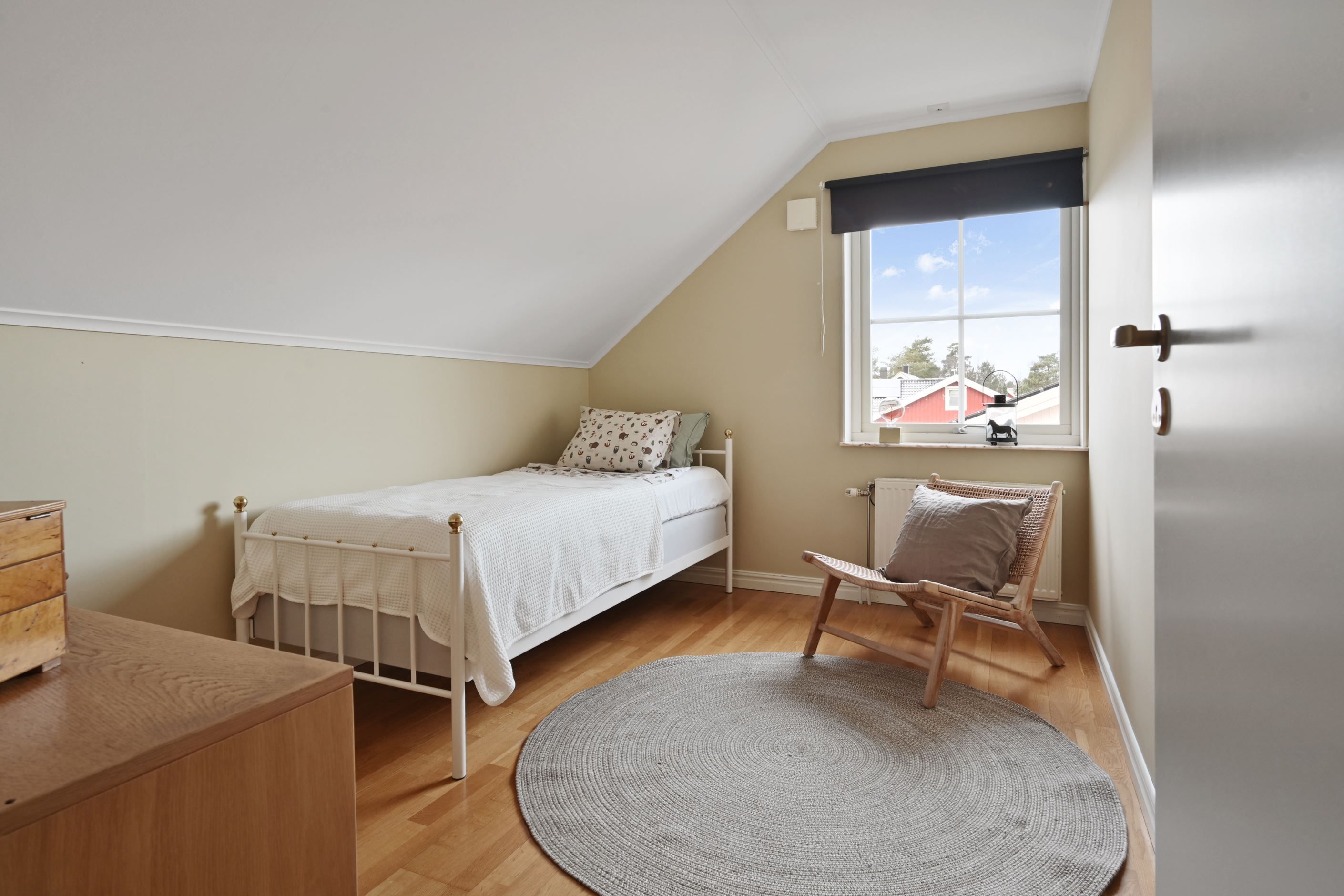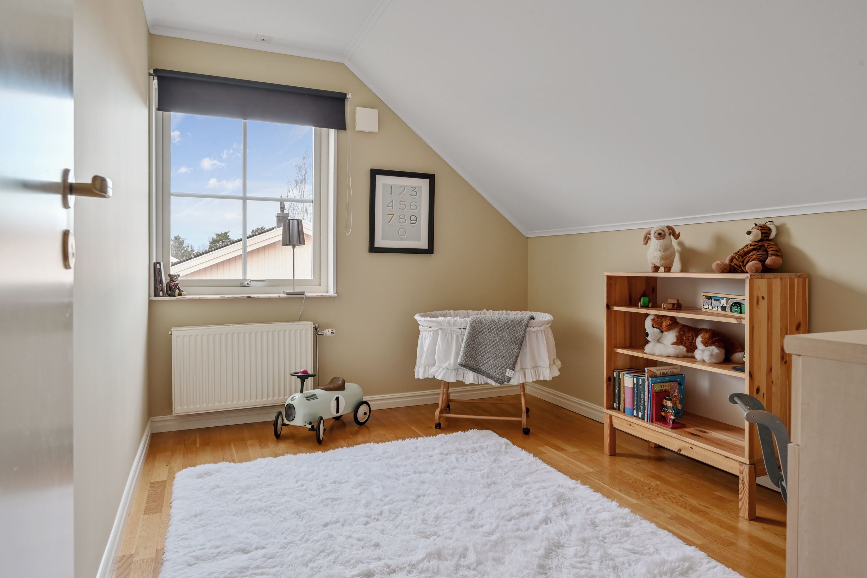 En trappa upp möts du av ett rymligt och möblerbart allrum – perfekt som tv-rum, lekyta eller arbetsplats. På övervåningen ytterligare tre sovrum, varav ett med klädkammare bakom spegelskjutdörrar. Övervåningen rymmer också ett andra badrum med duschhörna samt två praktiska förråd och en vindslucka som leder till ett spångförsett vindsutrymme för extra förvaring.