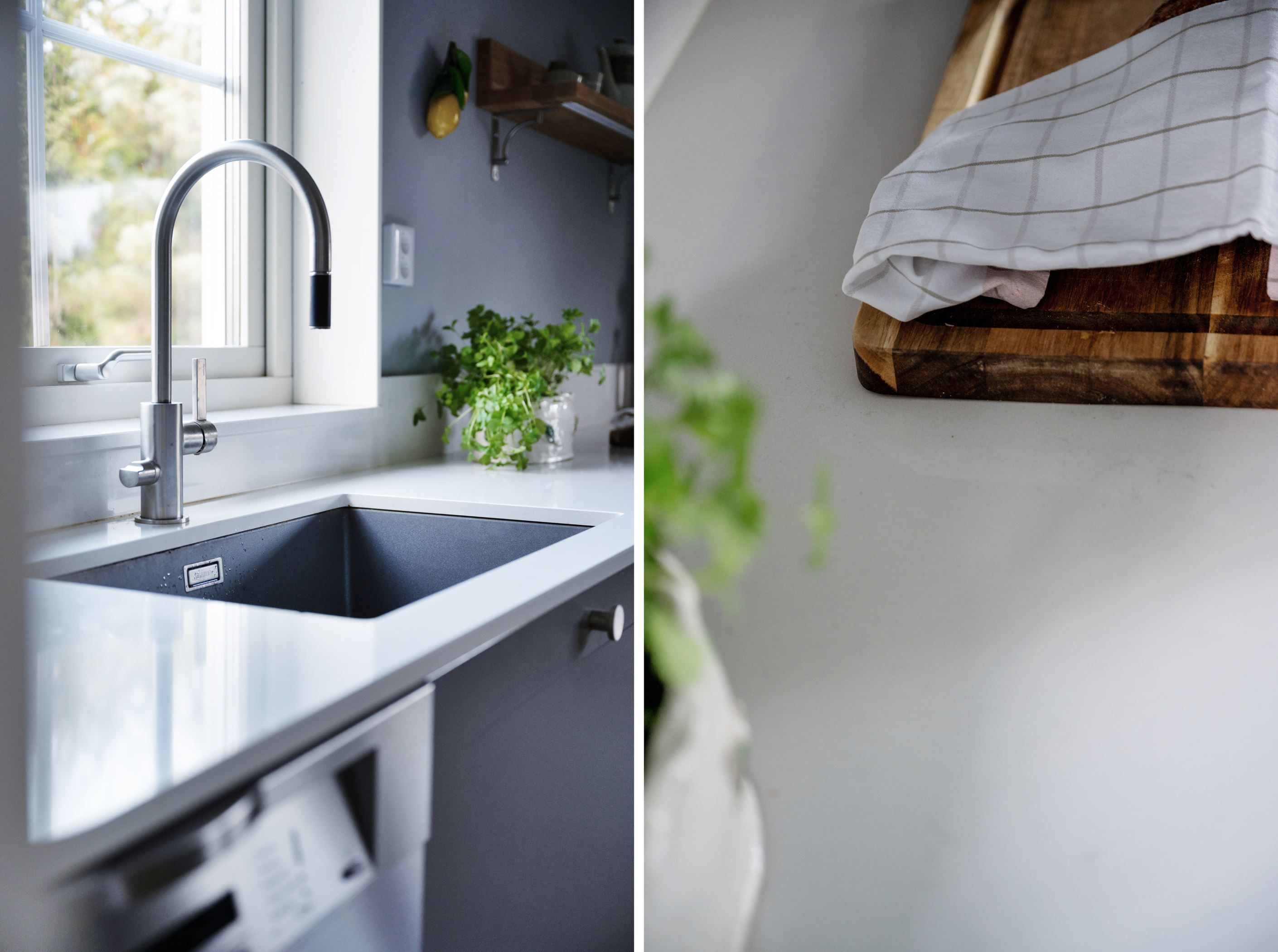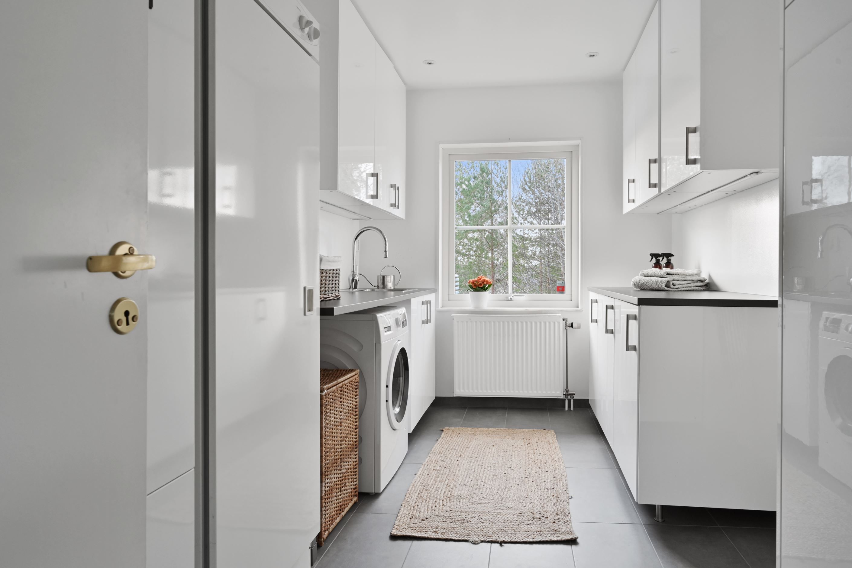 Via köket nås även den praktiska tvättstugan som är utrustad med tvättmaskin, torkskåp, tvättho, städskåp och arbetsbänk med förvaring.