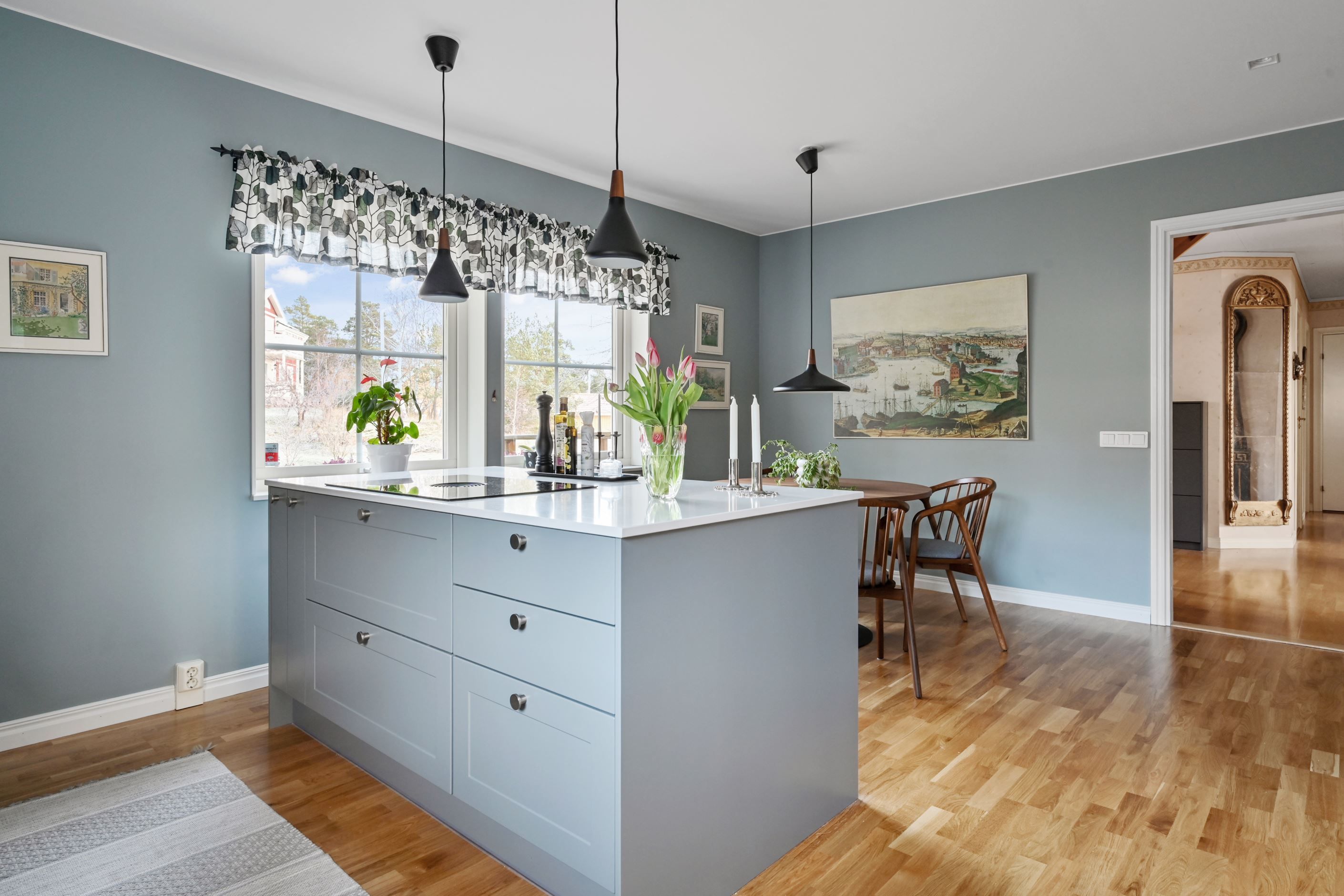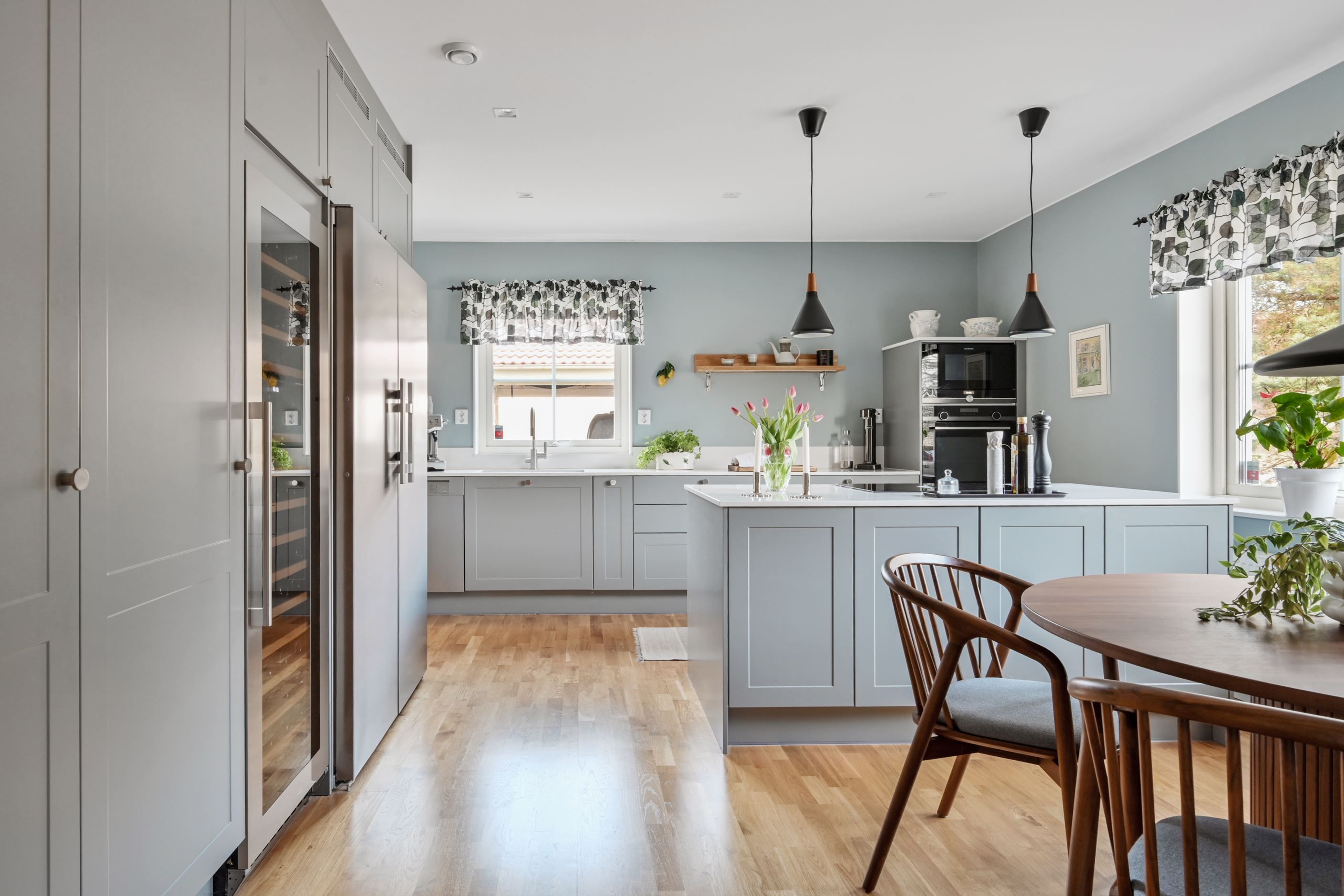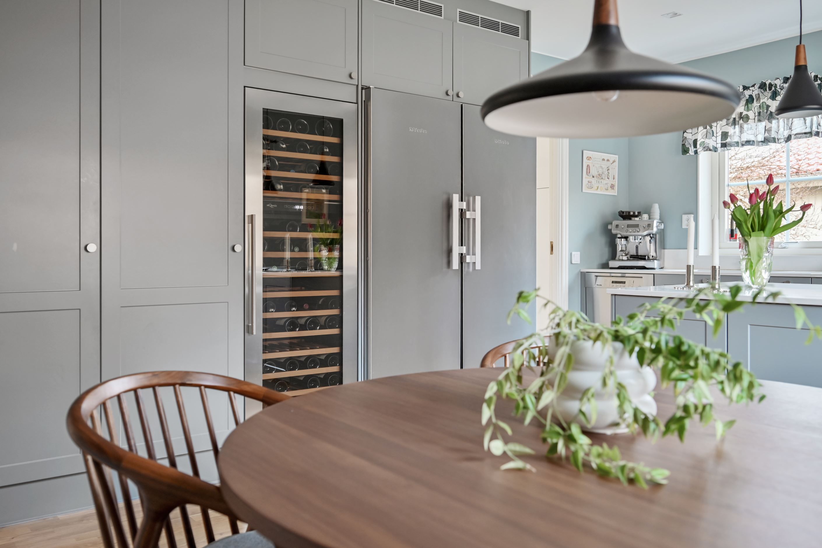 Köket, renoverat 2022, är genomtänkt i både funktion och stil. Här finns god förvaring, stor köksö med induktionshäll, integrerade vitvaror, fullstor kyl och frys, vinkyl samt ugn, mikro och diskmaskin. I anslutning till köket ligger matplatsen.
