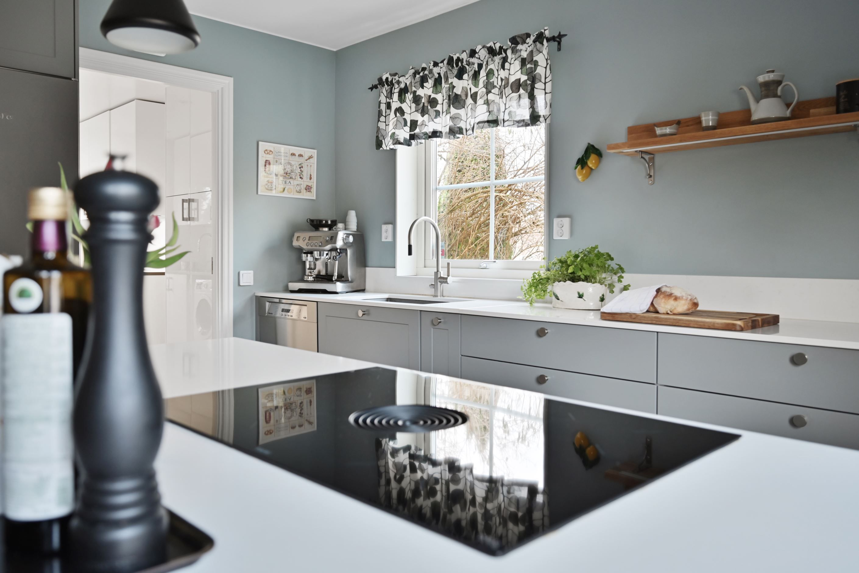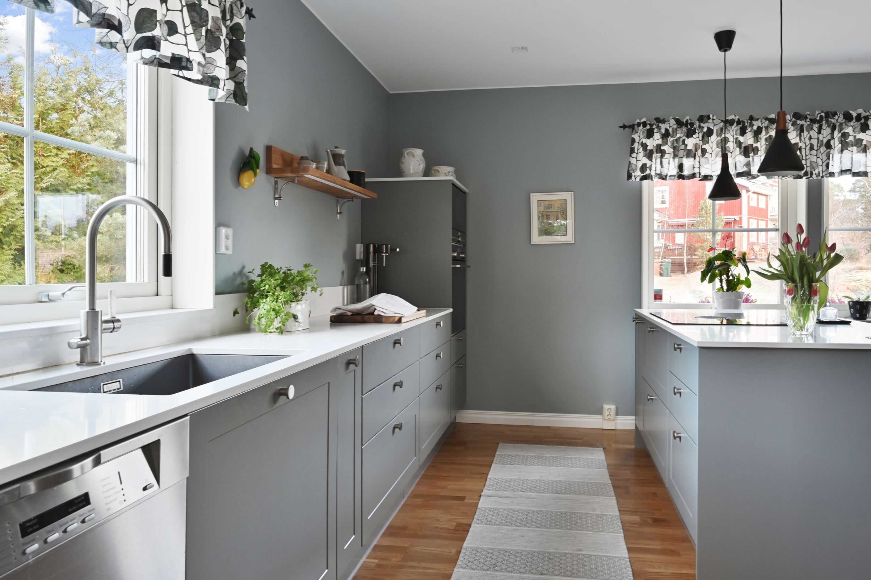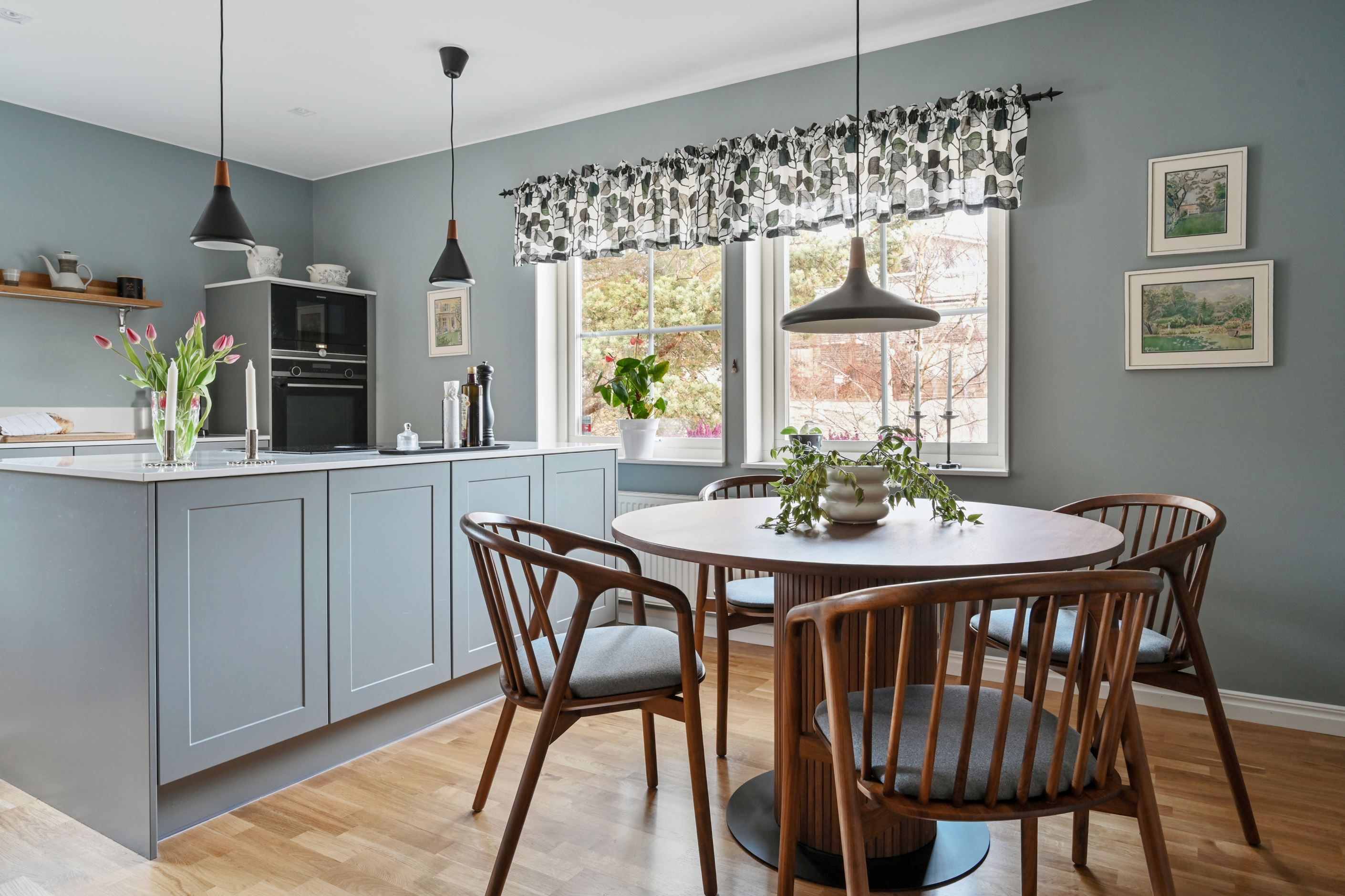 Köket, renoverat 2022, är genomtänkt i både funktion och stil. Här finns god förvaring, stor köksö med induktionshäll, integrerade vitvaror, fullstor kyl och frys, vinkyl samt ugn, mikro och diskmaskin. I anslutning till köket ligger matplatsen.