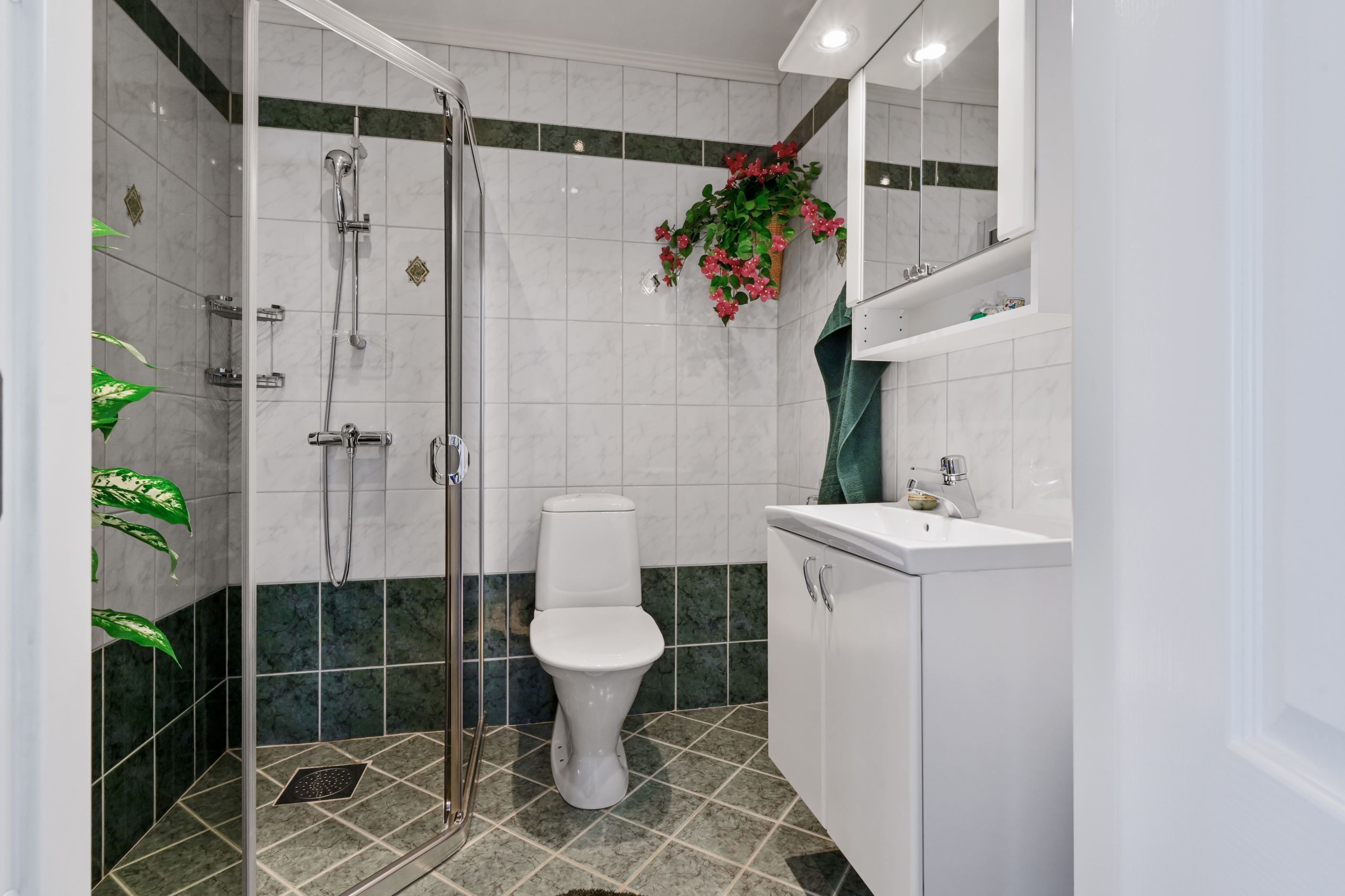 I anslutning till vardagsrummet ligger ett av bostadens badrum, utrustat med duschhörna, wc, handfat med kommod samt spegelskåp med förvaring och belysning. Badrummet har elgolvvärme som bidrar till komforten.