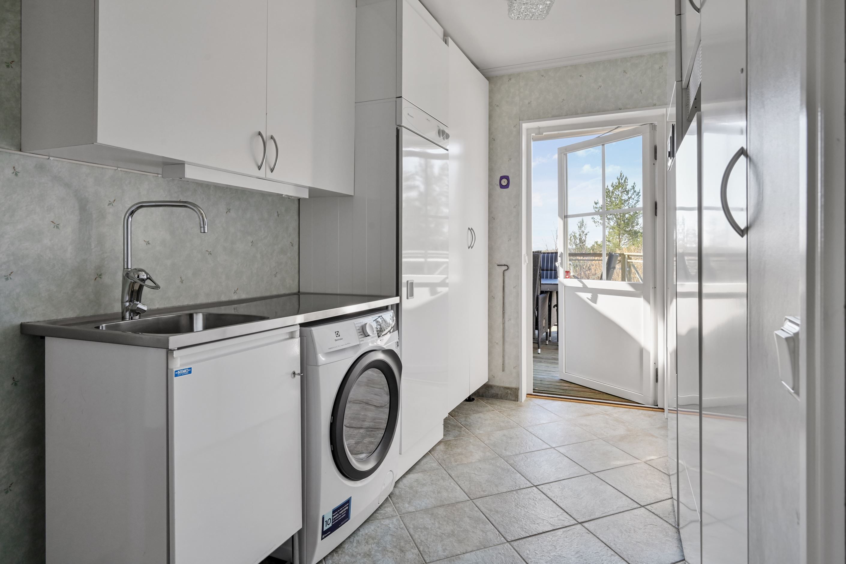 Ytterligare ett sovrum om cirka 14 kvm finns i bostaden, vilket ger flexibilitet för familj, gäster eller arbetsrum. Tvättstugan är praktiskt utformad med tvättmaskin, tvättställ, torkskåp och goda förvaringsmöjligheter. Även här finns klinkergolv och en egen utgång till terrassen.