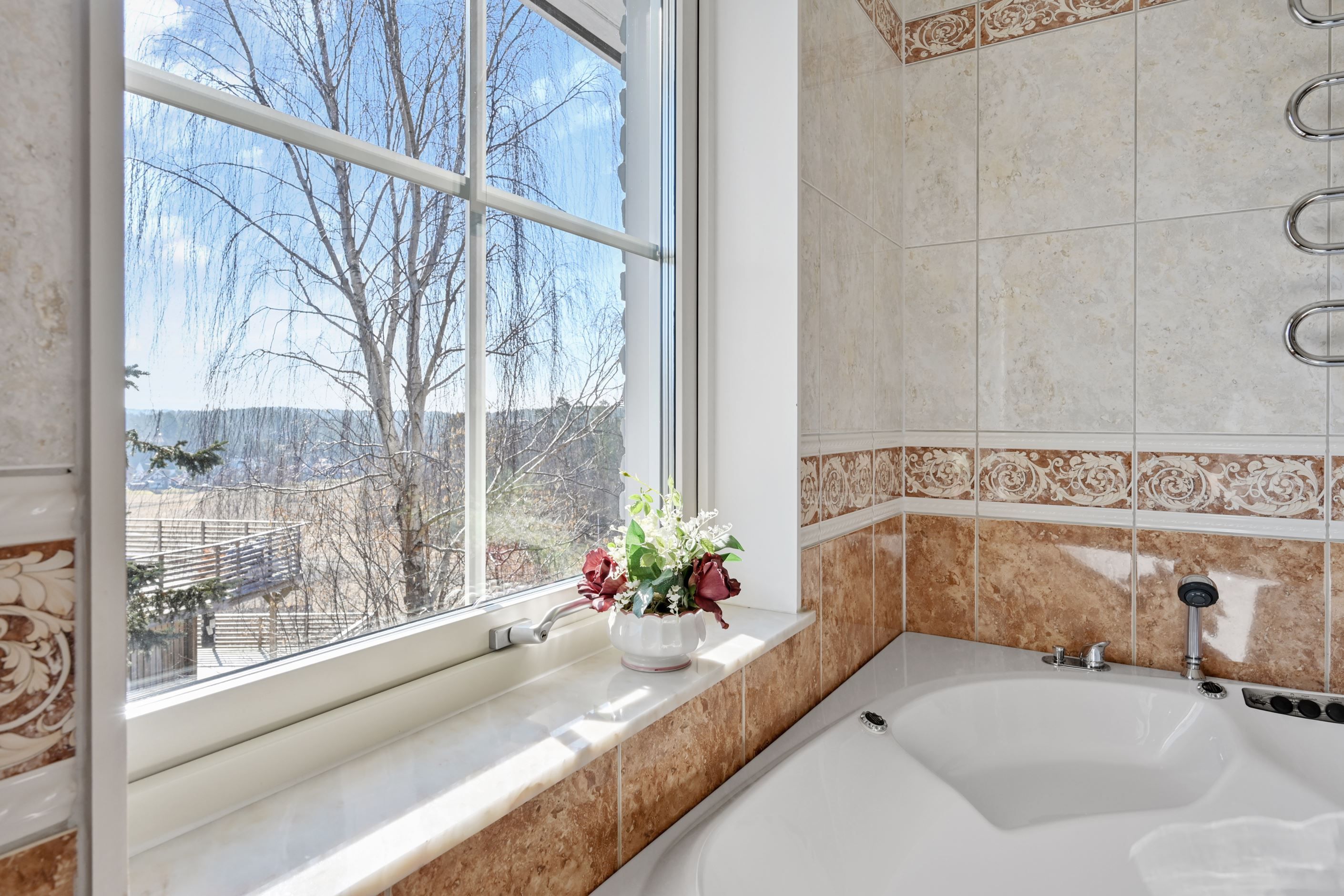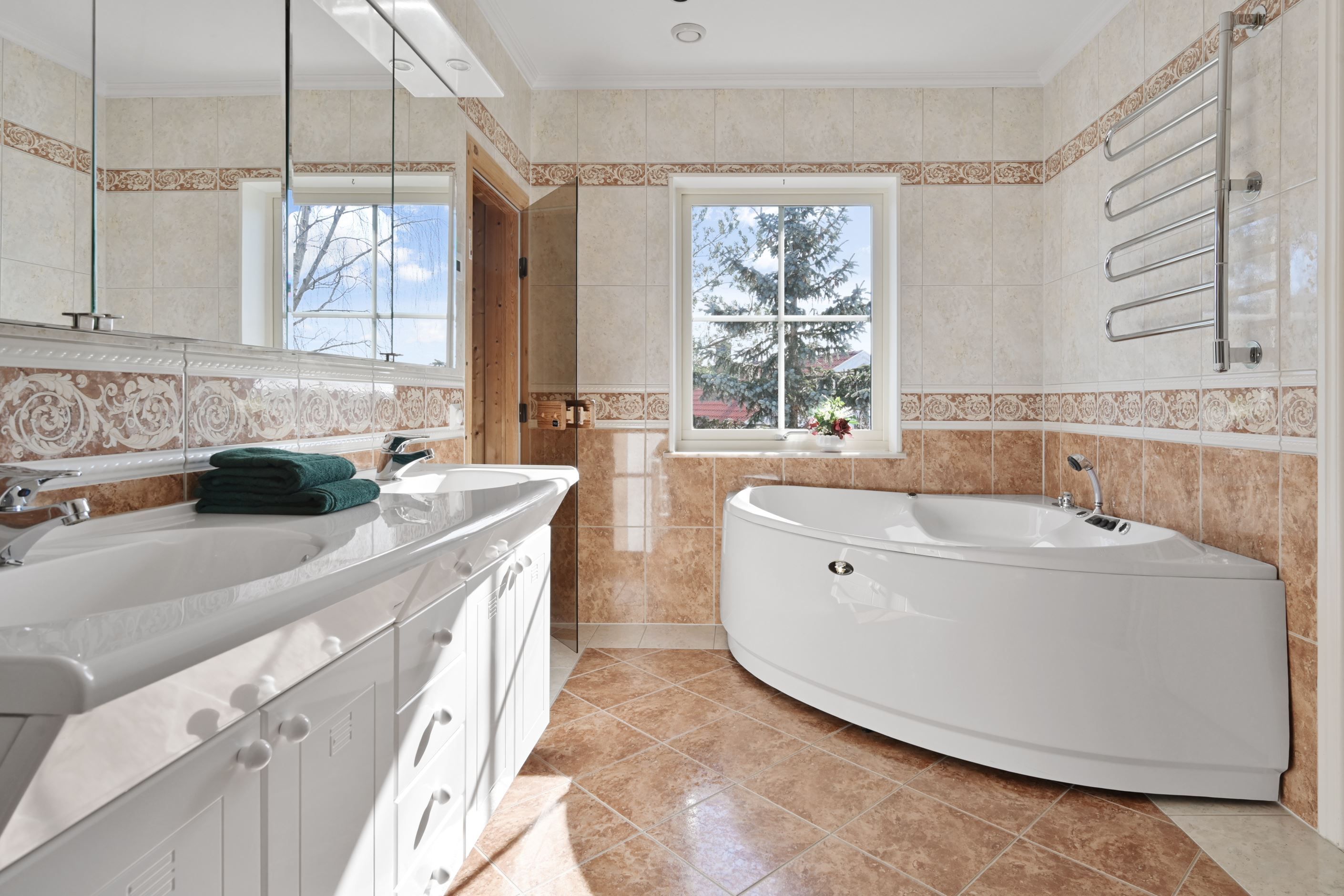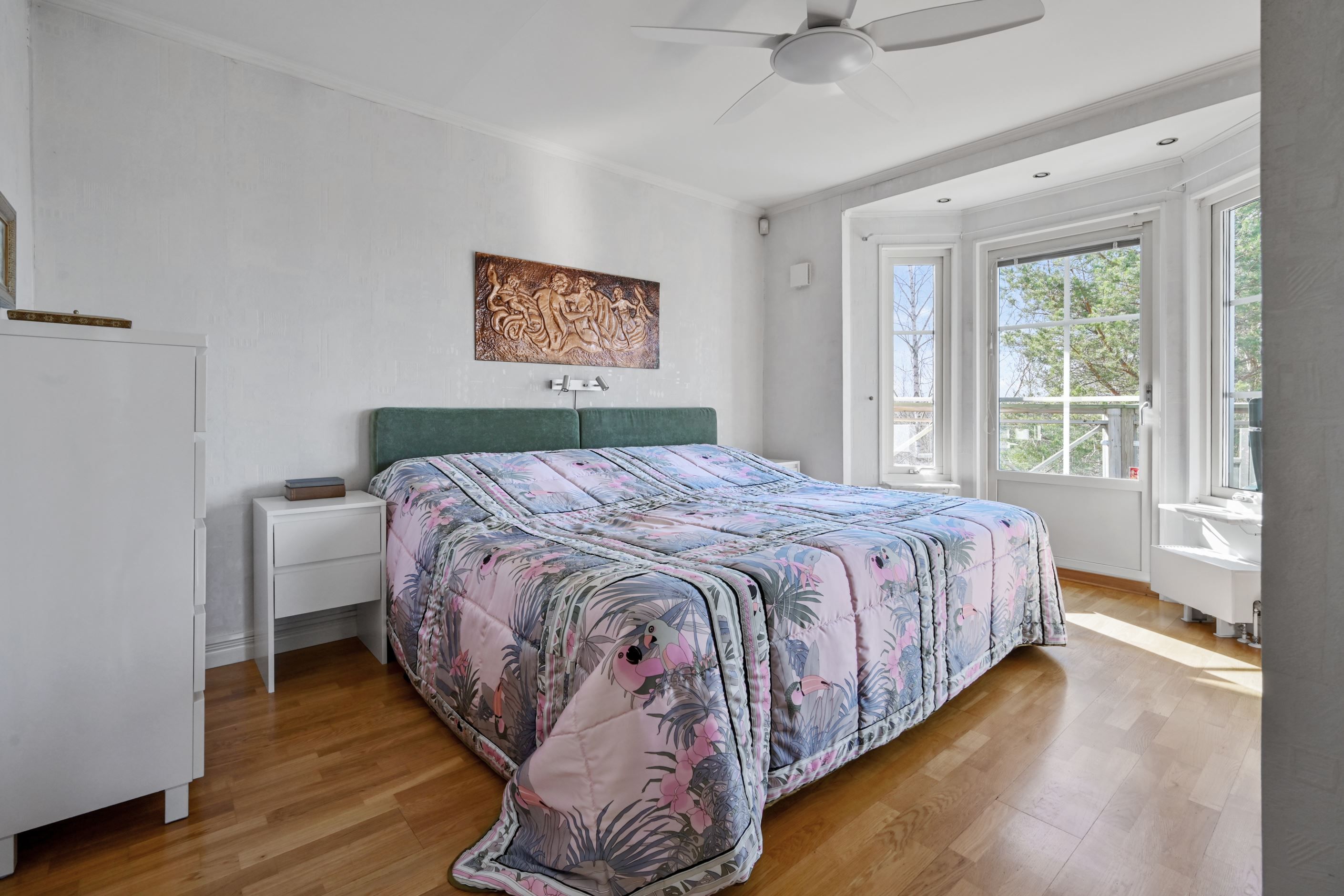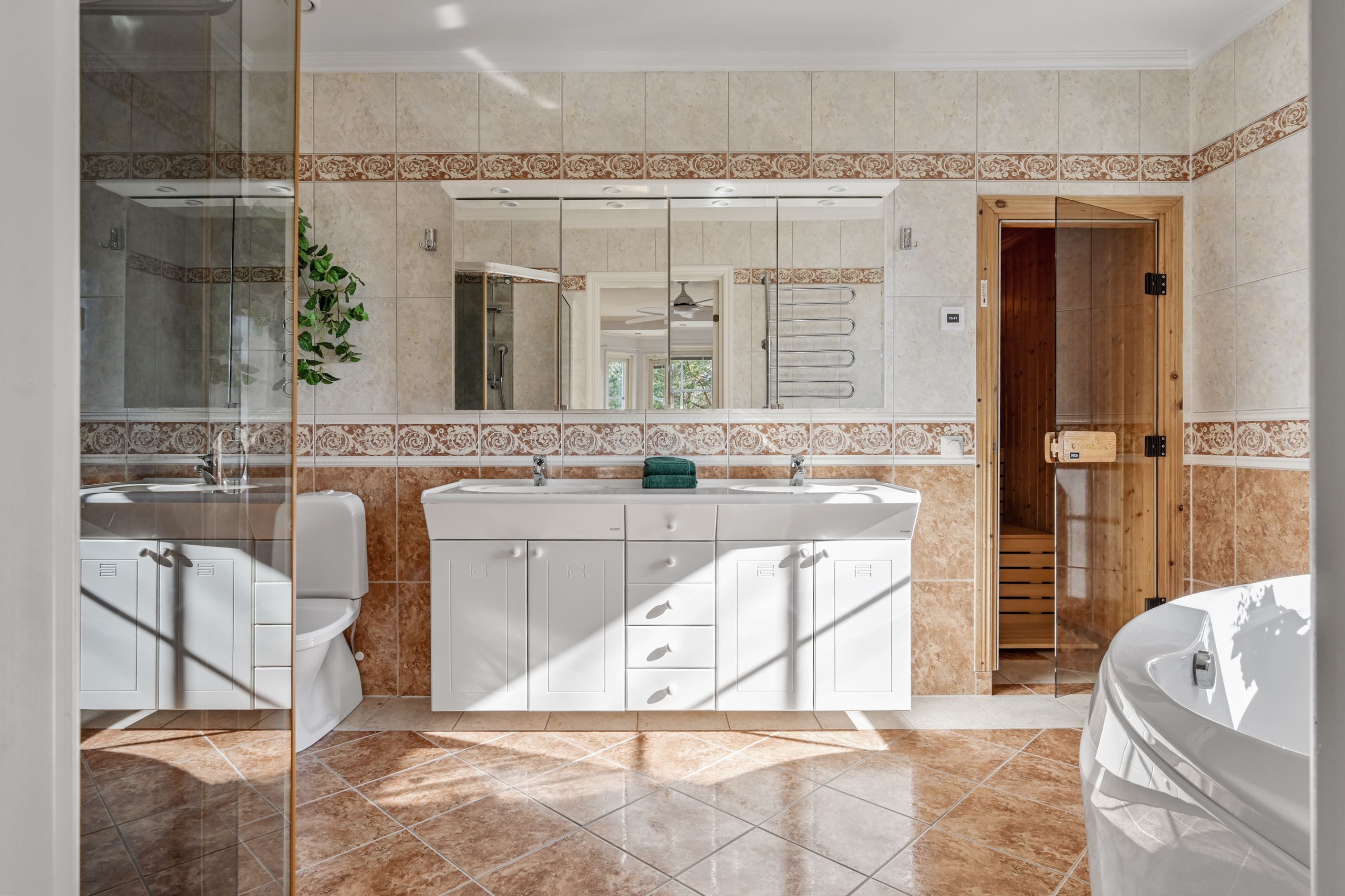 Master bedroom - med ingång från vardagsrummet - om cirka 15 kvm är rofyllt beläget och erbjuder god förvaring i garderober med spegelskjutdörrar. Här finns direkt access till det andra, mer generösa badrummet som är utrustat med dubbelhandfat, spegelskåp, duschhörna, wc, jacuzzi samt bastu – en privat och avkopplande del av hemmet. Även här finns fönster som släpper in naturligt ljus samt elgolvvärme.